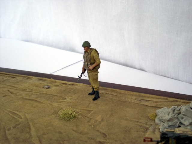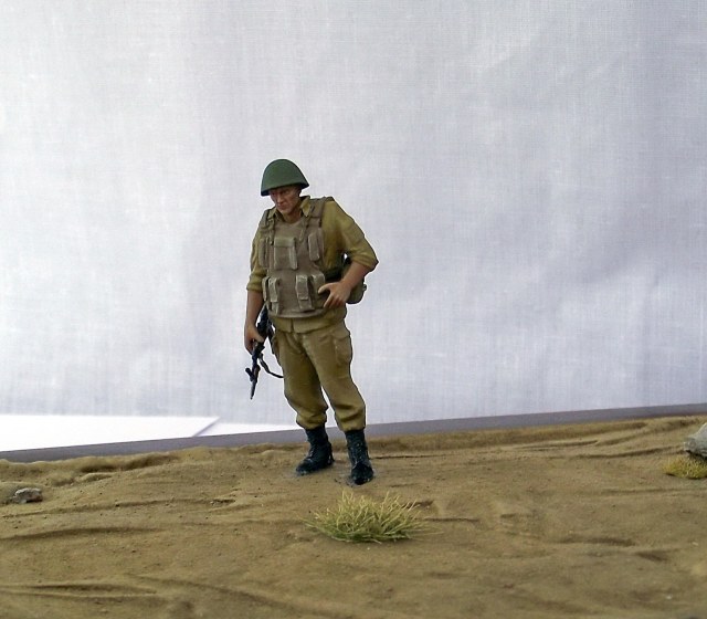 Стоящий часовой - конверсия фигурки фирмы ТАNK, бронежилет 6Б5 переделан в 6Б3, более характерный для ОКСВ, руки из набора ICM, голова от Армор35.