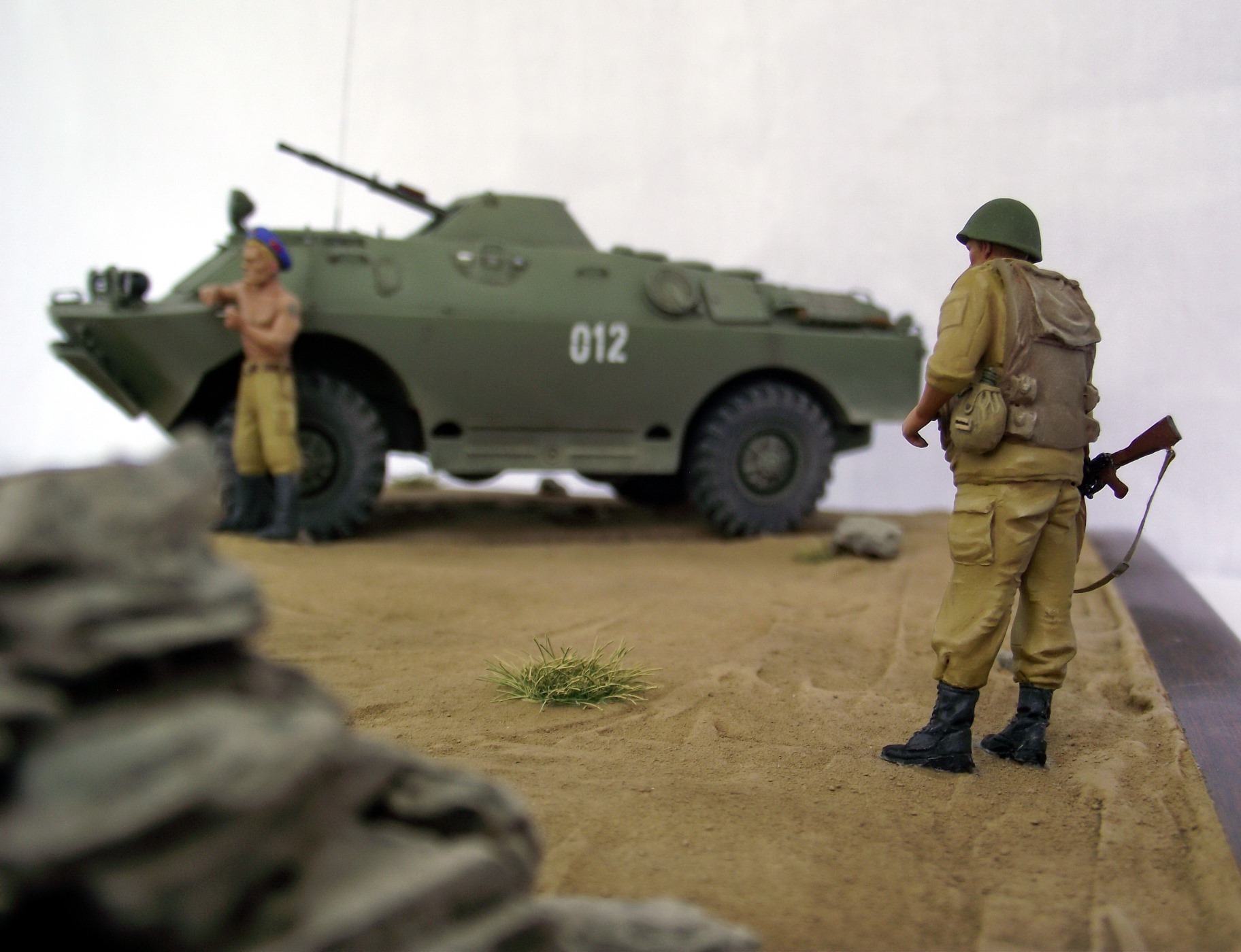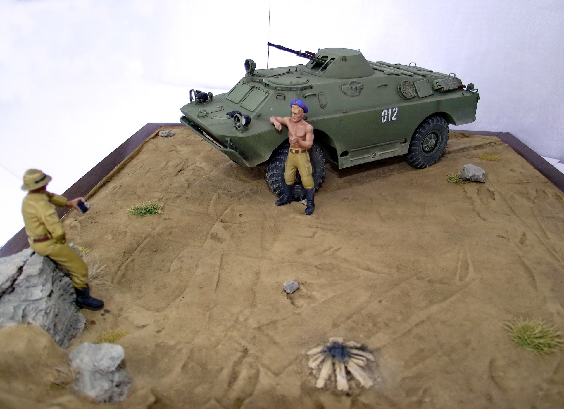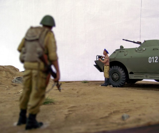 Мне понравилась работа. Работа удалась. Но есть вопросы и первый, нет следов персонажей на песке, на БРДМе не пылинки,как "сновья", а это Афган, дорог нет, направления и горы.
