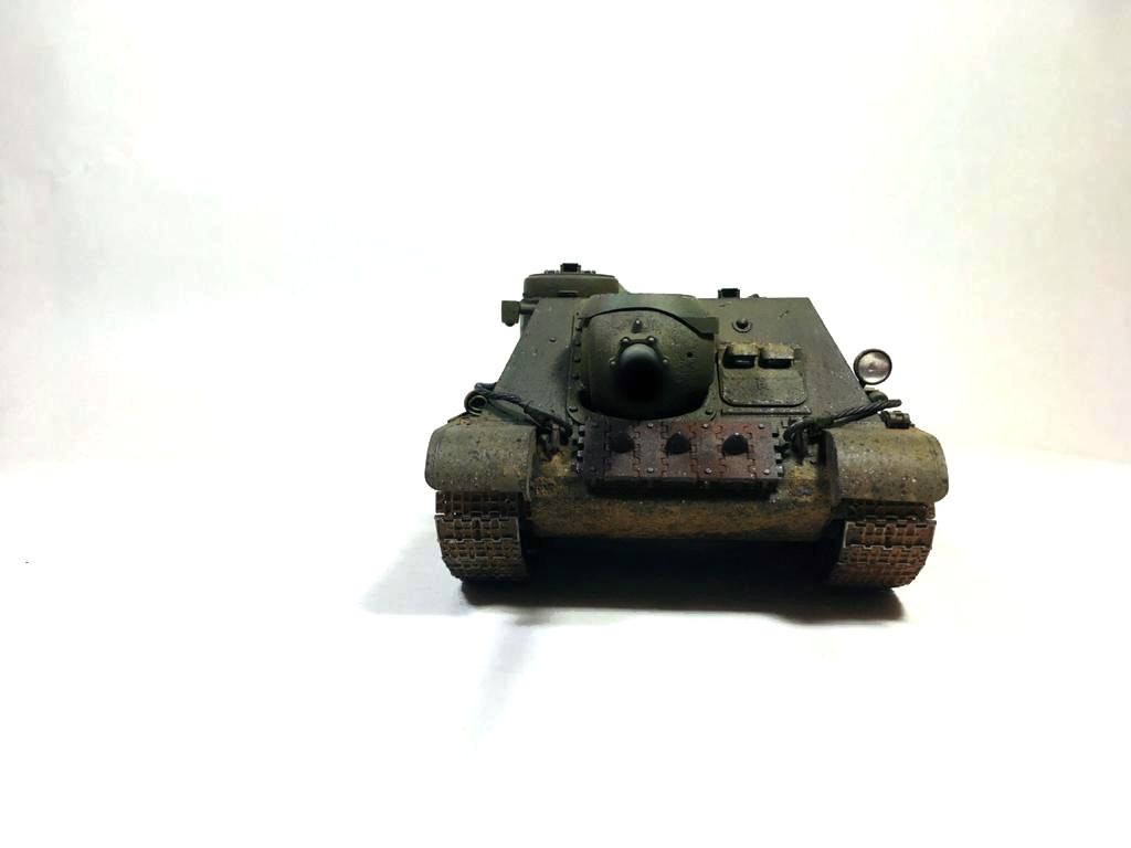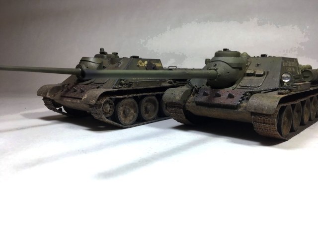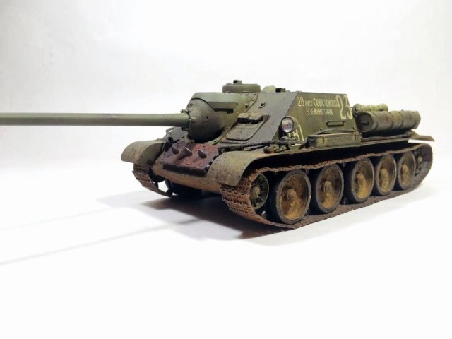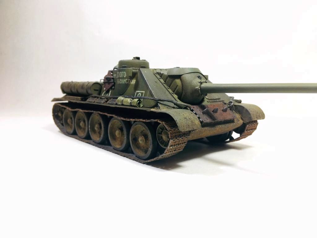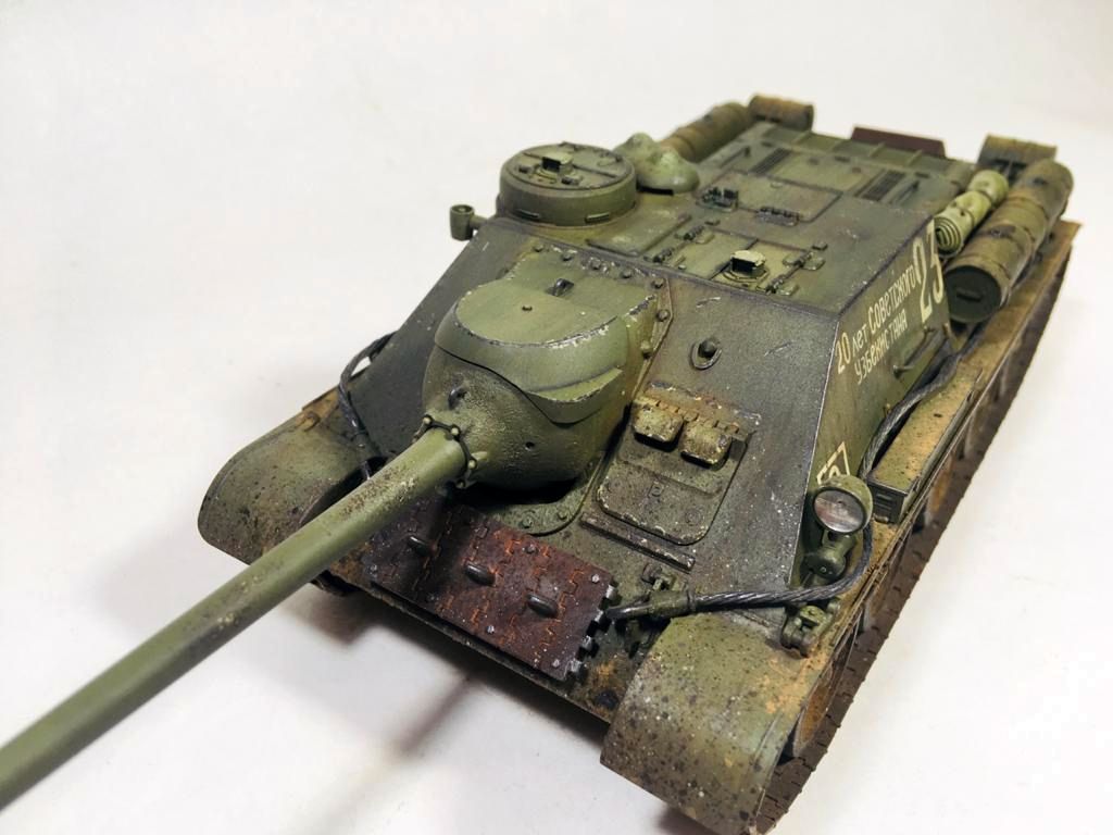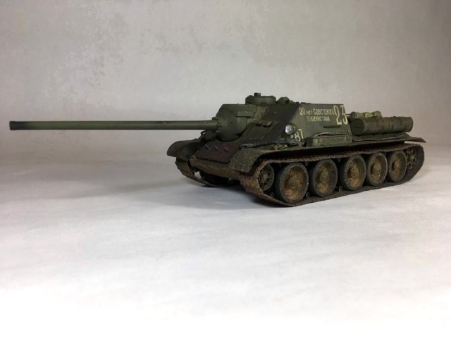 Здравствуйте уважаемые моделисты. Хочу представить вам свою модель су-100.Модель собиралась из коробки.Сборка проблем не вызвала.Заменил траки на миниарт, фару на эльф, добавил фактуру брони на маску орудия, скатку. Красил красками mr hobby и tamiya. После покраски нанес смывку и масляные точки. Далее погодные эффекты с помощью химии ammo mig и zip maket.Попробовал изобразить сколы. Печку оставил т к по задумке поздняя осень. В матчасть не лез-основной задачей было аккуратно собрать,покрасить,нанести эффекты.Хотелось бы услышать от вас советы и замечания по модели.