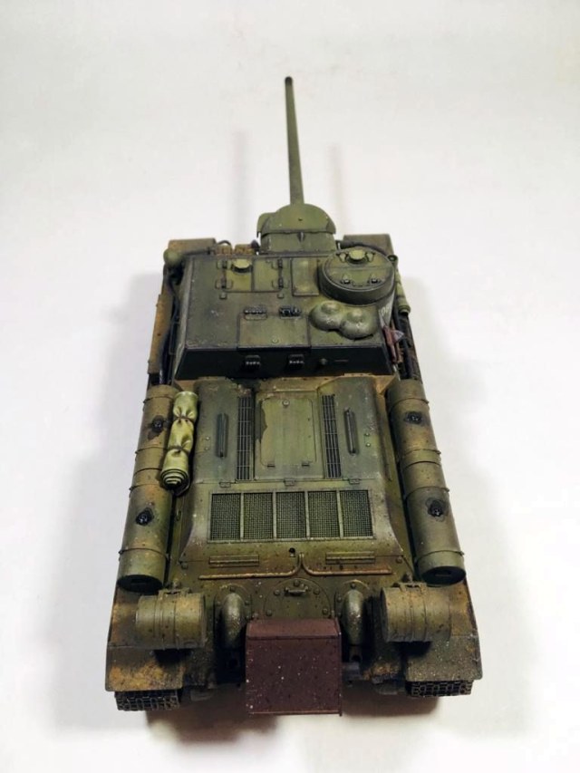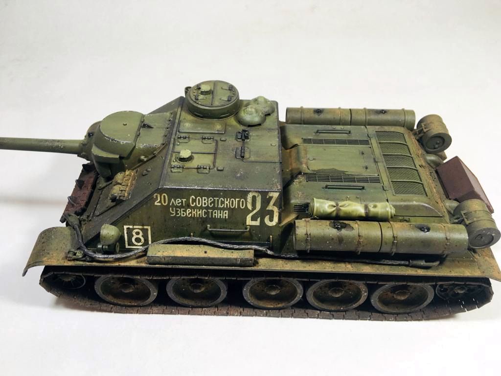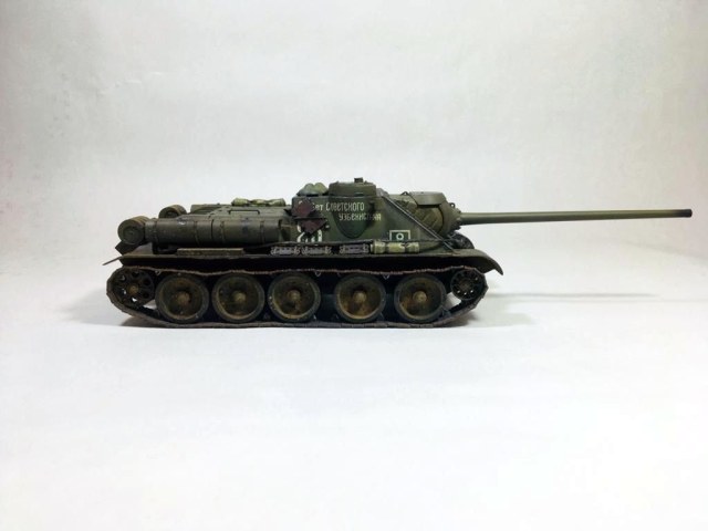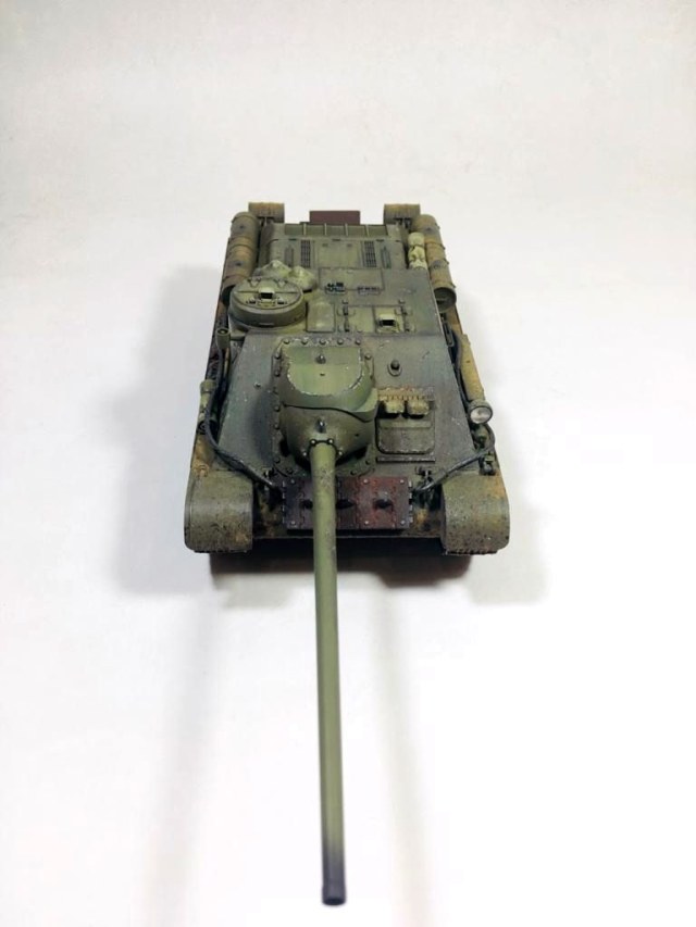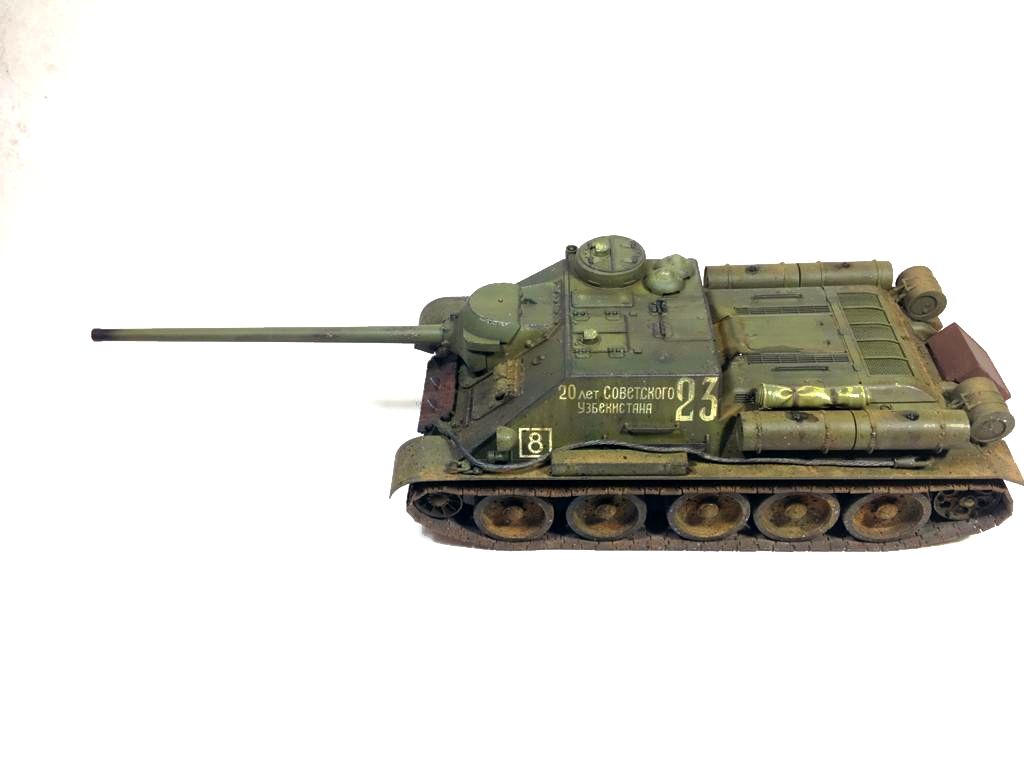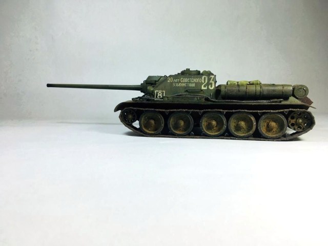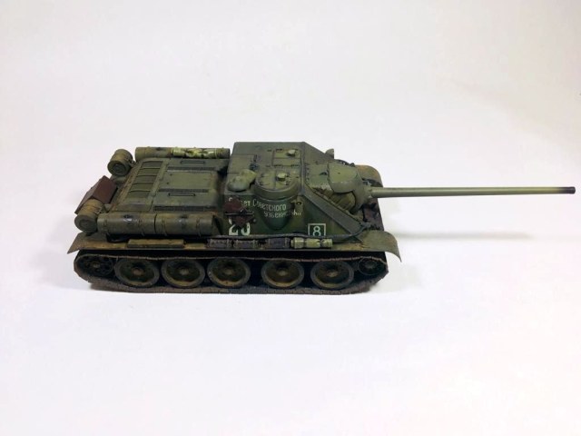 Здравствуйте уважаемые моделисты. Хочу представить вам свою модель су-100.Модель собиралась из коробки.Сборка проблем не вызвала.Заменил траки на миниарт, фару на эльф, добавил фактуру брони на маску орудия, скатку. Красил красками mr hobby и tamiya. После покраски нанес смывку и масляные точки. Далее погодные эффекты с помощью химии ammo mig и zip maket.Попробовал изобразить сколы. Печку оставил т к по задумке поздняя осень. В матчасть не лез-основной задачей было аккуратно собрать,покрасить,нанести эффекты.Хотелось бы услышать от вас советы и замечания по модели.