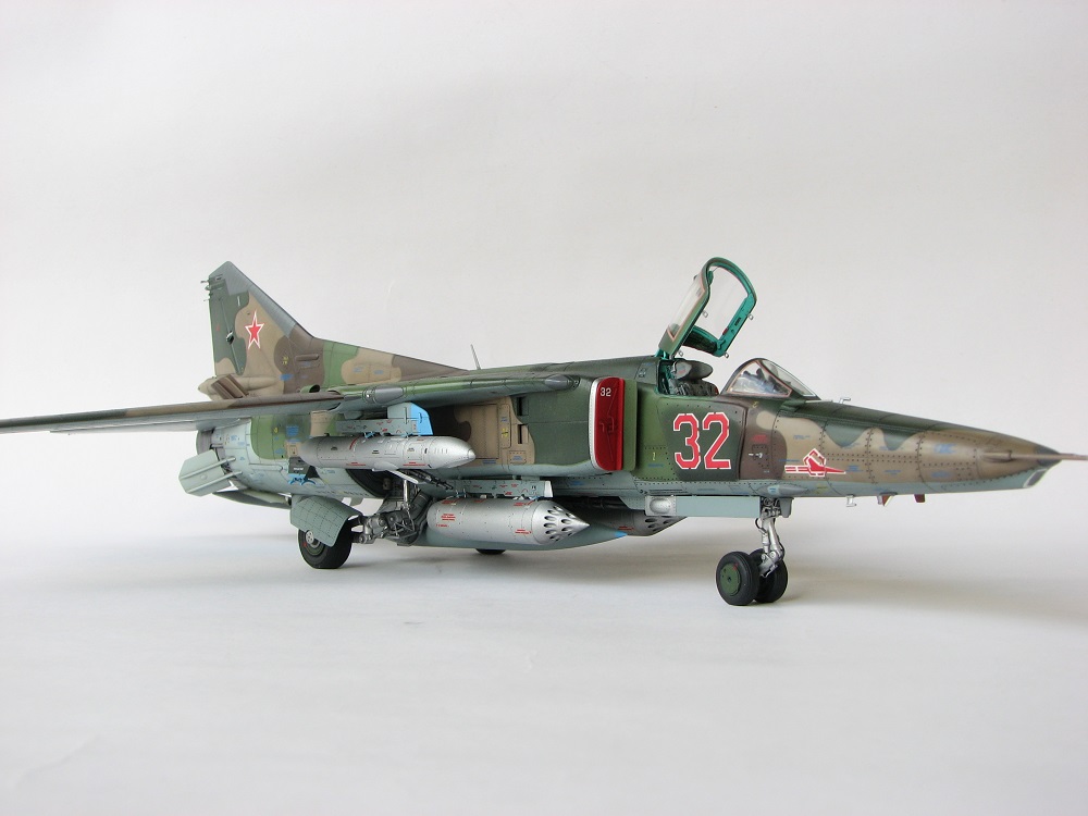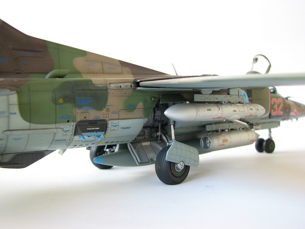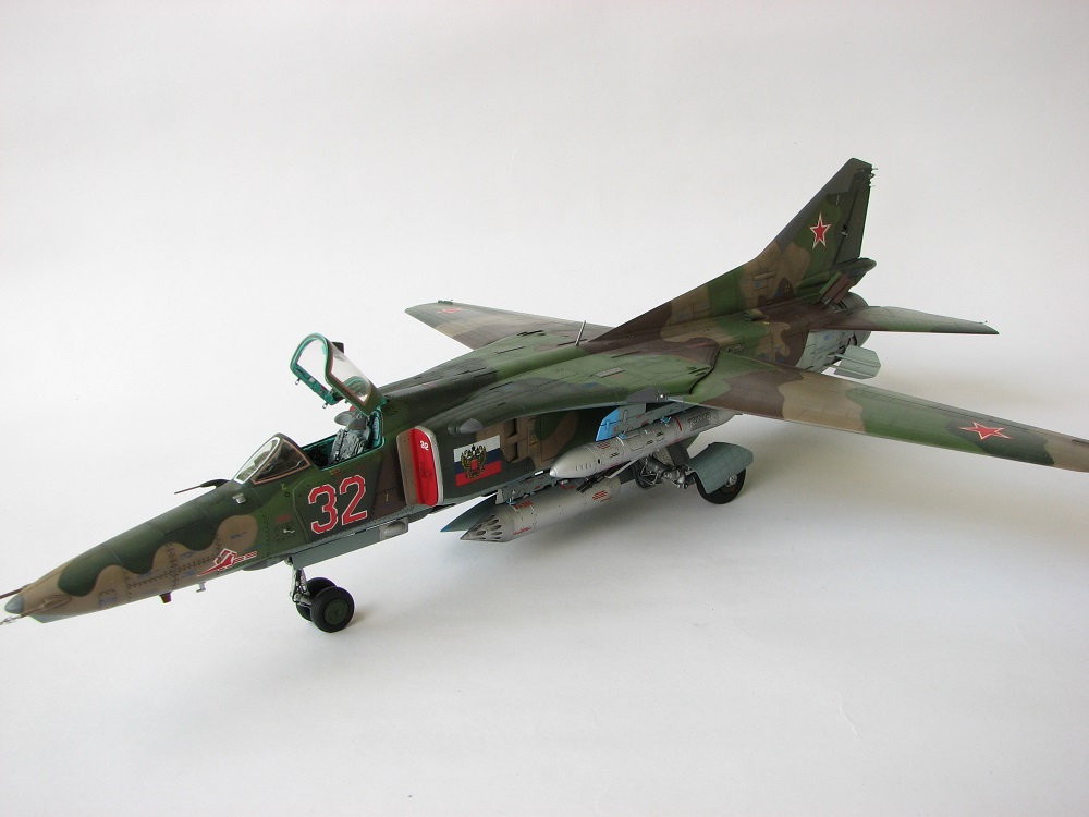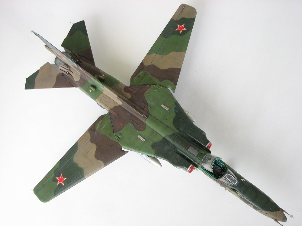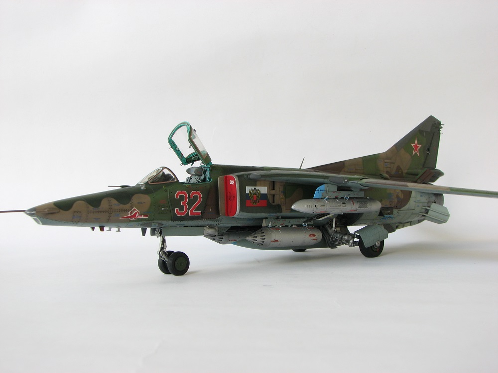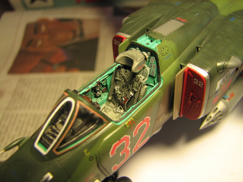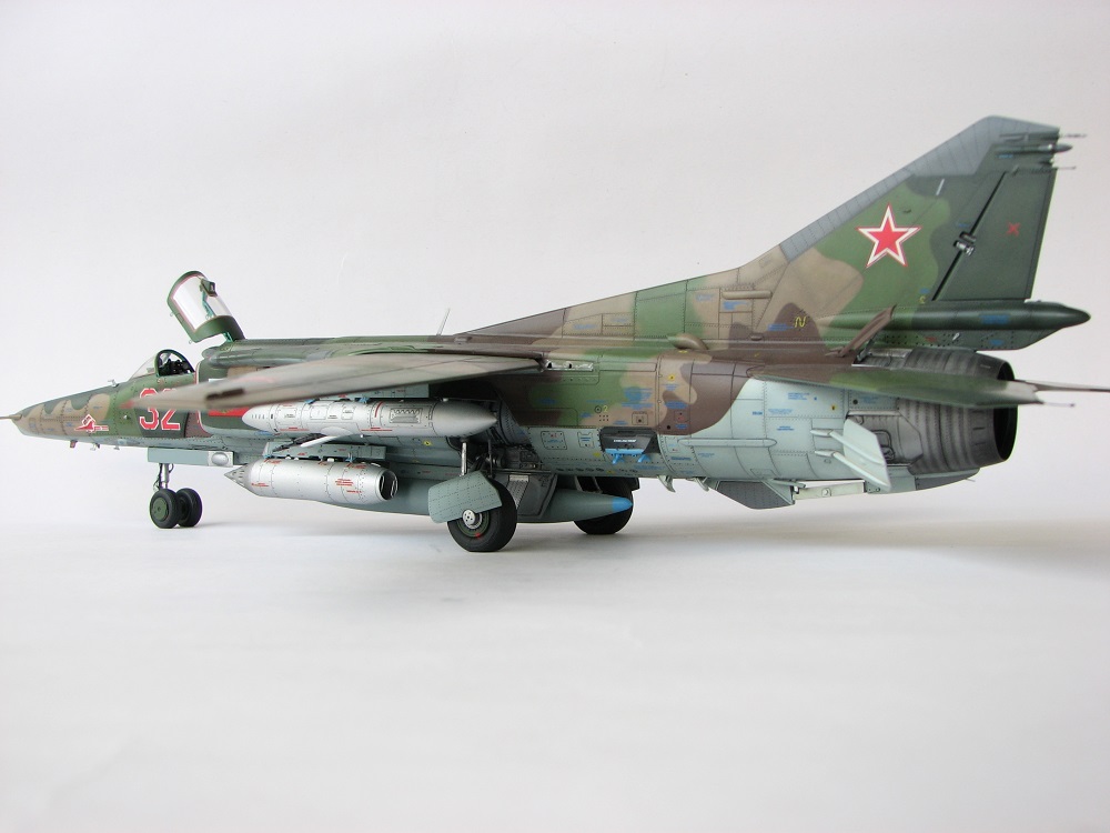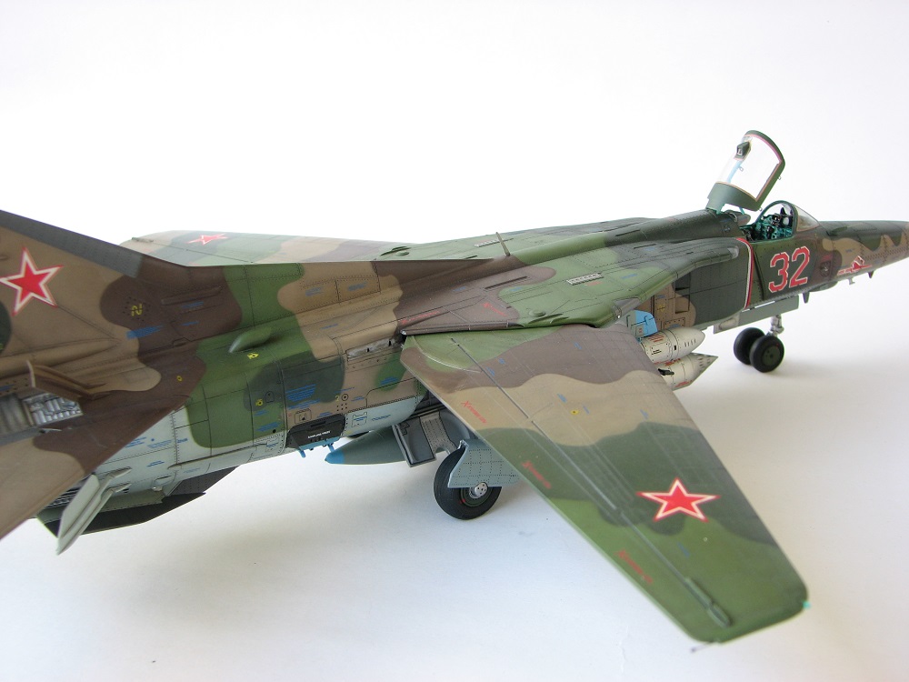 Модель собиралась с довольно значительными переделками и доработками . В частности :переделана передняя часть, фонарь, воздухозаборники, спина модели, киль, сопло, клеса, стойки шасси, пушка, частично расшивка и прочее и прочее . Проще сказать ,что не осталось ни одной оригинальной изкаробчной детали . Так же был использован немного модифицированный кокпит Aires от МиГ-23, обрезки различного фототравления . За прототип был взят известный борт из ЗГВ . Декали, маркировка -сборная солянка из остатков различных декалей и самодельных трафаретов . Вооружение из набора Kitty Hawk . Окрашено традиционно акриловой химией GUNZE .