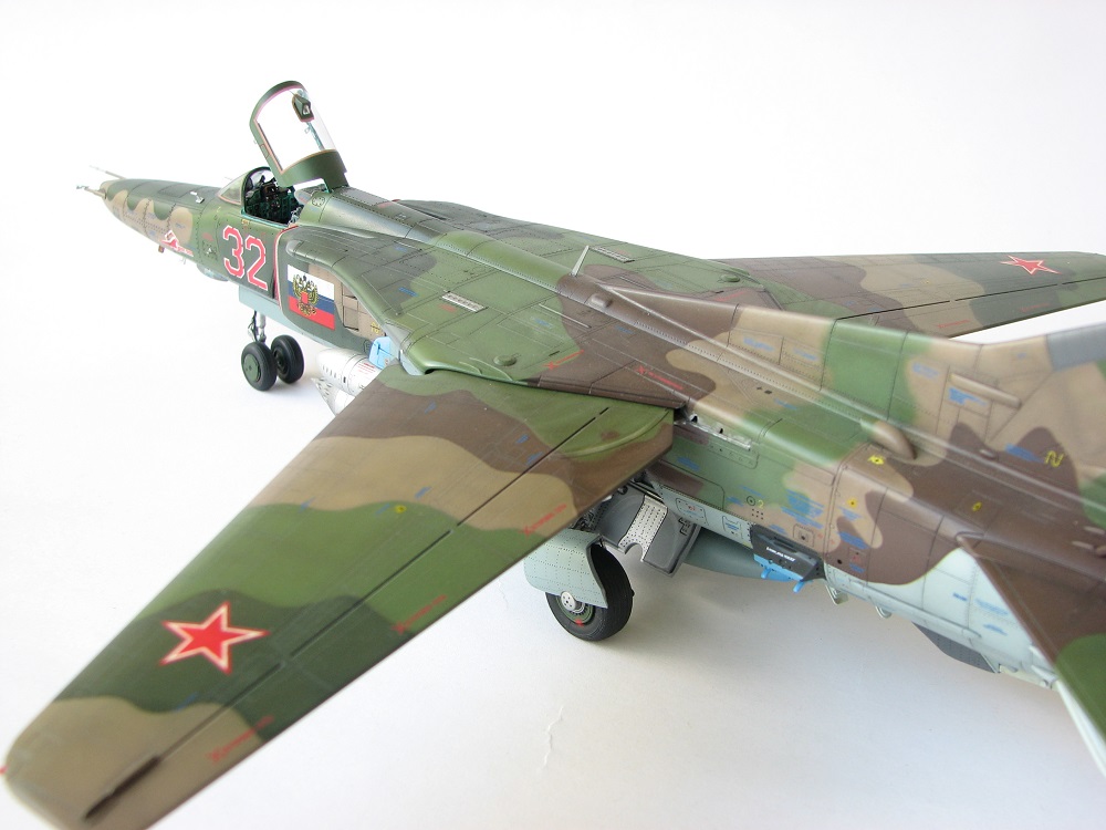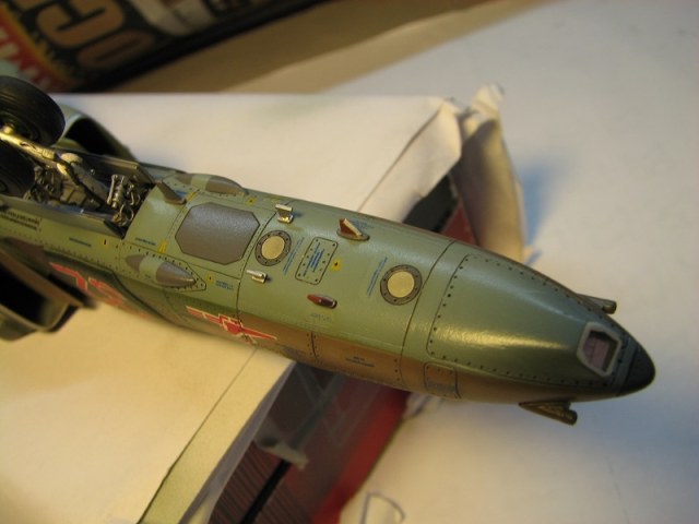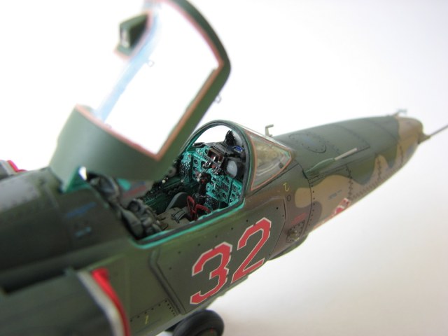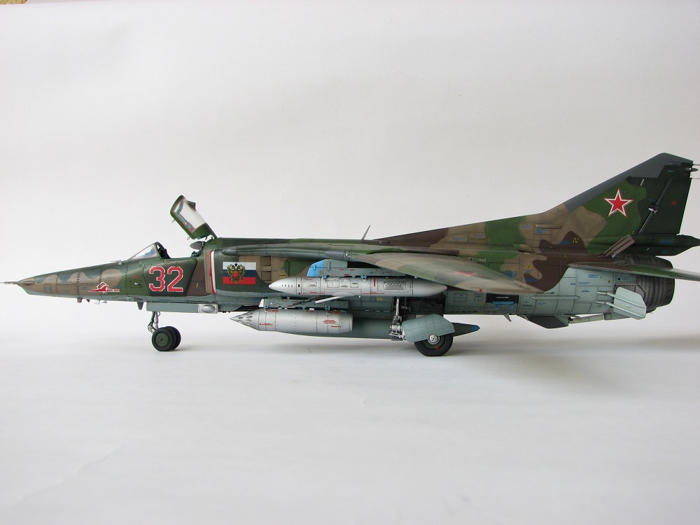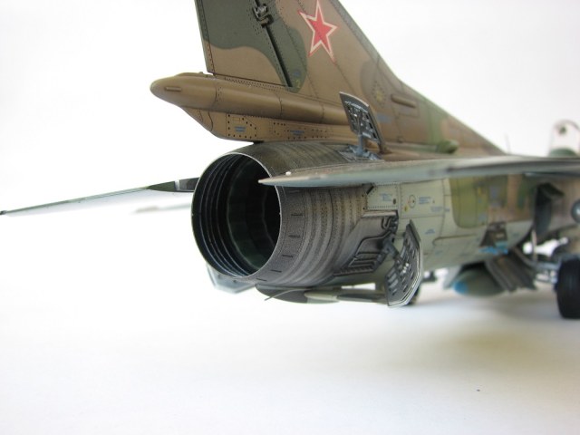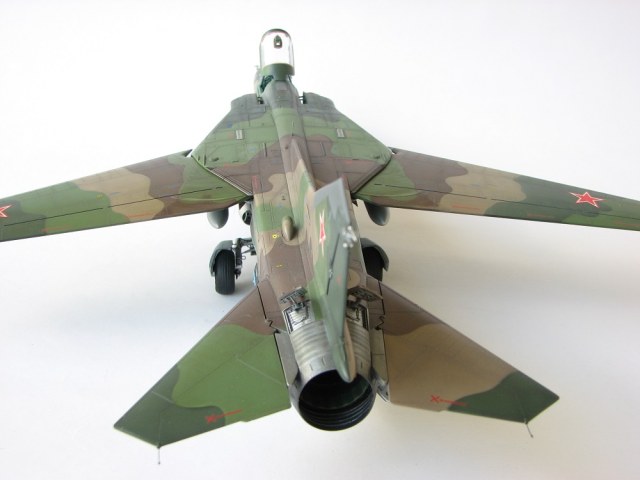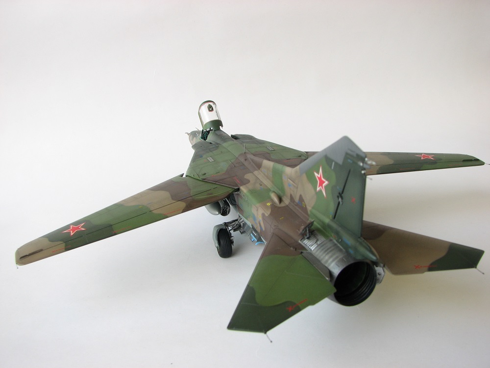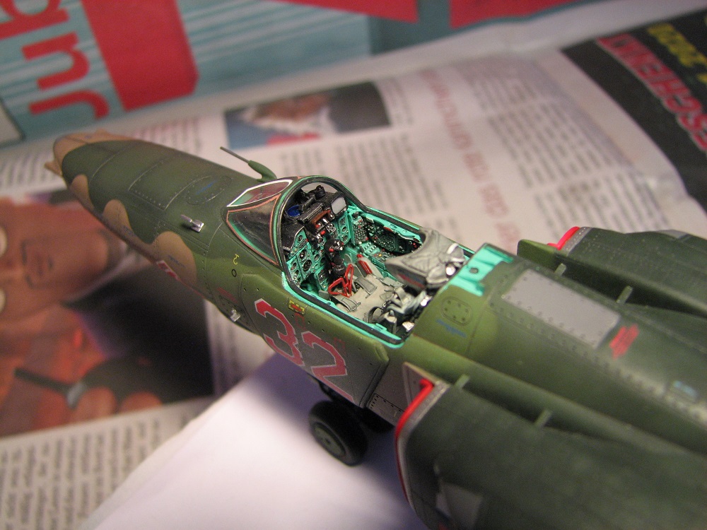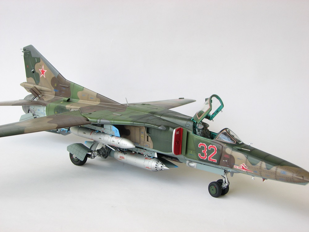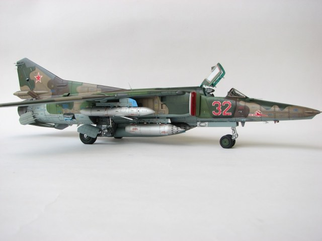 Модель собиралась с довольно значительными переделками и доработками . В частности :переделана передняя часть, фонарь, воздухозаборники, спина модели, киль, сопло, клеса, стойки шасси, пушка, частично расшивка и прочее и прочее . Проще сказать ,что не осталось ни одной оригинальной изкаробчной детали . Так же был использован немного модифицированный кокпит Aires от МиГ-23, обрезки различного фототравления . За прототип был взят известный борт из ЗГВ . Декали, маркировка -сборная солянка из остатков различных декалей и самодельных трафаретов . Вооружение из набора Kitty Hawk . Окрашено традиционно акриловой химией GUNZE .