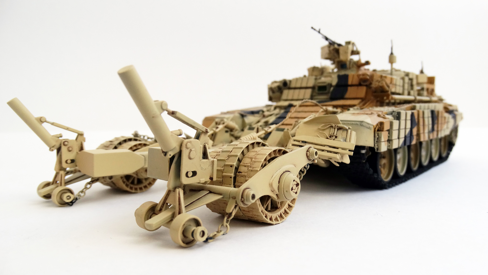 Что, на мой взгляд, при строительстве модели интересного - это то, что окраска производилась оригинальными промышленными красками УВЗ , именно теми цветами, которыми окрашивался оригинальный образец 2015г. Ну и основная цель максимально точно воспроизвести камуфляж. Вопрос уменьшить размер ликал до масштаба 1:35 отпал, потому, что все равно было бы непопадание оскольчатого камуфляжа с оригиналом. Тем более множество выступающих элементов конструкции не давали возможность плотно по всему периметру наложить "маску". Поэтому окрашивал я накладывая модельный скотч последовательно по точкам внешних и внутренних углов камуфляжных пятен.