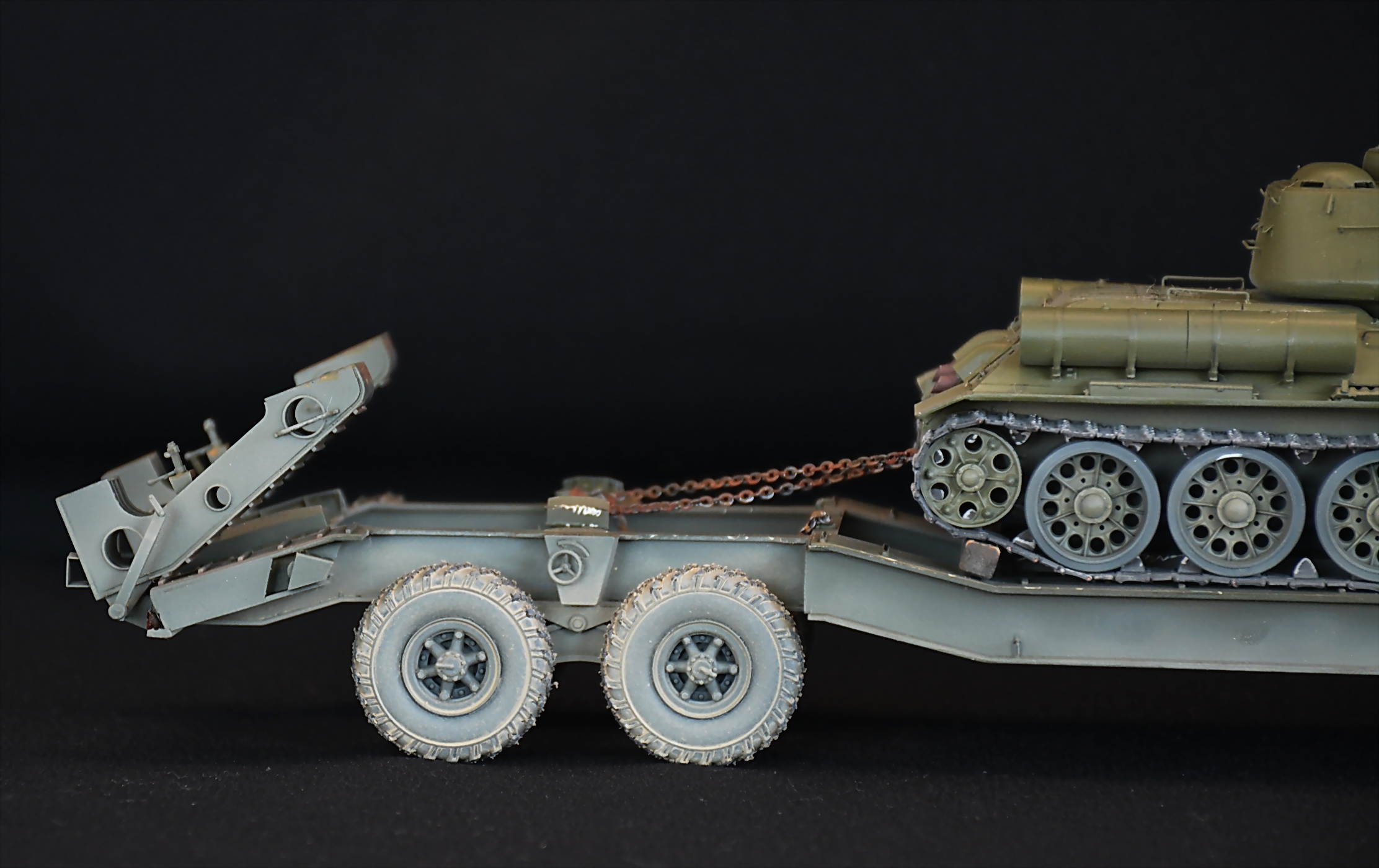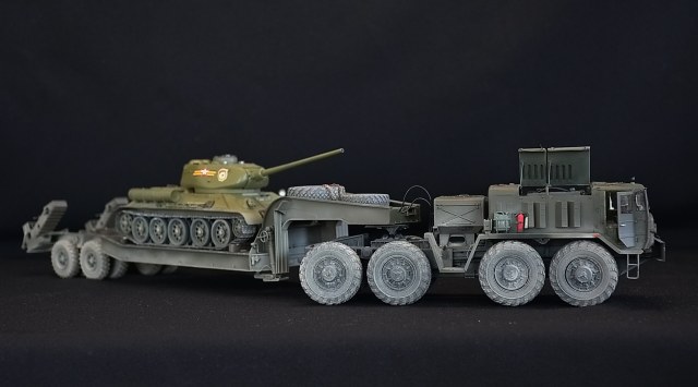 Доброго времени суток, коллеги. представляю Вам на суд очередную свою работу. В работе использован набор МАЗ 537г с тралом ЧМЗАП от трубача, двигатель от MiniArt, набор фототравления от VoyagerModel, проволка различного диаметра для имитации проводки и гидравлики,которую как смог сделал на тягаче и на трале. Т-34 от Звезды с набором фототравления от Микродизайна и наборными траками от MASTERCLUB.Помимо всего этого использовал всякие остатки от моделей, доширак пласт,деревянные шампура (бруски упора под танк). Окраска красками Тамия, MRХобби, Акан. Химия от …, легче назвать что не использовал. Задумка данного произведения возникла случайно, привязки никакой не имеет, врятли Маз будет таскать на тренировку парада Т-34, сейчас есть более современные тягачи, но захотелось – сделал, хотя в сети попадалась фото где именно такой Маз и на трале Т-34. Номера «нарисовал» современные, это мое виденье, я конечно далек от всей этой матчасти, думаю автомобилисты и БТТшники накидают сейчас дров, но повторюсь, делал так, как видится мне, да еще+ будет ребятишкам в кружке моделизма , который я веду наглядное пособие. Приятного просмотра, каску одел, в окопе спрятался))).