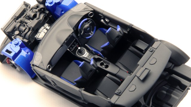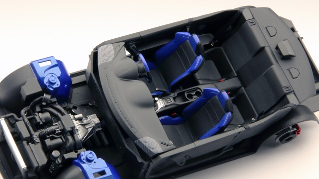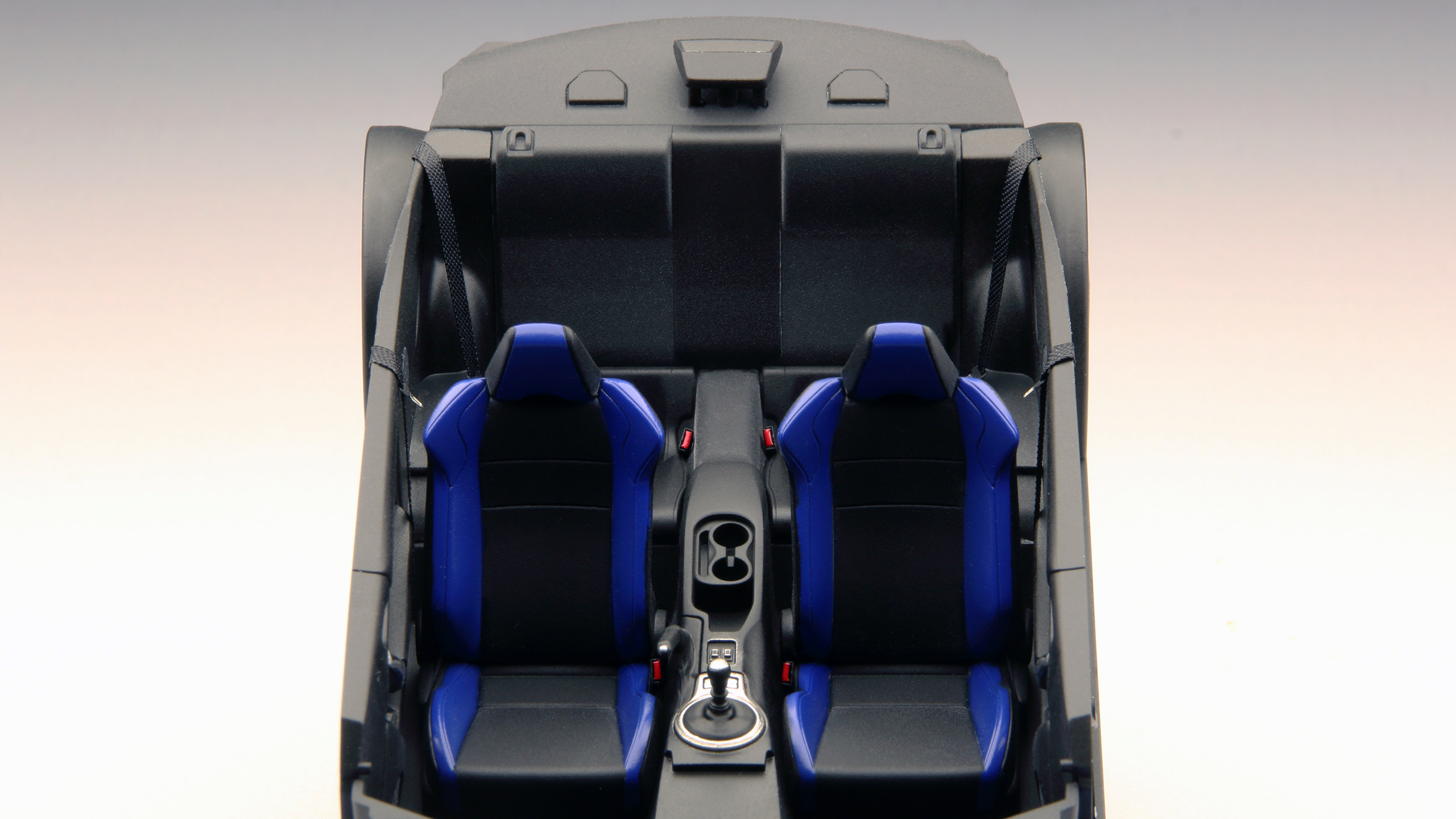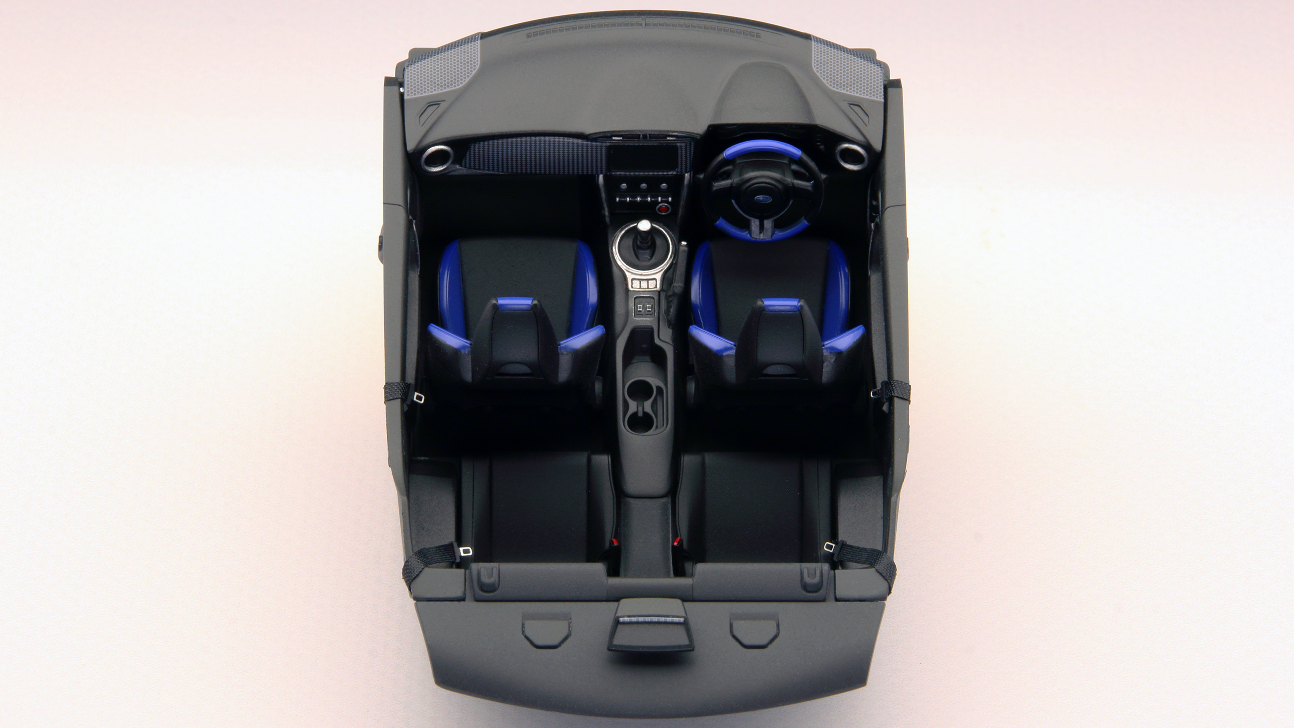 Кузов покрашен LP-41 (Mica Blue - Tamiya), лак 2к от Zero Paints. Различные элементы нитро красками от мр.хобби. Установил ремни и подушки безопасности (но последние показывать я конечно не буду), чтобы автомобиль и его салон Scion FR-S получили одну из высших наград от американского страхового института безопасности дорожного движения (IIHS) — Top Safety Pick. Да, теперь ездить будет не только безопасно, но и комфортно, т.к. в синей версии имеются синие вставочки из кожи, которые принесут помимо всего прочего и эстетическое удовольствие. Если серьезно, воспользовался дополнениями от набора «КА Models», чтобы оживить интерьер салона. Остальное всё исключительно из коробки. Шильдики фирменного значка субару (звёздочки на синем фоне) предлагают исполнить в двух вариациях, первое просто декали на кузов, второй - металлостикеры, но последние даны просто металлической плашкой, где необходимо также нанести декаль сверху. Воспользовался вторым методом, чтобы смотрелось как отдельный элемент, также сверху задул лаком, чтобы блестели.