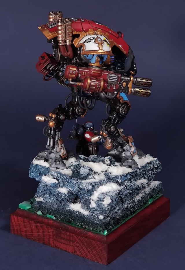 Окраска акрилами от Tamiya и Citaldel, глаза рыцаря сделаны из пайеток и при естественном освещении как бы "горят". Оформил для них подставку, изображающую арктический инопланетный пейзаж. Чтобы подчеркнуть инопланетность вода и лёд сделаны зелёными, а скалы голубыми. По поводу снега подумал и оставил его белым. Подставка из дерева, пробки и стекла, окрашивалась теми же акрилами, вода из эпоксидки и тамийского лака.