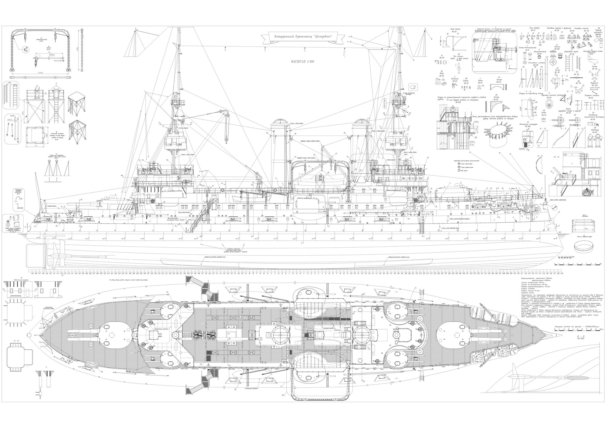 Хотел сразу предупредить коллег моделистов о том, что чертежи ЭБР Цесаревич о которых здесь говорят это достаточно известная реконструкция броненосца выполненная Алексеем Логиновым. До определенного момента лет так пять она была в свободном доступе на сайте navarian.ru. Однако в последствии они от туда были удалены, по какой причине мне не известно. Тем не менее в сети они распространились и иногда встречаются в конференциях и чатах. Оригинальный комплект включал в себя как уже было заведено у Алексея два файла pdf где была резаная версия чертежей по-моему под принтер с А4 и версия монолитная, плоттерная, которая представлена частично здесь в галерее модели. Помимо этого в комплекте ещё шла пояснительная записка автора чертежей аж на 80 по моему страниц текста фоток и чертежей, где Алексей подробно объяснял как и почему он делал свою реконструкцию. Это наверное самый ценный материал в этом комплекте но он обычно теряется при копировании данных и остаётся только графика.