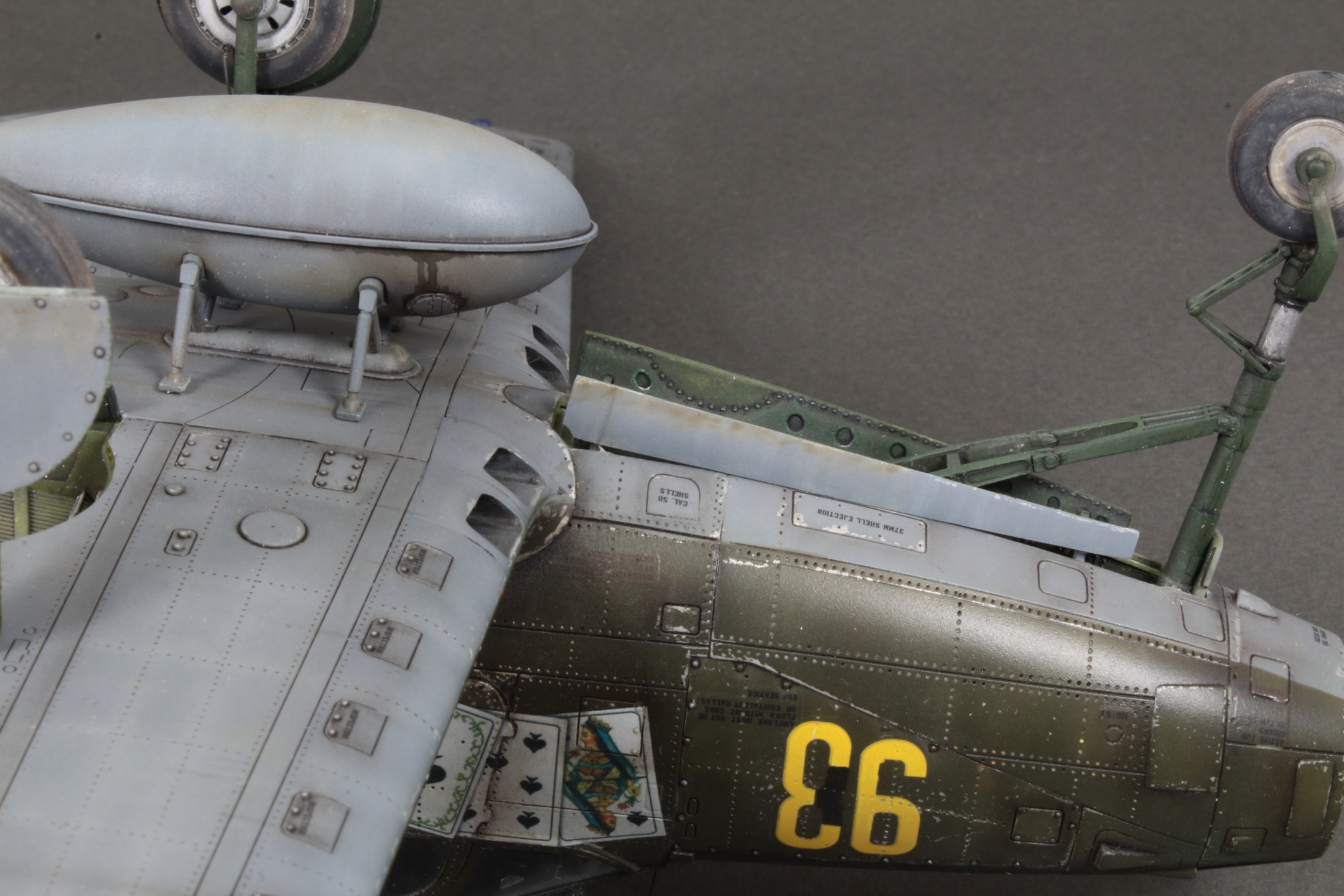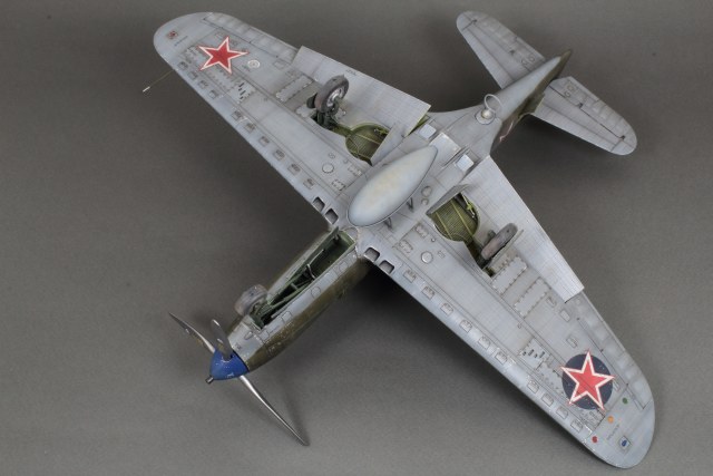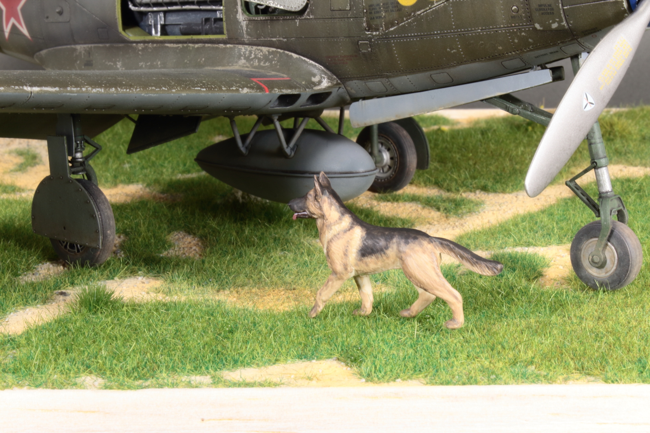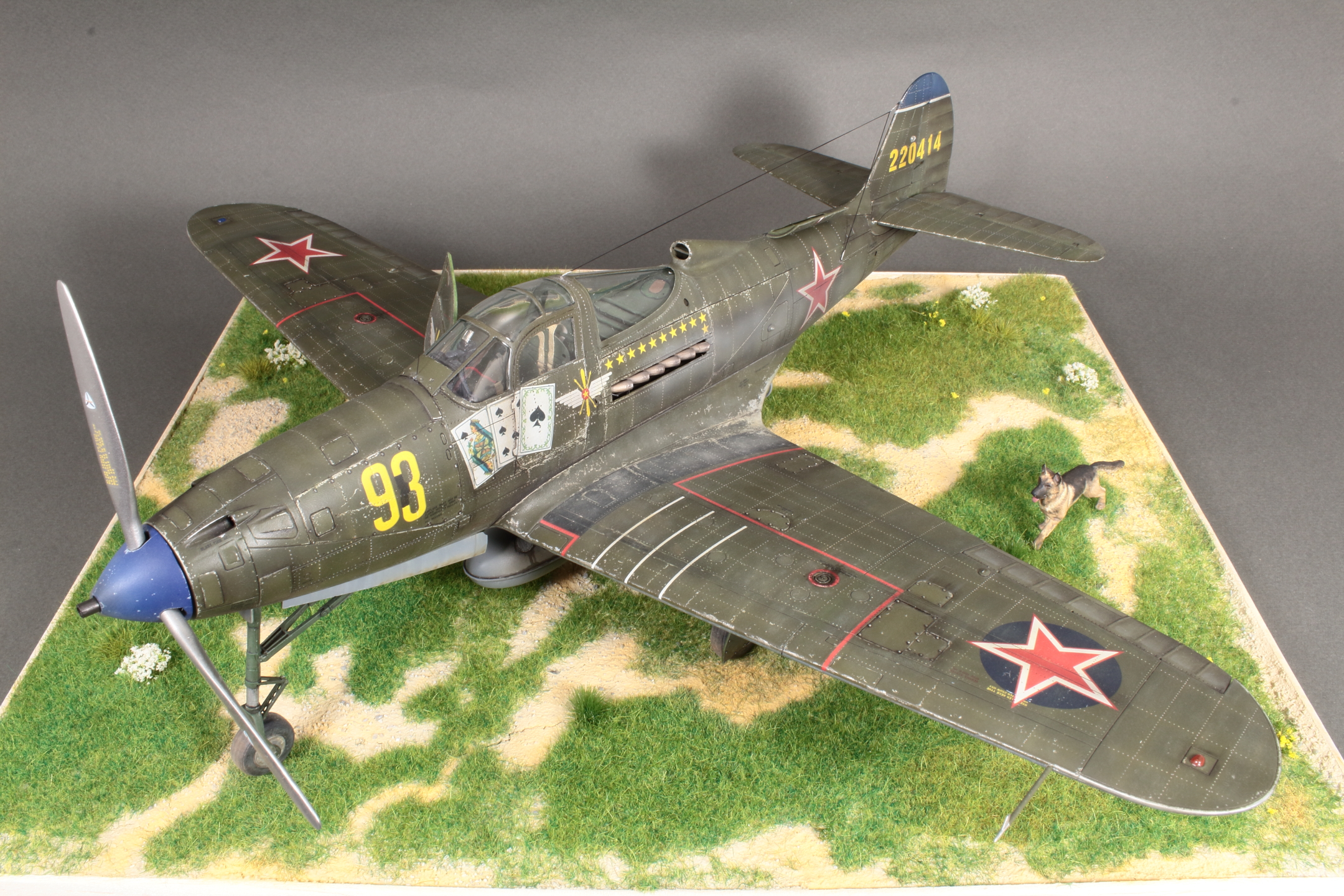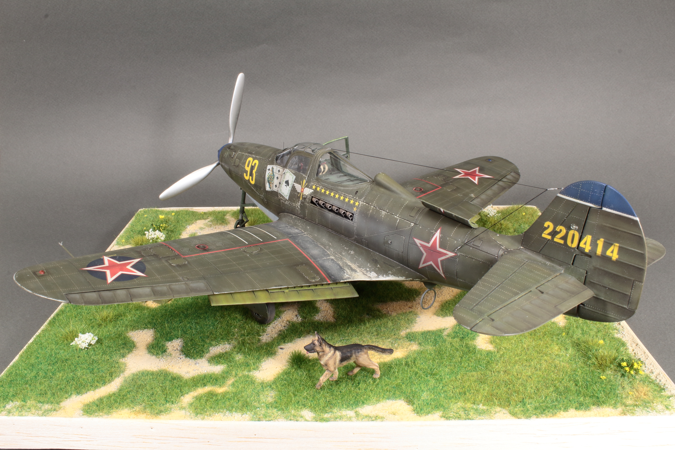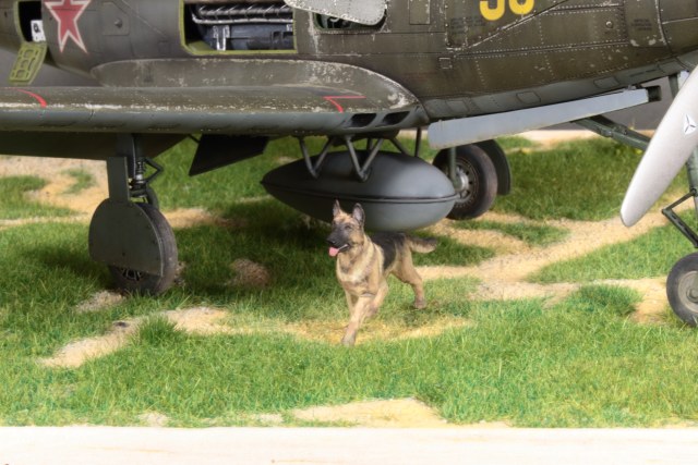 Красивая модель! Очень смотрится. А собака вообще отпад. Понравился окраска снизу. Без вопросов. Сверху для меня чуть сильно изношен самолёт, но тут уж...кто как.Удачи!