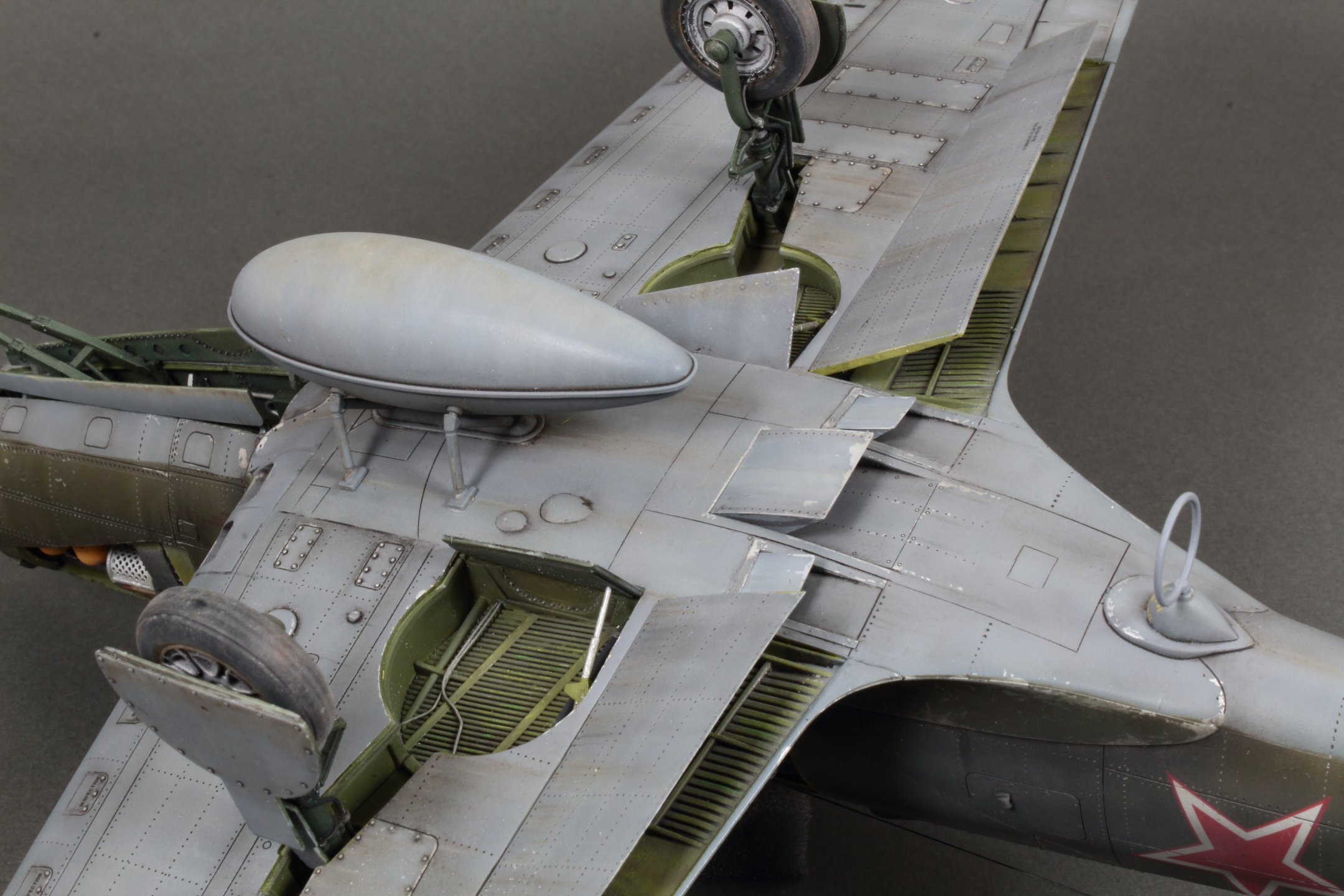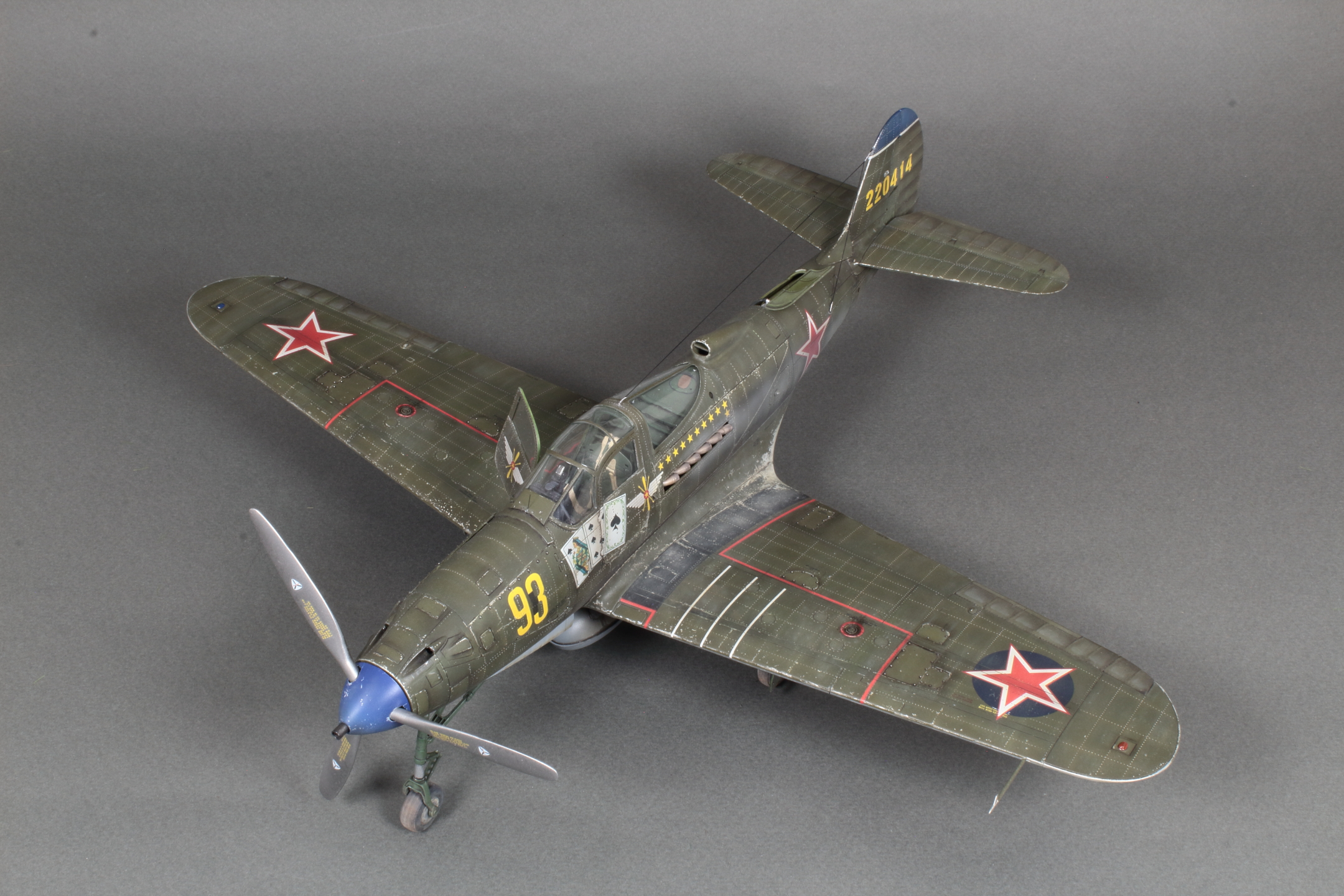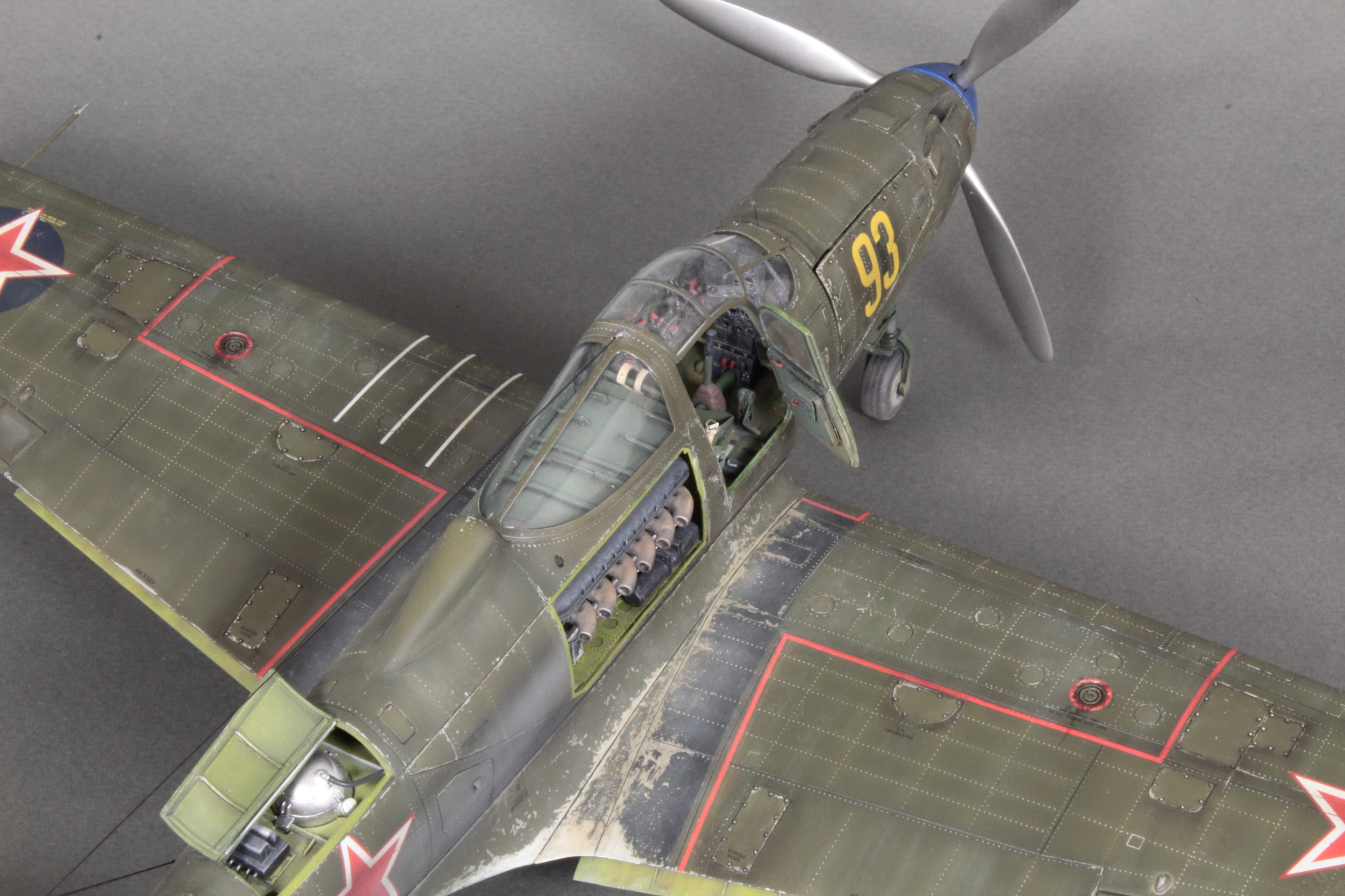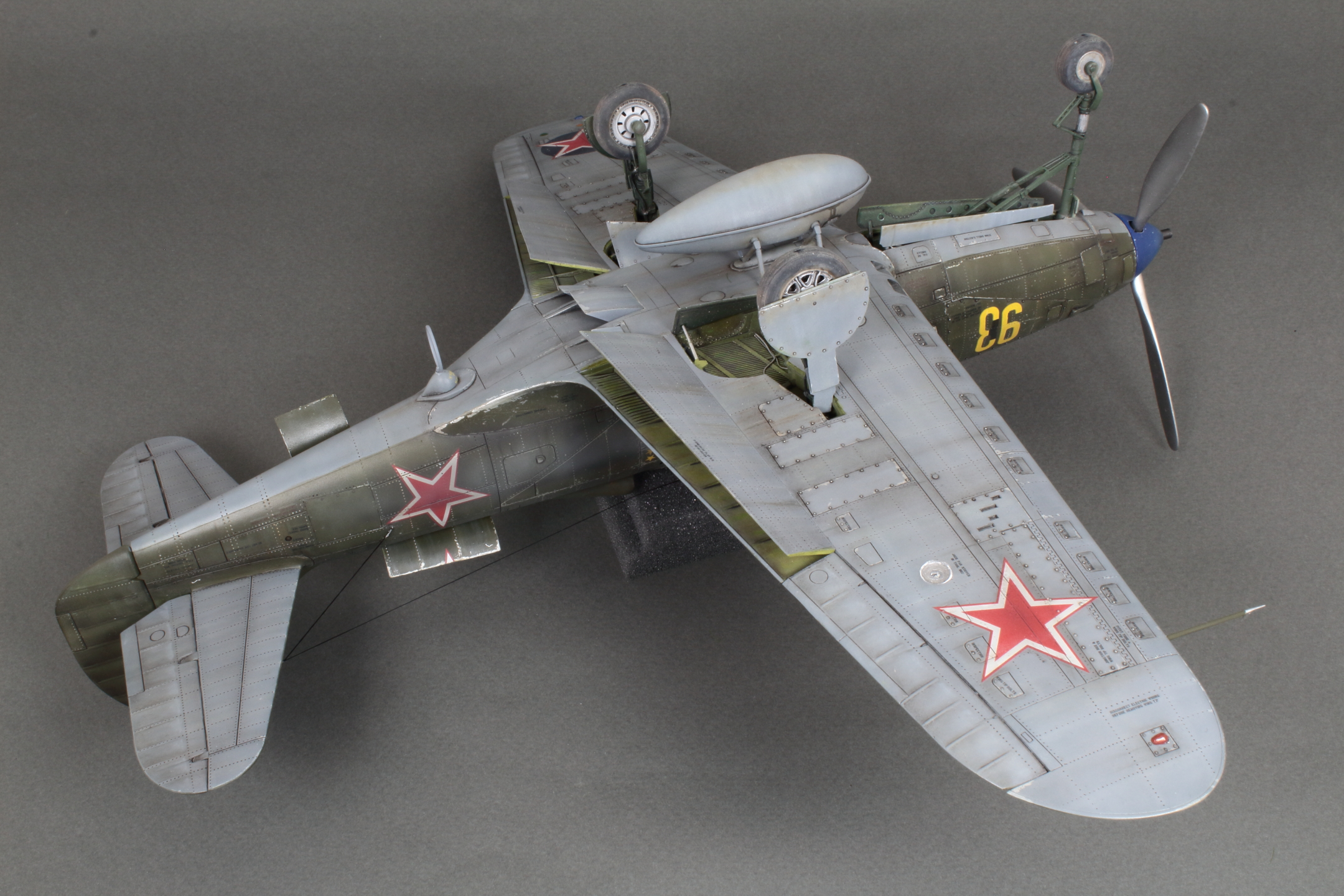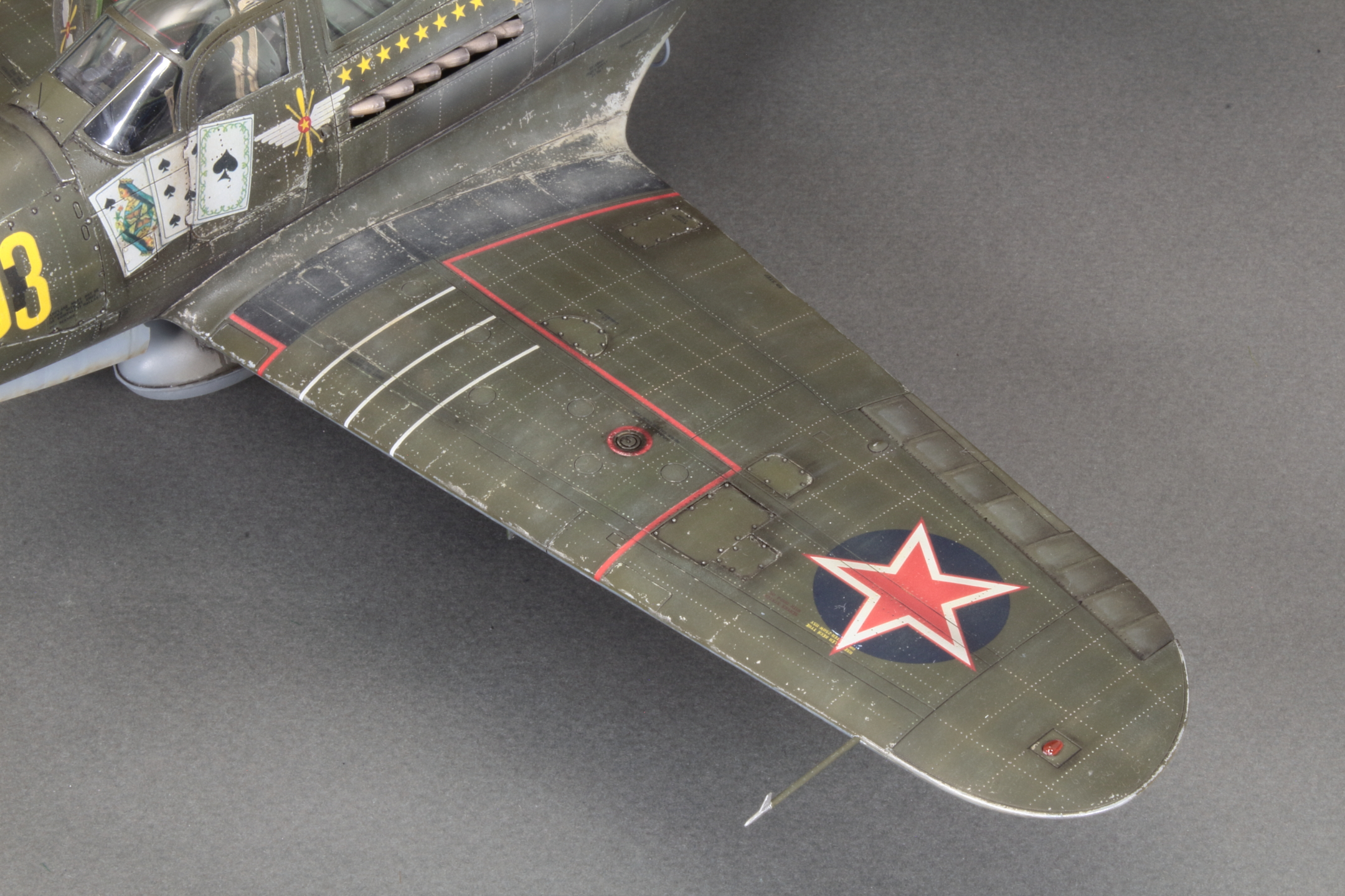 Красивая модель! Очень смотрится. А собака вообще отпад. Понравился окраска снизу. Без вопросов. Сверху для меня чуть сильно изношен самолёт, но тут уж...кто как.Удачи!