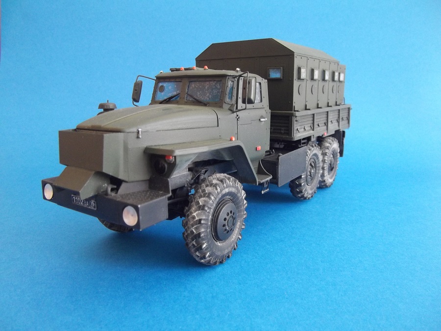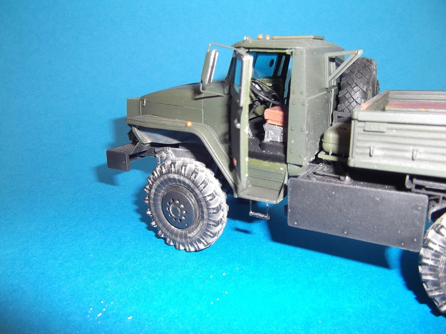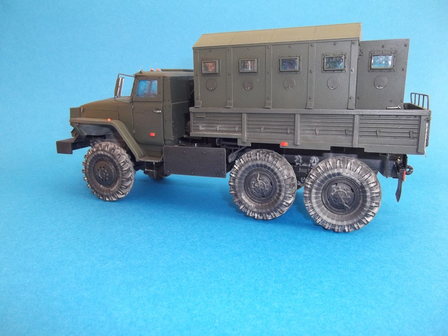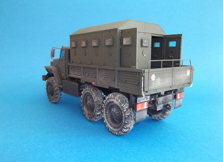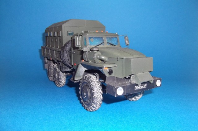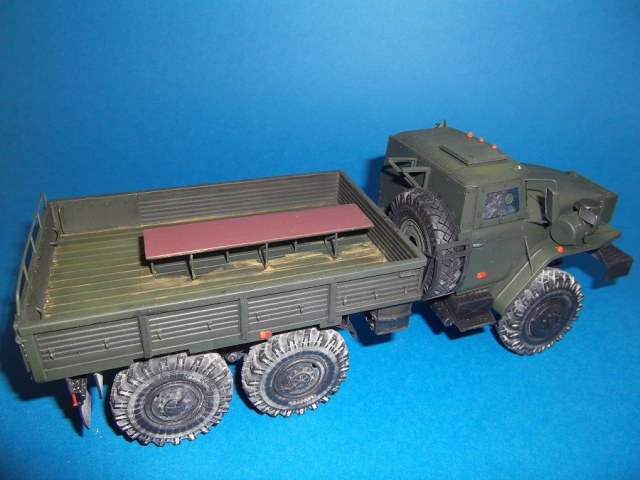 Заменил передние фары на бампере. Стекла кабины и кузовного кунга затемнил пленкой. Попробовал это впервые, результат не очень. Задние фары производителем не даны, поэтому приходится тупо вырисовывать на пластине.