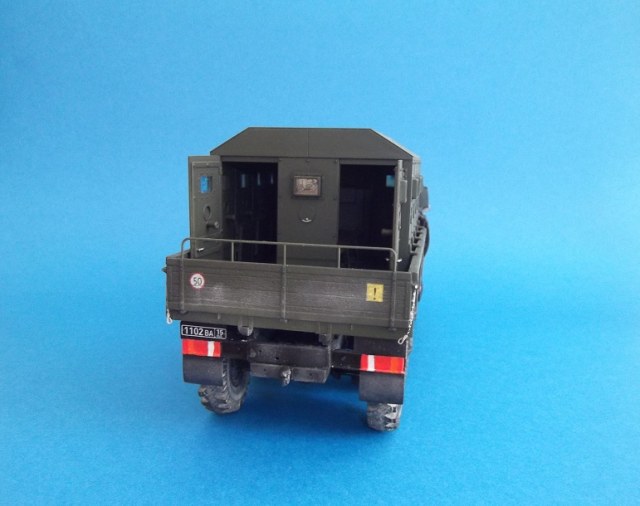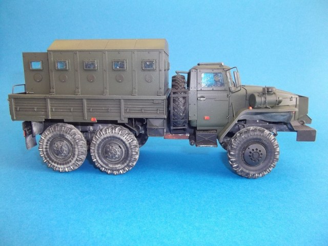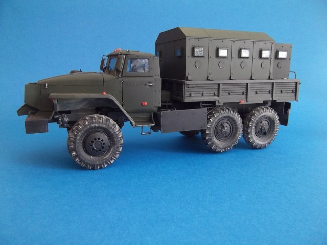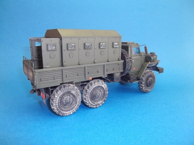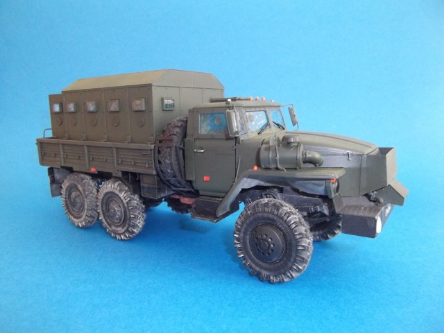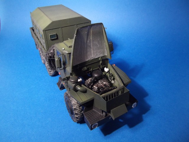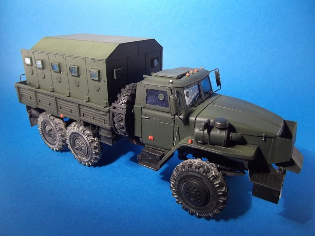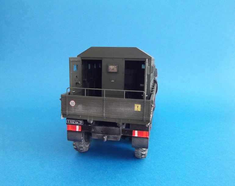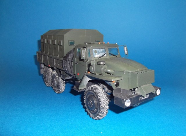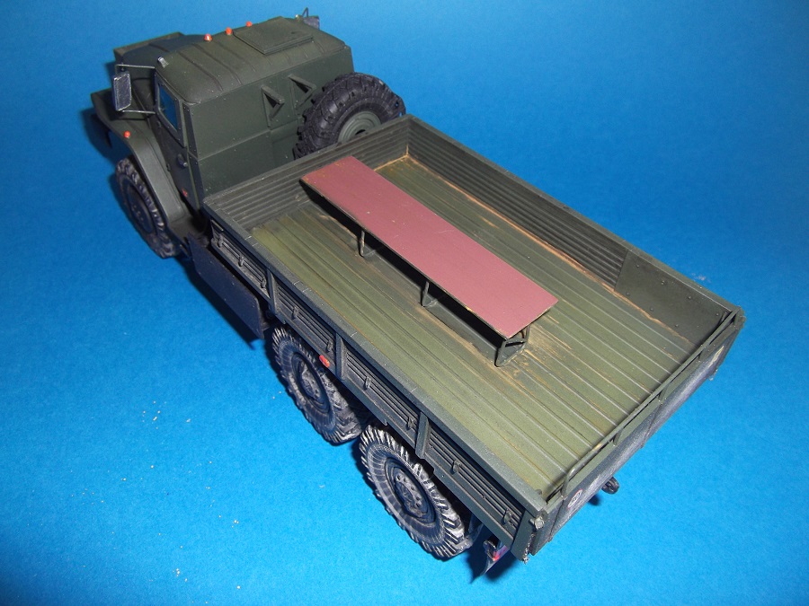 Заменил передние фары на бампере. Стекла кабины и кузовного кунга затемнил пленкой. Попробовал это впервые, результат не очень. Задние фары производителем не даны, поэтому приходится тупо вырисовывать на пластине.
