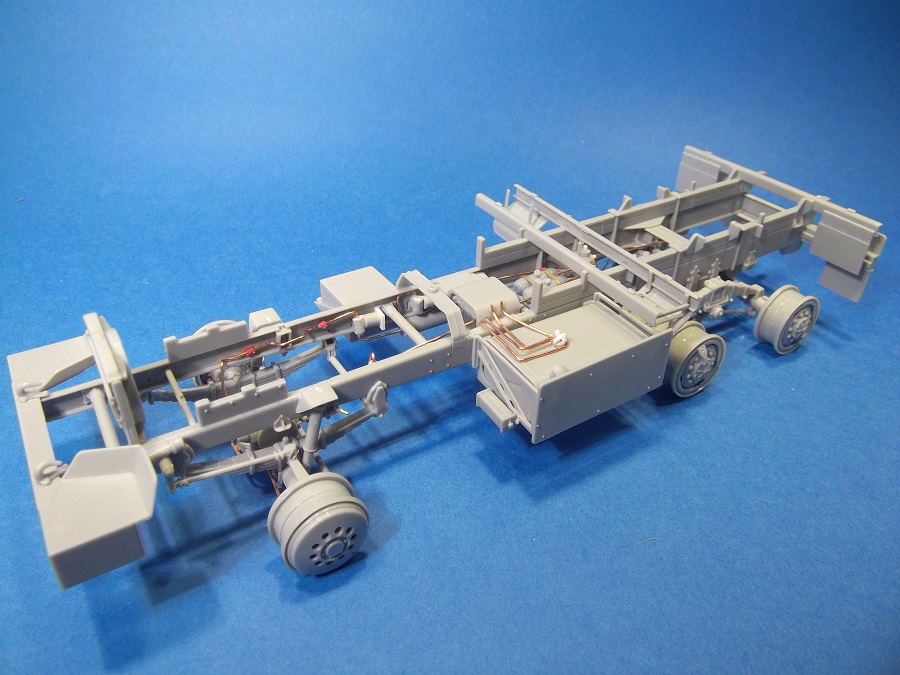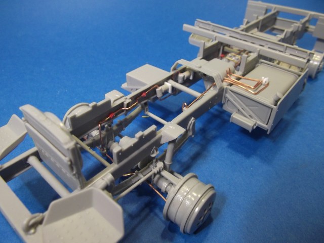 После этого понесло меня. Решил доработать и добавить тормозную систему и систему питания воздухом. Установил воздушные баллоны, усилители пневматики, нарастил трубки. После сборки заметил, что установил их зеркально, ну первый блин комом. Собрал и подсоеденил регулятор и защитный клапан. Все установленно в большем обьеме, без фанатизма, так сказать обозначив системы. Добавил трубопроводы на топливном баке.