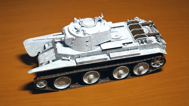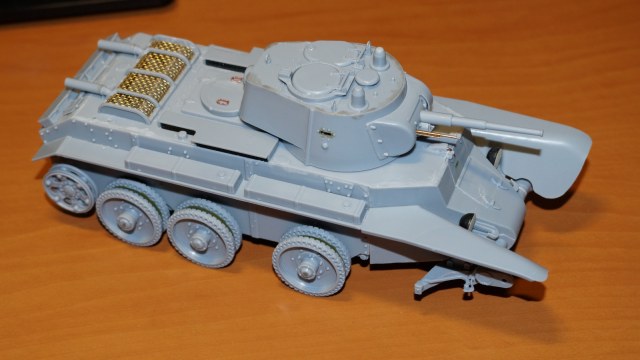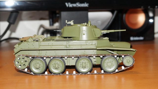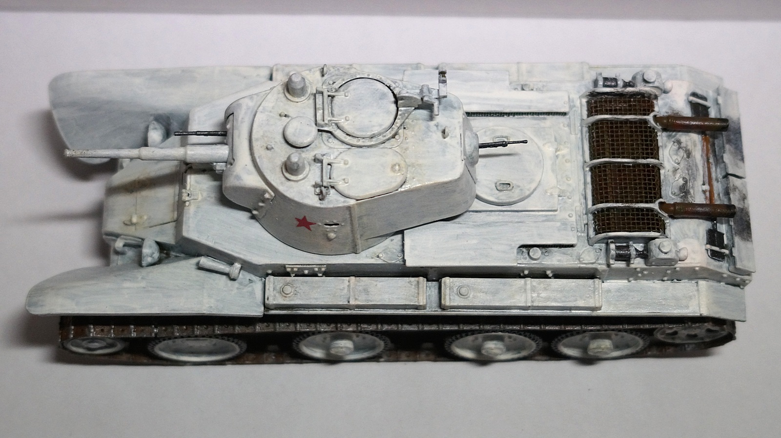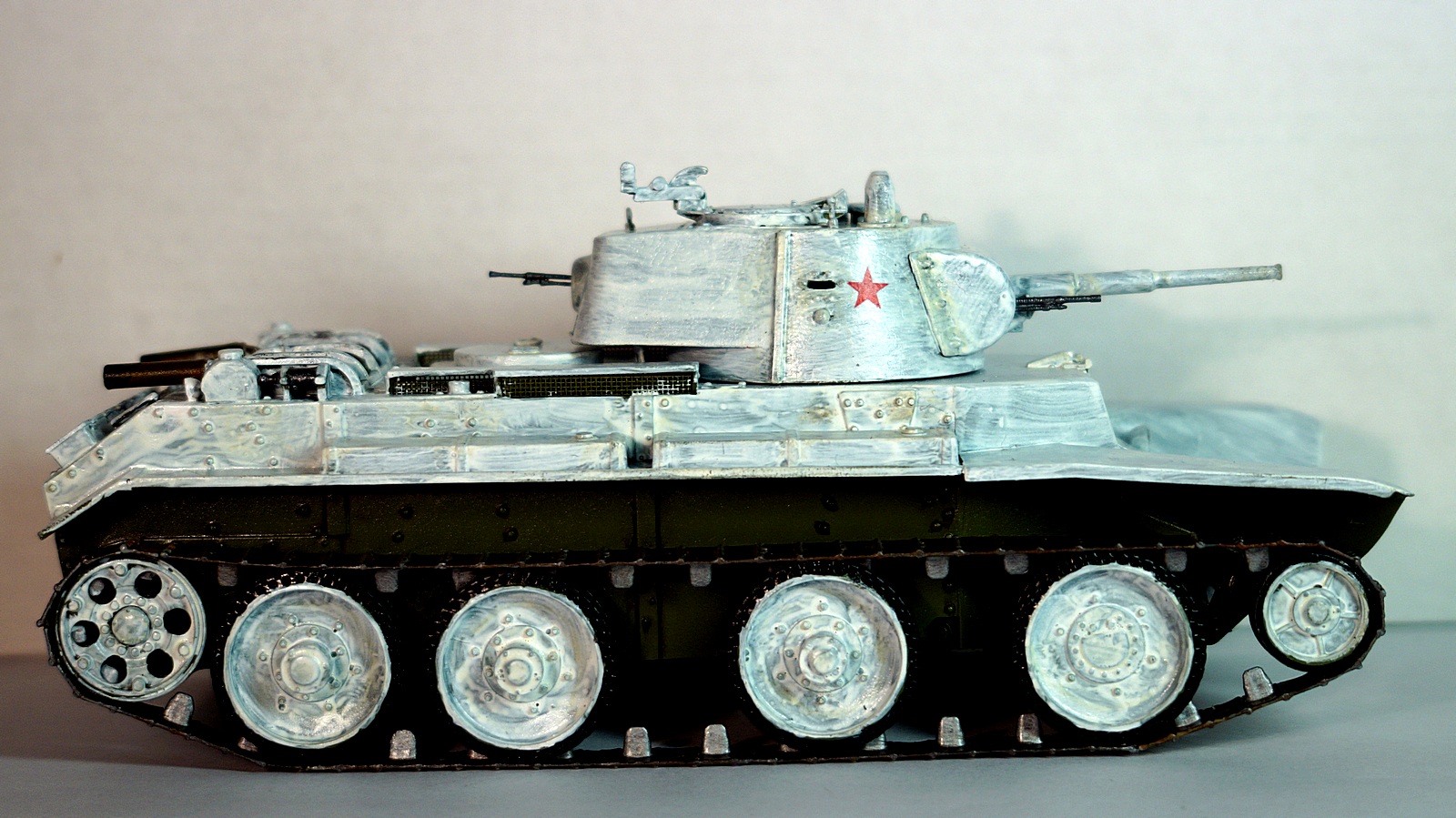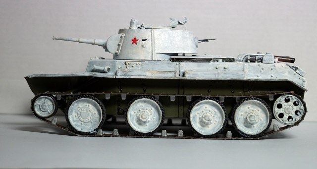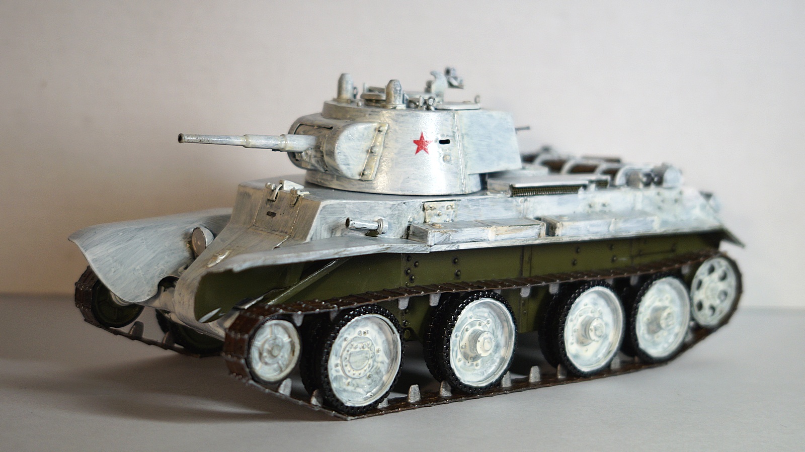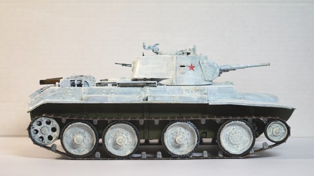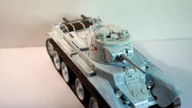 Здравствуйте, коллеги! Собрал очередную модель БТ-7 от "Восточного Экспресса" в зимнем камуфляже. Собирал ее одновременно с такой же моделью, только в летней окраске. Очень уж хотелось иметь два варианта этой модификации танка - летний и зимний. За образец взял картинку БТ-7 из состава 13-й легкотанковой бригады во время ее участия в советско-финской войне (последняя). Собирал данную модель по уже отработанной схеме, потому сборка проходила легко. Модель собирал почти что из коробки. От себя добавил доработки: 1. Попилил сетку над двигателем, оставив от нее один каркас, и приклеил металлическую сетку. 2. Под сеткой вырезал прямоугольное отверстие и из выпиленного материала изготовил жалюзи. 3. На крышку вентилятора двигателя приклеил ручки. 4. К воздухозаборникам, что расположены по бокам от крышки вентилятора двигателя, приклеил сетку. 5. Основные фары поставил от "Elf". 6. Курсовой пулемет и гудок поставил от Magic Models". 7. Приделал тросик для поднятия верхней части люка механика-водителя. Фары боевого освещения и башенный пулемет устанавливать не стал. При покраске сначала нанес аэрографом базовый цвет 4БО, затем кистью нанес зимний камуфляж, приклеил звезды на башню, задул все глянцевым лаком, нанес смывку для зимнего камуфляжа и задул матовым лаком. Пачкать модель не стал. При нанесении эффектов использовал расходные материалы следующих производителей: 1. Краска базового цвета и матовый лак - "Акан". 2. Краски для гусениц вороненая сталь, ржавчина - "Звезда", серая сталь - "Акан". 3. Глянцевый лак - "MR Hobby". 4. Смывка - "ZIP" и "AK Interactive".Также решил добавить фотографии процесса сборки модели.