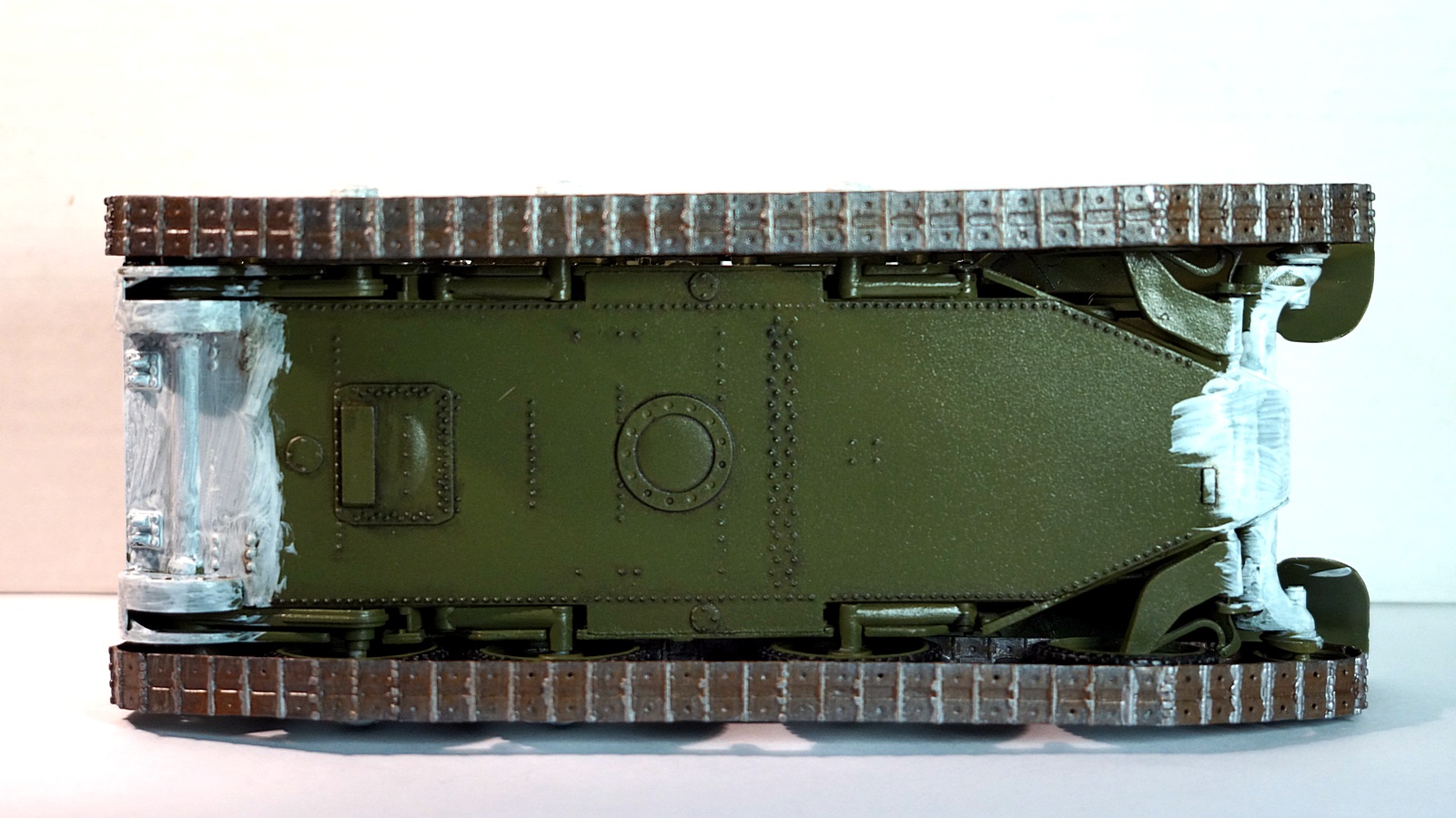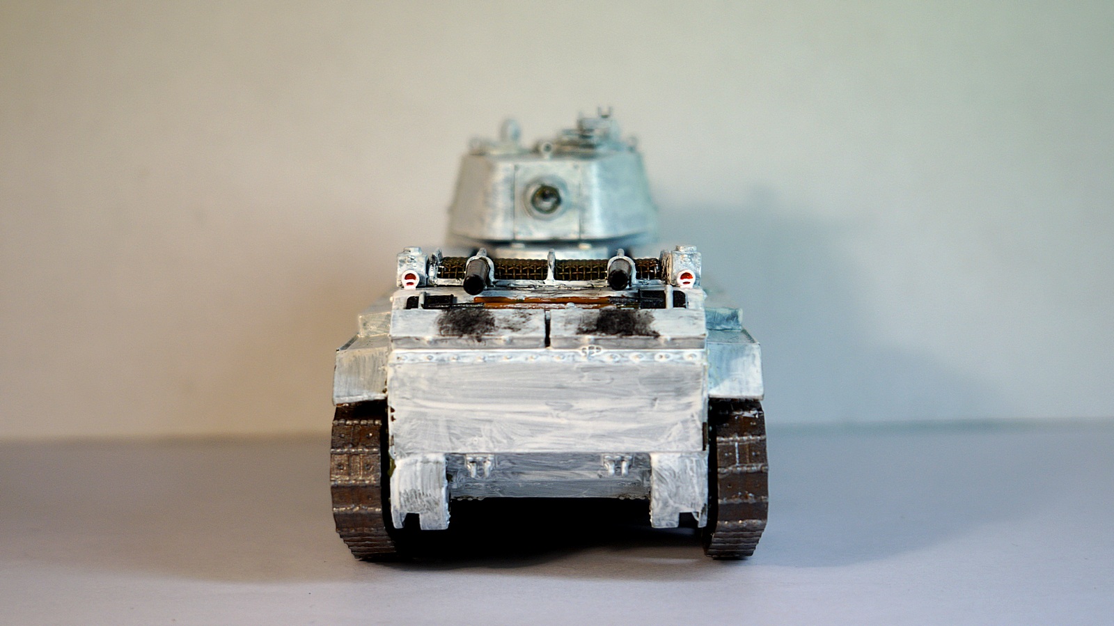 З.Ы. Учел замечания по поводу блеска модели и решил исправить это безобразие. Взял и полусухой кистью заново покрасил модель поверх лака. Блекс полностью не ушел, но его стало значительно меньше. Бандажи катков слегка подпылил пигментом чтобы не блестели. Исправленная модель показана на трех последних фотографиях.