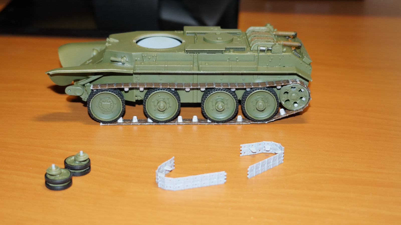 Направляющее колесо гусеничного хода и переднюю часть гусеницы прикрепляю в последнюю очередь. Перед этим приклеиваю гусеницы до передней пары опорных катков. Делаю это для того, чтобы точно подогнать траки передней части гусеницы к основной ее части, чтобы не получилось, что направляющее колесо приклеено, а для соединения траков не хватает пары-тройки миллиметров.