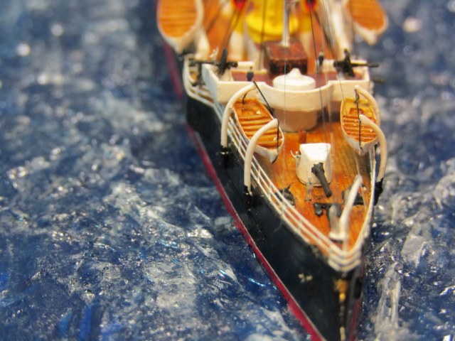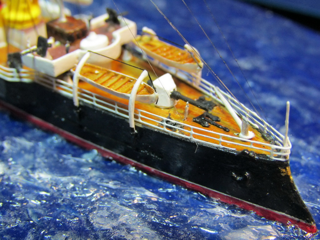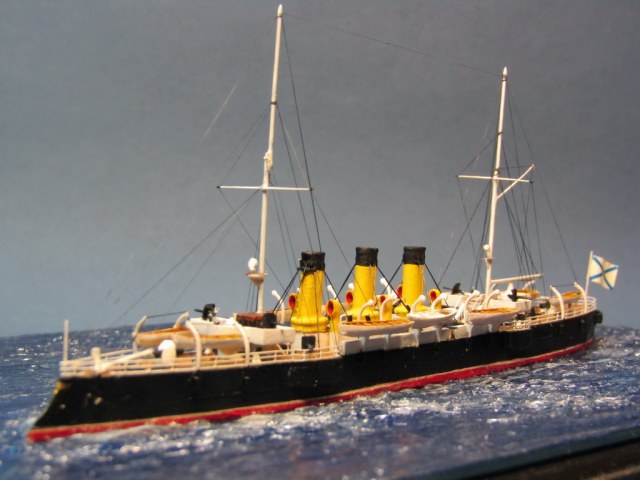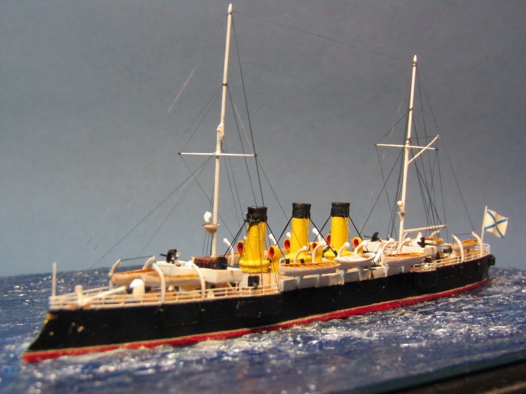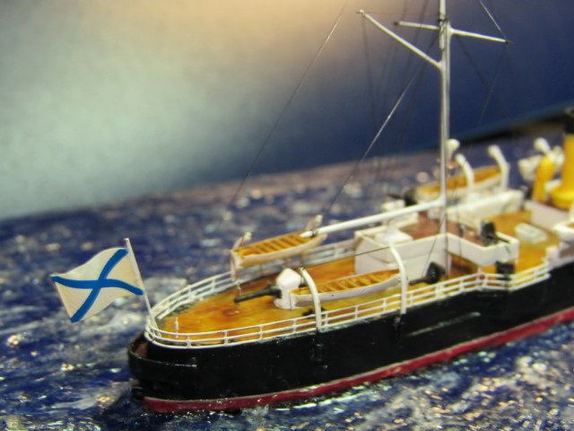Самостоятельно сделаны: мачты и флагштоки (иголки, булавки), носовая бронерубка (литник), кран-балка на носу, паровые трубки на дымовых трубах, прожектора на мачтах, световые люки между трубами.