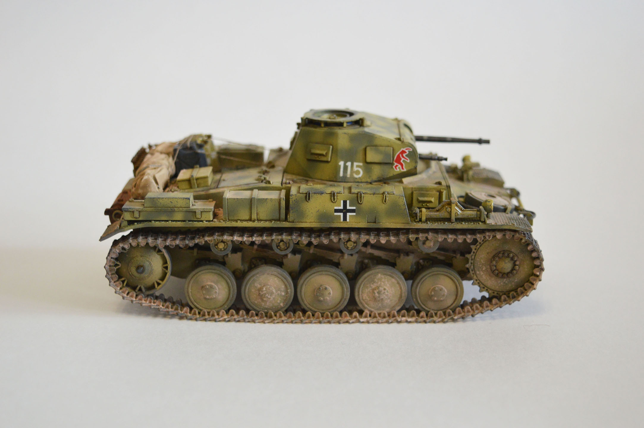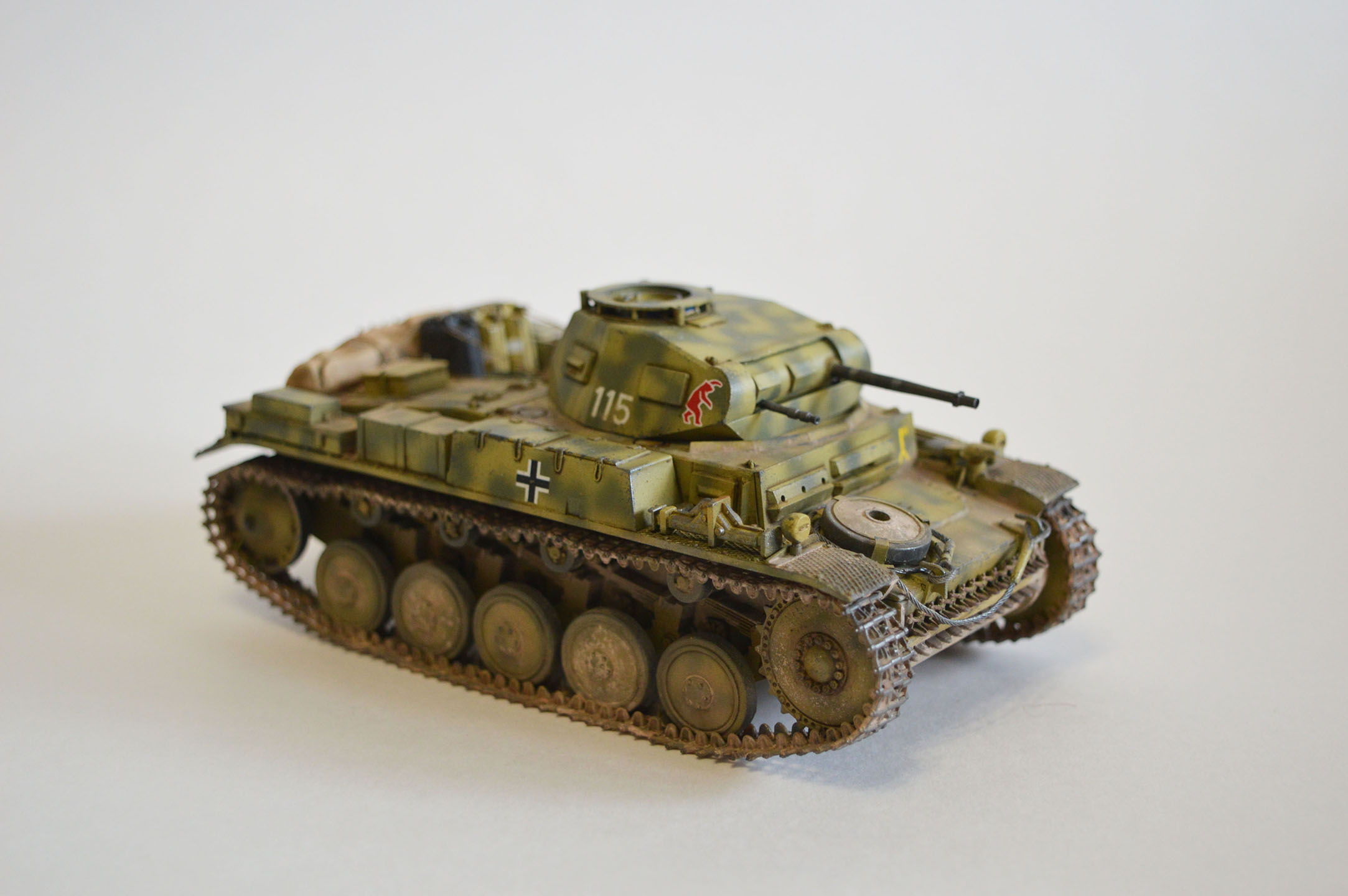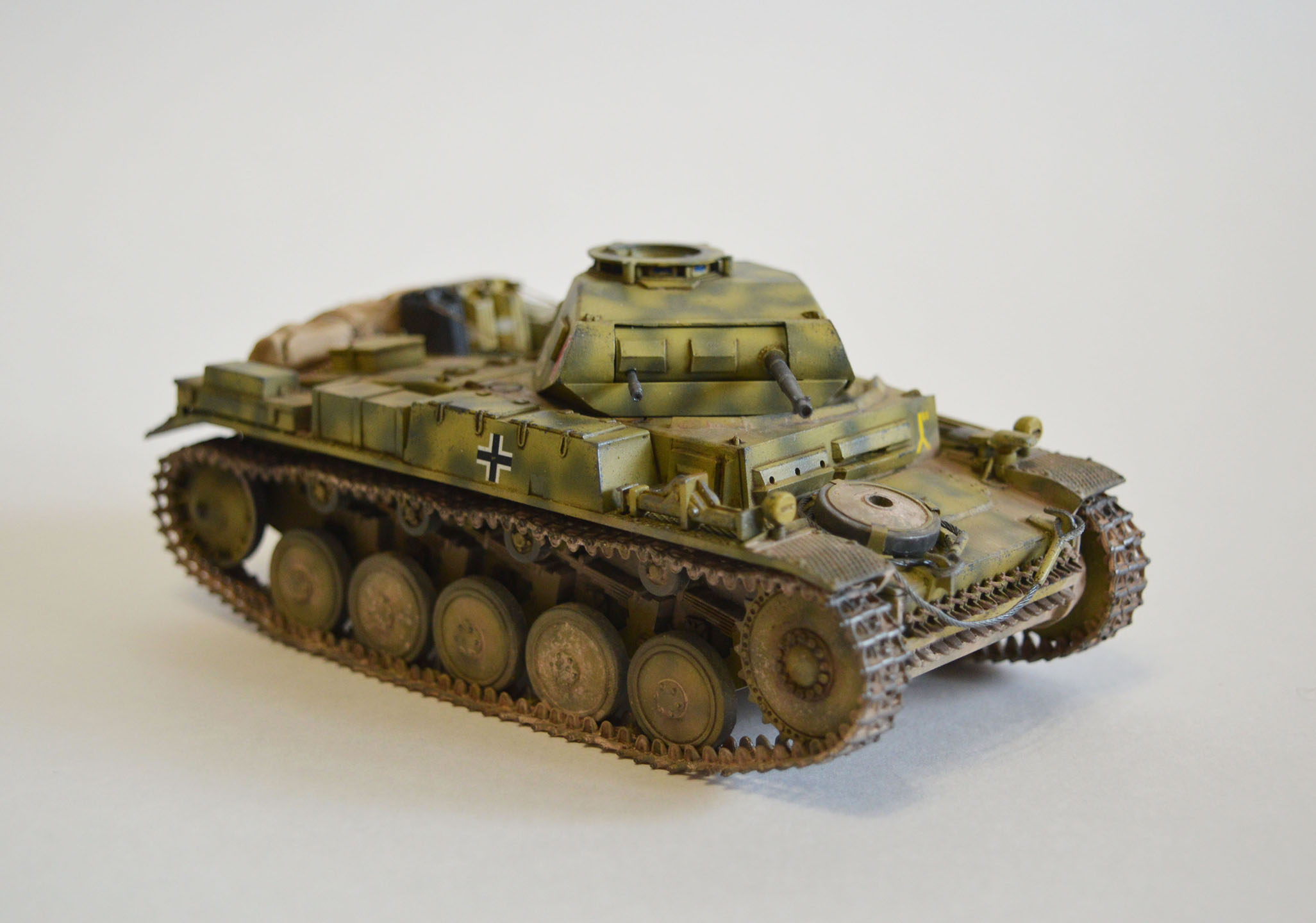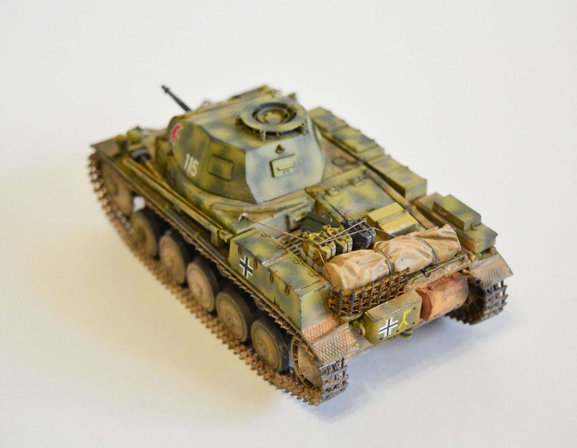 Мат. частью в этом древнейшем наборе от Тамии даже не пахнет- сборка упрощенная до нельзя, танк можно собрать за пол-часа! И тем не менее, автор умудрился сделать из этих дров вполне приятную глазу "Двоечку"! Замена траков явно пошла на пользу (резиновые из набора можно только в ведро), светомаскировка на фарах тоже в тему, барахло на корме далеко не лишнее, реально улучшает внешний вид модели. Единственный косяк по визуалке- эмблемы в виде медведей рисовались таким образом, чтоб изображенный медведь "шел" по ходу танка, соответственно на левой стороне башни изображение дано не правильно- но это уже косяк декалей!
