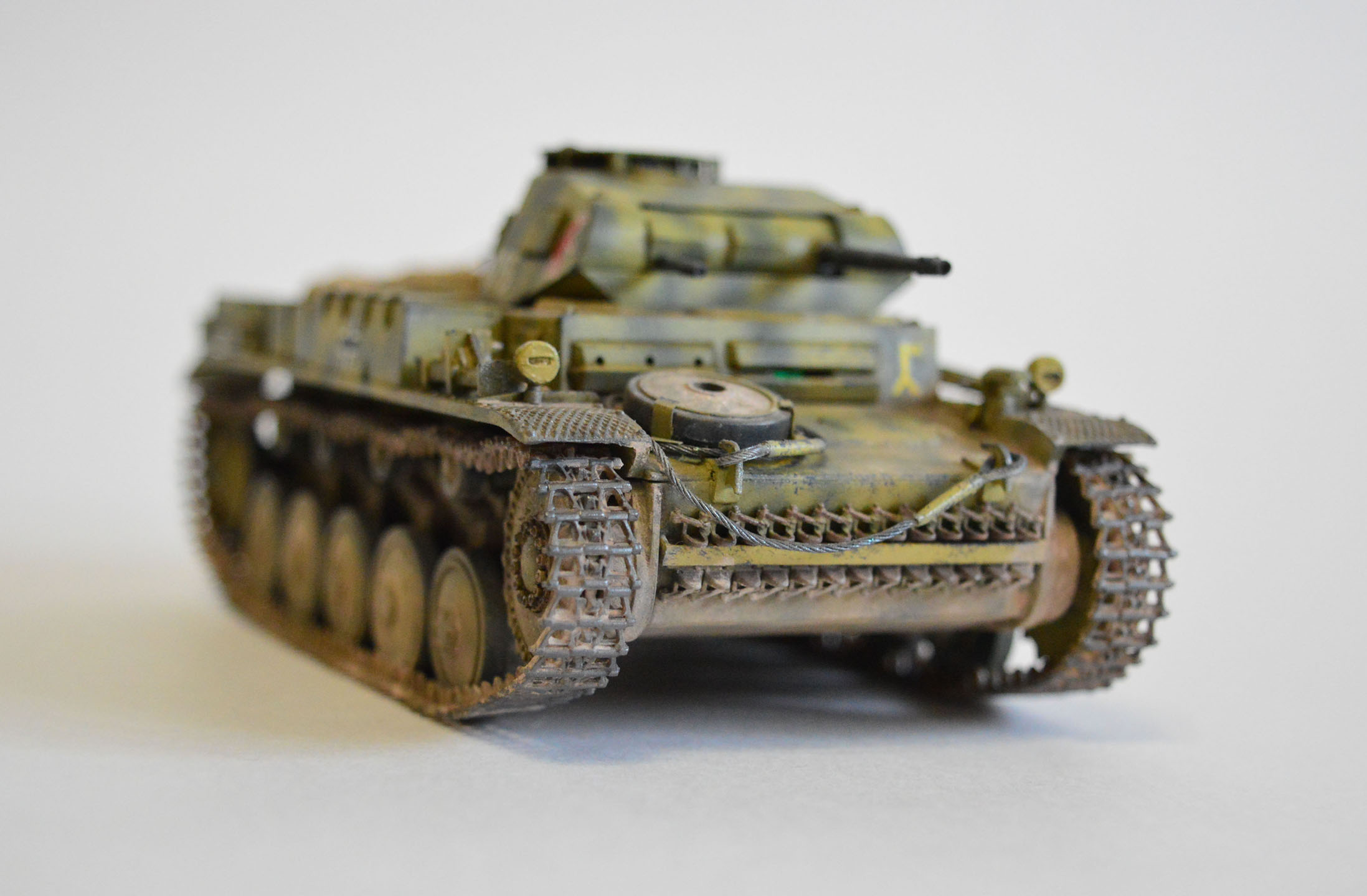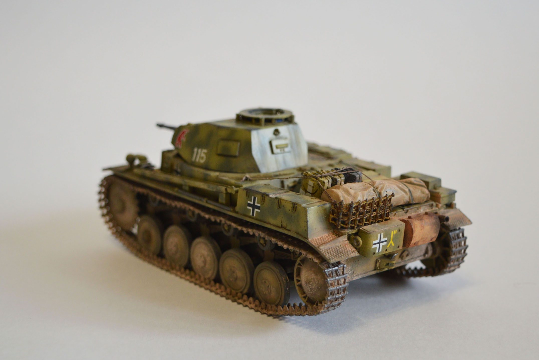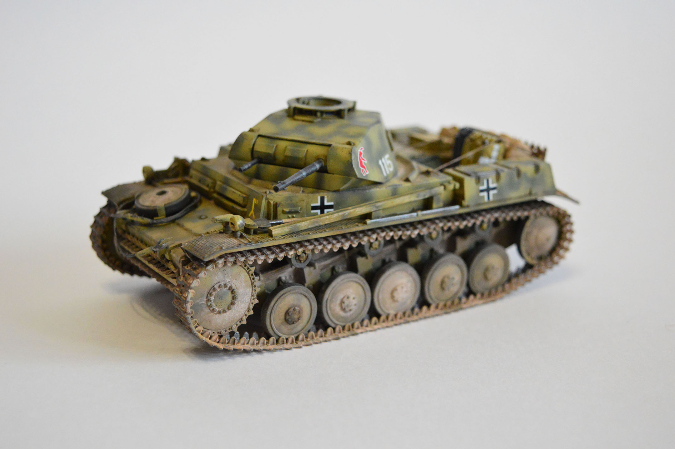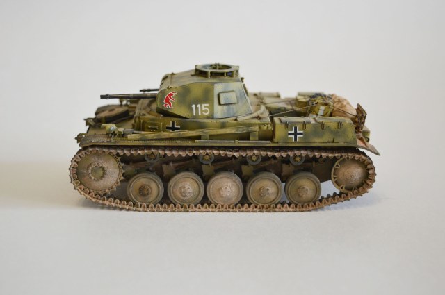 Мат. частью в этом древнейшем наборе от Тамии даже не пахнет- сборка упрощенная до нельзя, танк можно собрать за пол-часа! И тем не менее, автор умудрился сделать из этих дров вполне приятную глазу "Двоечку"! Замена траков явно пошла на пользу (резиновые из набора можно только в ведро), светомаскировка на фарах тоже в тему, барахло на корме далеко не лишнее, реально улучшает внешний вид модели. Единственный косяк по визуалке- эмблемы в виде медведей рисовались таким образом, чтоб изображенный медведь "шел" по ходу танка, соответственно на левой стороне башни изображение дано не правильно- но это уже косяк декалей!