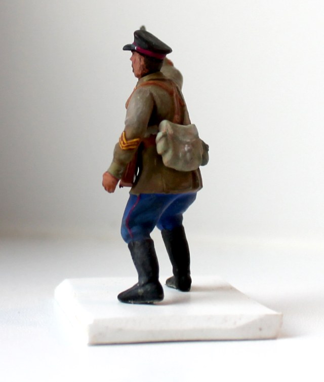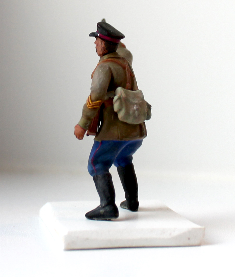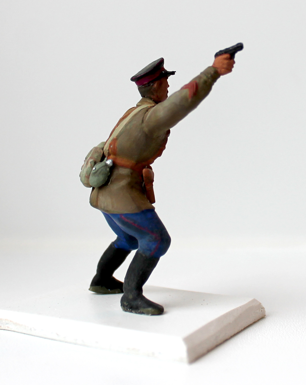 Вы на правильном пути. Смотрится поганенько, но это все из-за отвратительного качества самой фигуры. Добавляйте больше полутонов при росписи, затемнений складок одежды, высветлений выступающих частей униформы и амуниции. На предметах из кожи (ремни, портупеи, кобуры, полевые сумки ) тоже стоит поиграть цветами, добавить сухой кистью эффект потертости выступающих поверхностей, выделить металлические элементы снаряжения (скобы, пряжки, клепки, шпеньки). С цветом тульи фуражки Вы промахнулись- смотрится она черной, хотя как должна быть либо полевой зеленой, либо темно-синей (у войск НКВД). На околыше не хватает звездочки, рант и козырек фуражки можно сделать глянцевыми черными. Лицо так же требует тщательной росписи (тут лучше посмотреть видео- уроки по росписи лиц фигур), глаза следует делать меньше. Мне в свое время предложили следующий действенный способ прорисовки глаз- сначала рисуются глаза, причем белки делаются чуть-чуть розоватыми, не кипельно белыми, рисуется зрачок, а потом краской телесного цвета глаза как-бы прикрываются по краям до масштабного вида. Ну и на оружии на трущихся частях стоит выделять краской более светлого металла. С уважением