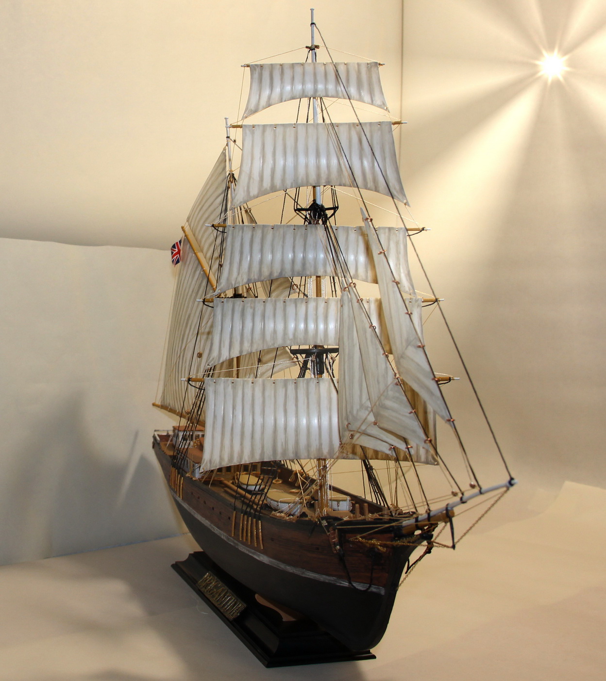 Сложное впечатление от модели. В целом не плохо получилось. Но на мой взгляд слишком грязновато, переборщили со смывкой. Где-то она есть, а где-то совсем нет. Цвет парусов понравился, но опять же слишком грязные как у парохода. Я бы рекомендовал Вам обратить внимание на цветные лаки Акан с имитацией дерева (тик или дуб) очень хорошо смотрятся на палубе. Несколько смущают медные кольца на которых крепятся лиселя, я использовал в схожем случае черную проволоку. Перо руля повешено верх ногами.