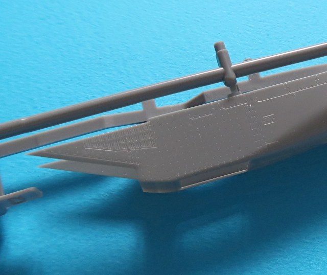 По остальной модельке - выпирающие плоскости, такие как блоки выброса помех, строевые огни и некоторые лючки доставили, выпирают (если умасштабить) на несколько сантиметров, хотя те же открытые блоки выброса помех должны быть немного утоплены.