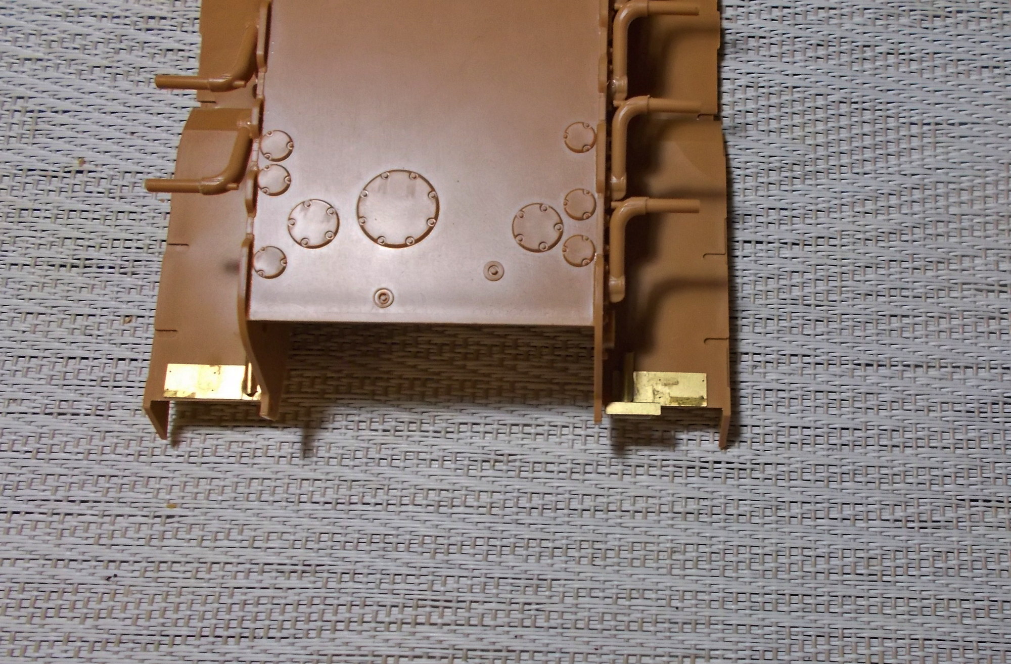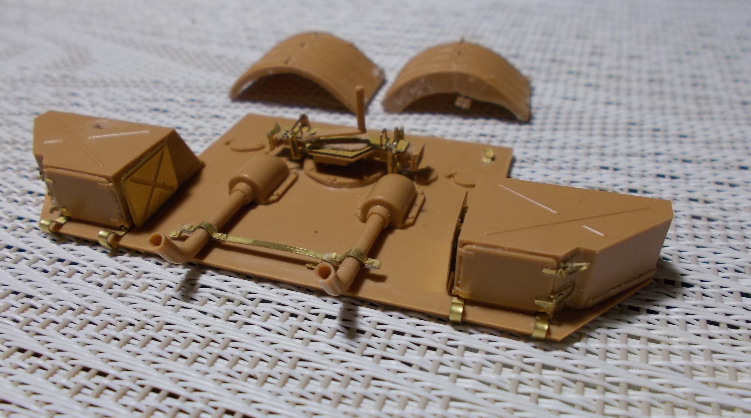 Лично мне из их травления потребуются всего скорей сетки, крепление выхлопных труб (которое вот кстати не совсем правильно в части держателя слева но это не проблема), цепь-фиксатор ствола, держатели зап.траков, цепочки - ну не знаю, я понял что они пробовали показать, но вышло такое себе, хитрая вот эта деталировка пластин под ящиками и держатель фары, немного мелкой деталировки всякой возьму на грязевые щитки и т.п., на корму. Годные гайки найдут себе применение. Рамки, держатели шанца и прочее - нет. Крепление огнетушителя - мудрёно немного вышло, но... я думаю, буду использовать. Застёжки их попробую посгибать, которые для ящиков: если пойдёт как надо - будет годно.