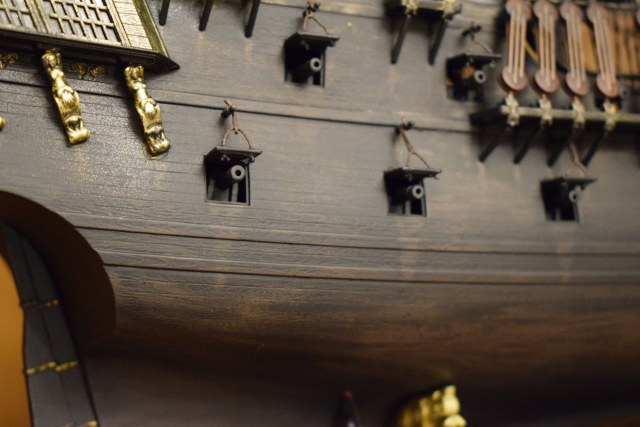 По содержанию, модель -"изкоробка", за исключением, разве что, освещения - провёл в каюту капитана свет - вклеил 3 светодиода 12В и провода вывел через палубу и отверстие в правом борту в подставку-ложемент.