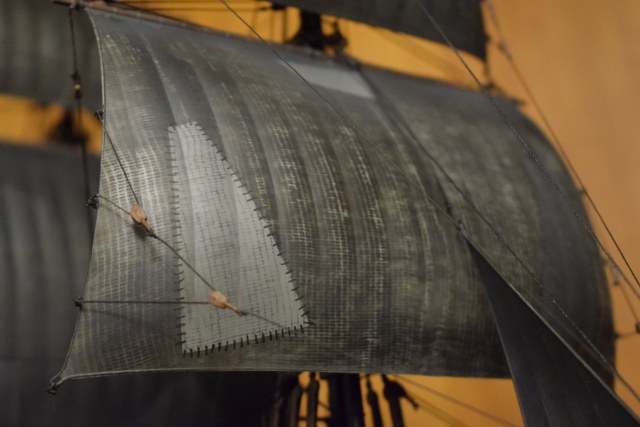 Пару слов о парусах. На мой взгляд, идея изготовителя показать наполненность паруса воздухом - удалась. Единственное, что я решил добавить - несколько заплат от былых сражений (корабль-то - боевой), да, текстуру ткани на парусах - задул из аэрографа серой краской поверх медицинского бинта. Кое-где получилось посредственно.