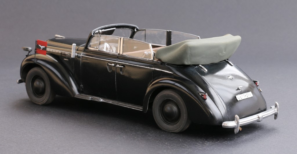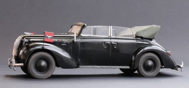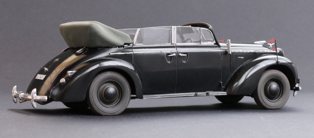 Долго не мог выбрать прототип, на который буду опираться при сборке, по итогу остановился на варианте Автомобиля Вернера Мёльдерса- лётчика аса. В связи с этим добавил пару отличительных особенностей- флаг и вымпел на передних крыльях (взял из набора от микродизайн арт.35537, дополнительная фара на бампере (скорее всего противотуманная), светомаскировка фар и соответствующий номер.