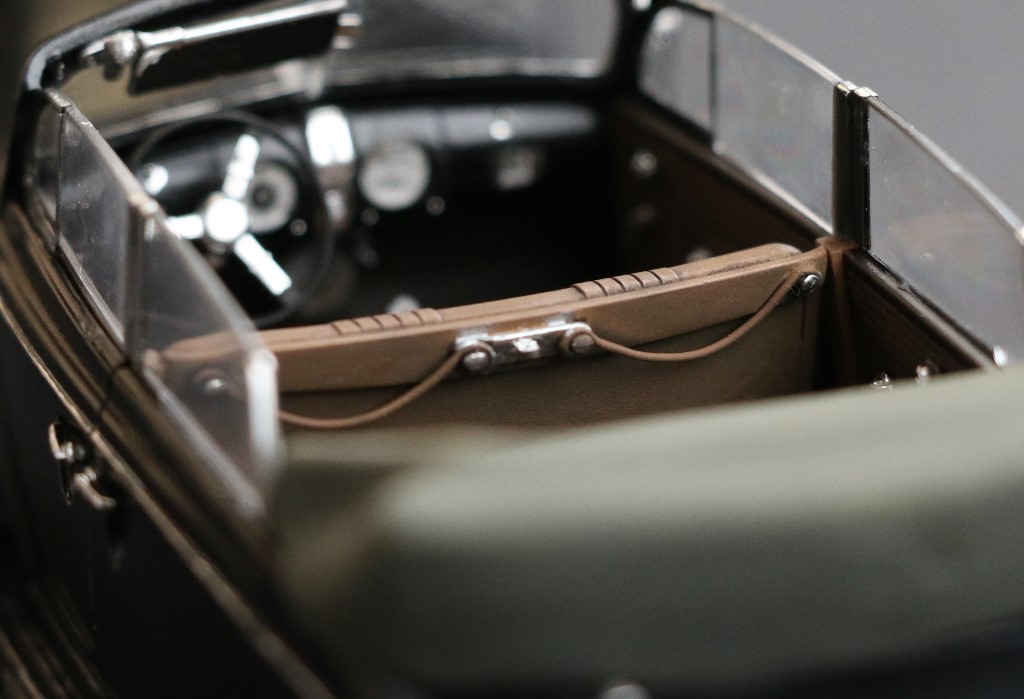 Что из доработок: частично исправил топливный бак (шёл за одно отлитый с днищем кузова), изготовил крепления для него, заменил изкоробочные зеркало заднего вида и дворники на фототравление Абер 35А121, изготовил из остатков травления педали и мелочёвку в салоне, "накинул" чехол из двухкомпонентки на сложенный мягкий верх.