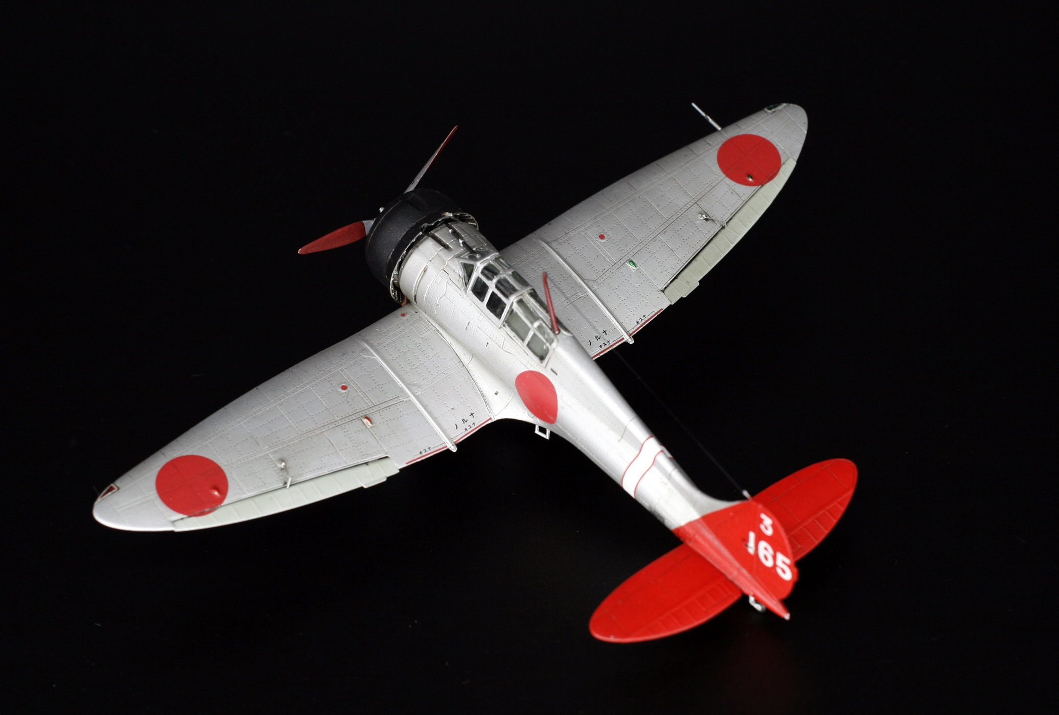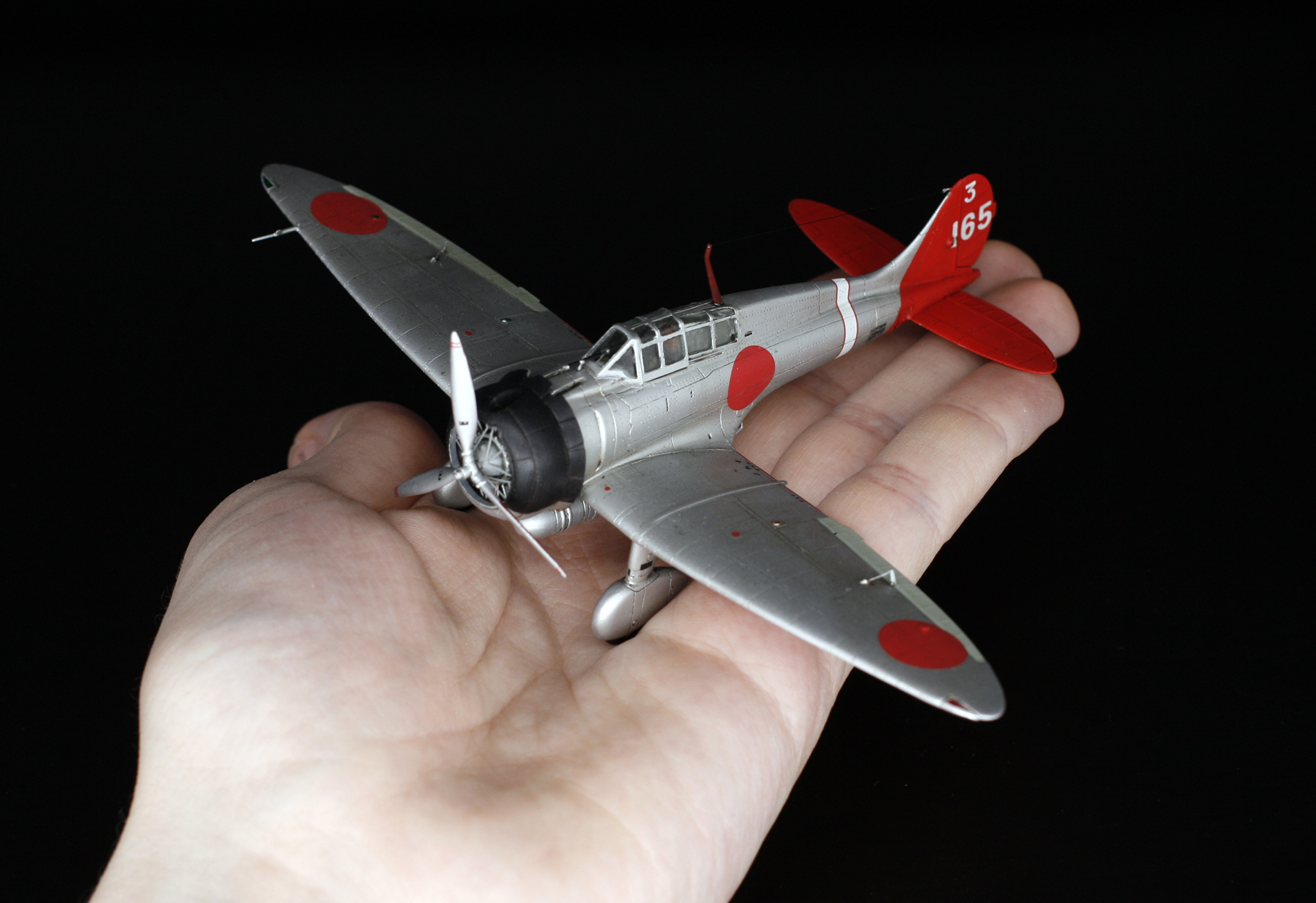 Потом закрыл все масками, и задул все алюминием от Мастер-Акрила. Кроме шуток - это чуть ли не лучший металлик среди водных акрилов. Мелкое зерно, приятный блеск. Затем покрасил всякие мелочи, вроде элеронов в серо-зеленый цвет грунтовки (японцы красили их так), патрубков в ржавчину, колес в черный.