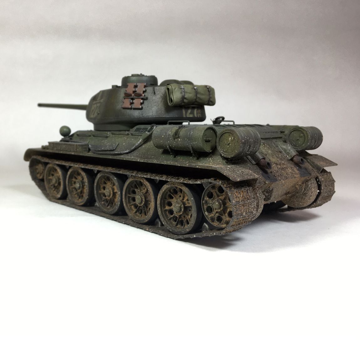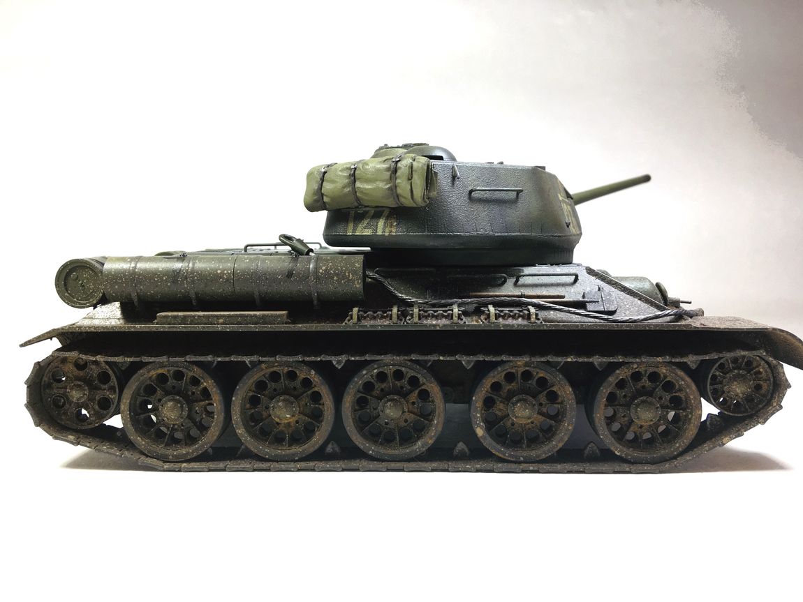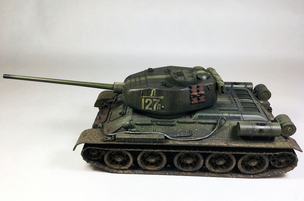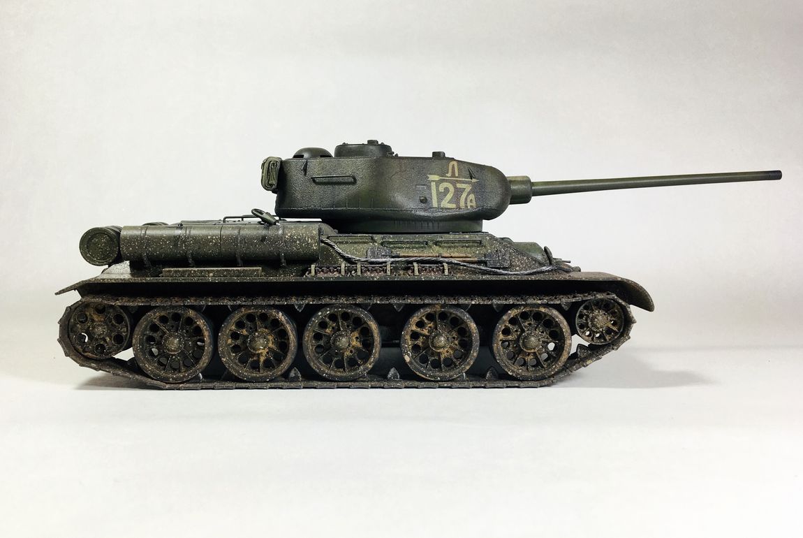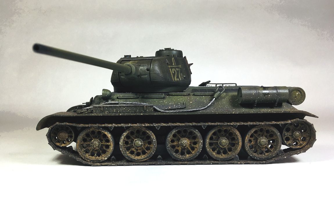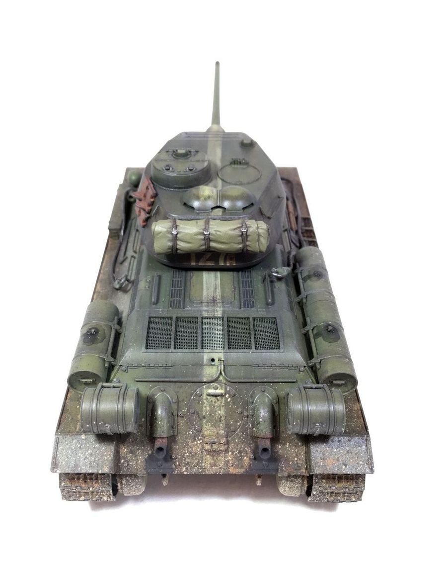 Здравствуйте уважаемые моделисты. Хочу представить вам свою модель танка Т-34-85.Модель собиралась из коробки.Сборка проблем не вызвала.Высверлил звуковой сигнал ,изменил крепление лопат,заменил фару на эльф,заменил скатку. Красил красками mr hobby и tamiya. После покраски нанес смывку и масляные точки. Далее погодные эффекты с помощью химии ammo mig и zip maket.В целом результатом доволен-но думаю что с везерингом перестарался-хотелось бы услышать ваше мнение. В этот раз печку ставит не стал. В матчасть не лез-основной задачей было аккуратно собрать,покрасить,нанести эффекты.Хотелось бы услышать от вас советы и замечания по модели. Модель на финише покрыта матовым лаком и не блестит, но на фотографиях виден блеск -отражение от ламп -накосячил с фотографированием,никак не научусь.