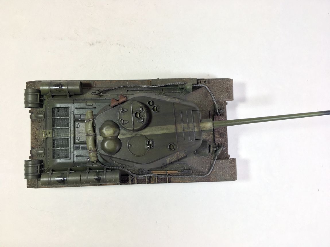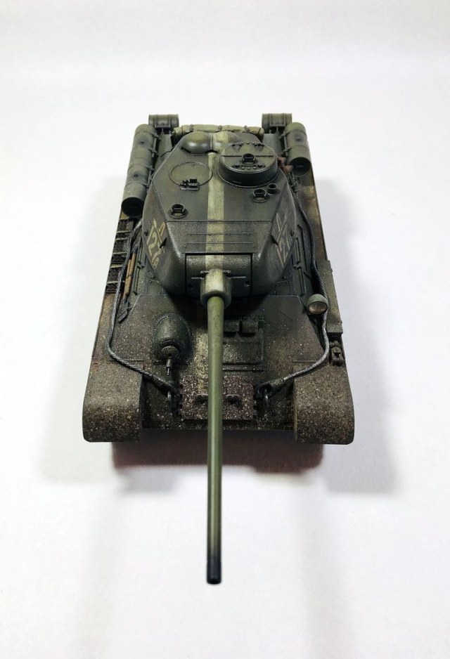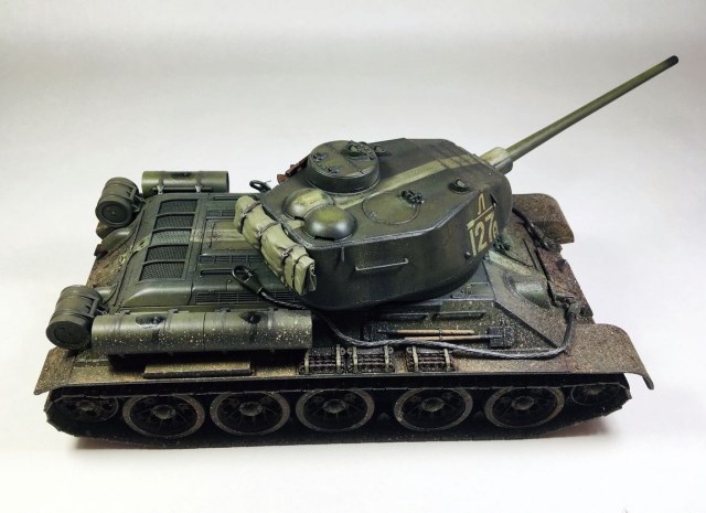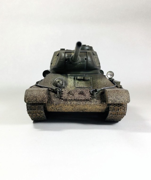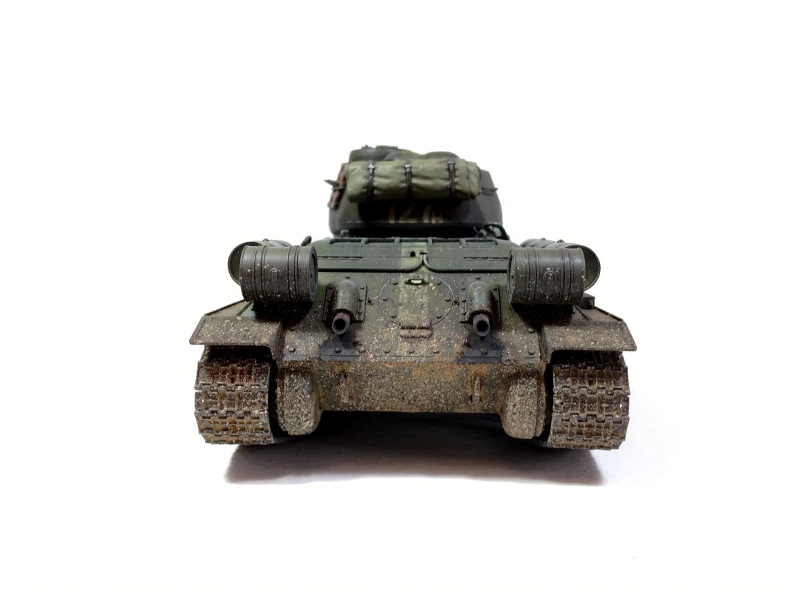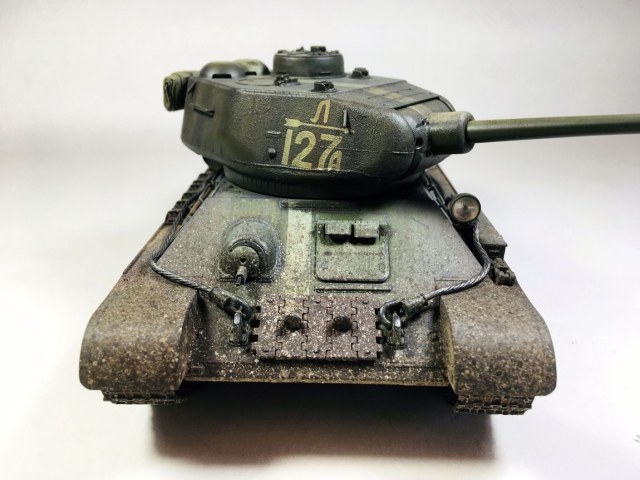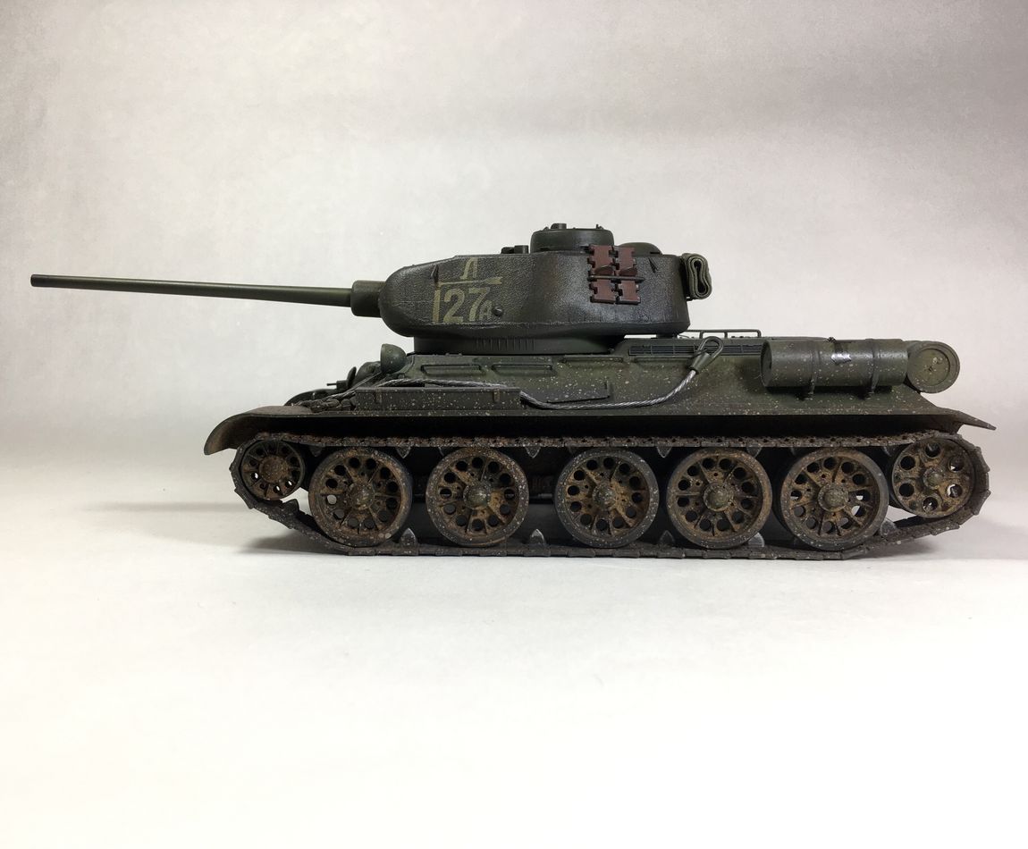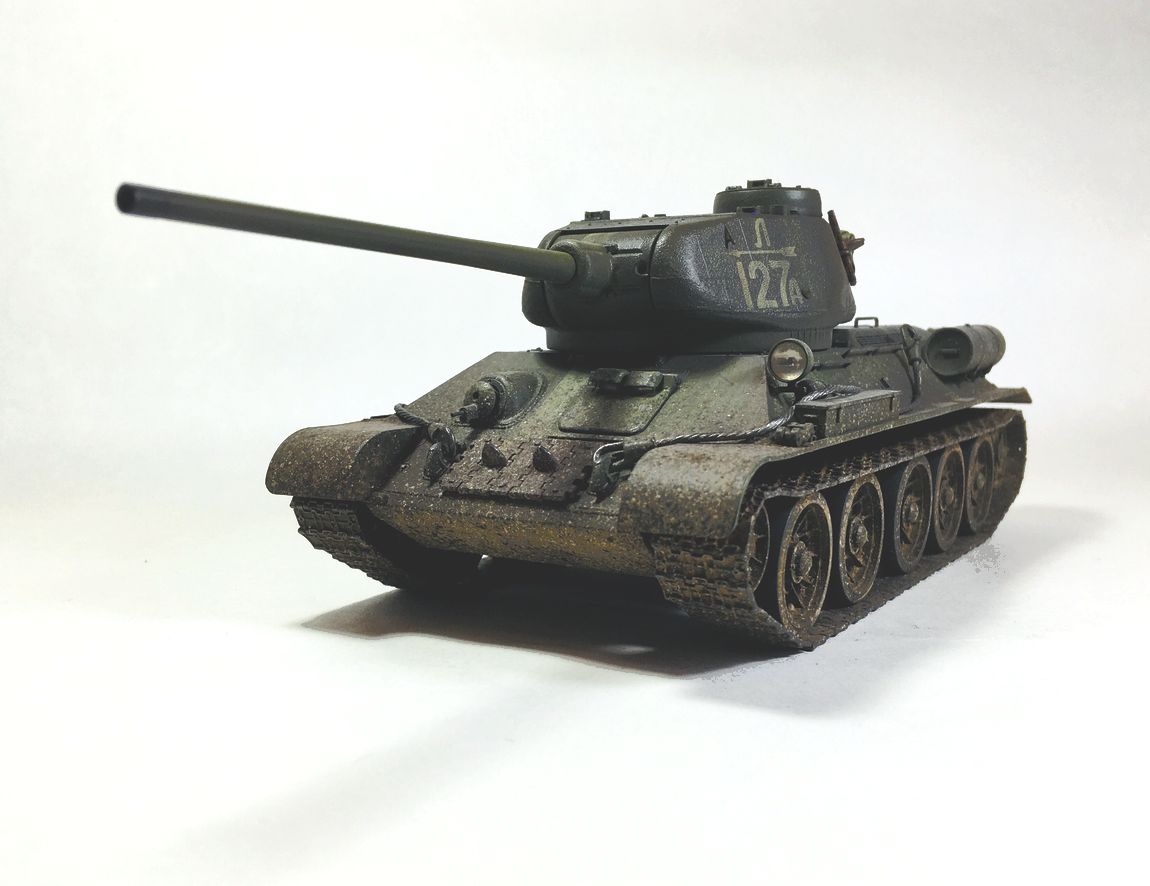 Здравствуйте уважаемые моделисты. Хочу представить вам свою модель танка Т-34-85.Модель собиралась из коробки.Сборка проблем не вызвала.Высверлил звуковой сигнал ,изменил крепление лопат,заменил фару на эльф,заменил скатку. Красил красками mr hobby и tamiya. После покраски нанес смывку и масляные точки. Далее погодные эффекты с помощью химии ammo mig и zip maket.В целом результатом доволен-но думаю что с везерингом перестарался-хотелось бы услышать ваше мнение. В этот раз печку ставит не стал. В матчасть не лез-основной задачей было аккуратно собрать,покрасить,нанести эффекты.Хотелось бы услышать от вас советы и замечания по модели. Модель на финише покрыта матовым лаком и не блестит, но на фотографиях виден блеск -отражение от ламп -накосячил с фотографированием,никак не научусь.