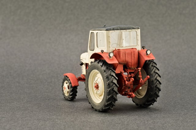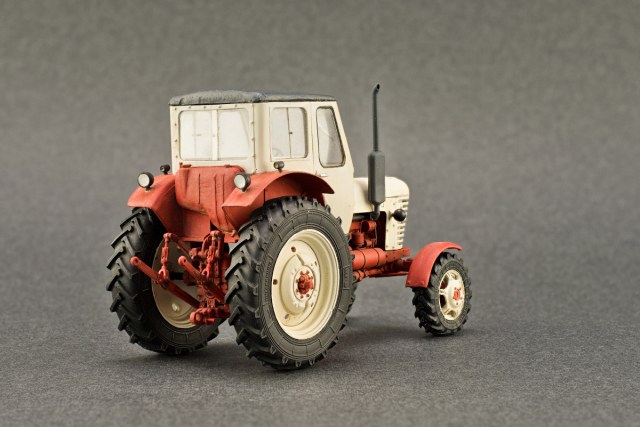 Осуществил свою давнюю мечту — запилить модель прекрасного трактора МТЗ-52 с круглым капотом и кабиной старого образца. Конечно, модель не претендует на копийность, это скорее импровизация, собирательный образ, но очень уж очаровательный вид имеет этот трактор. За основу был взят набор Балатона — МТЗ-82, от которого использовались ходовая, колеса, рама, двигатель и механизм задней навески. Доработок на удивление много, особенно повозился с передним мостом, где пришлось заново делать крылья и их крепеж, а так же рулевые сошки и тяги. Все это перешло от заднеприводной модификации и не подходило на версию с ведущим передним мостом. Детализация двигателя также оставляет желать лучшего. Мой МТЗ-52 получился не совсем пятьдесят вторым, так как двигатель на нем установлен от восьмидесятой серии — Д-240, ну, будем считать, что это такой сельский свап. Теперь верхняя часть, она из бумаги. Выражаю большую благодарность Денису (Modeller), развертки которого я взял за основу для создания кабины, капота и решетки радиатора. Несмотря на сложные формы, все собралось превосходно и встало на свои места, хоть и не с первого раза. Эту модель решено было сделать чистой, почти как музейный экспонат (оригинал в тракторном музее в Чебоксарах почти так и выглядит, но схему окраски я взял с какой-то фотографии). На двух фотографиях на крыше установлен вентилятор кабины, но в конце концов мне он не понравился и я его отодрал.