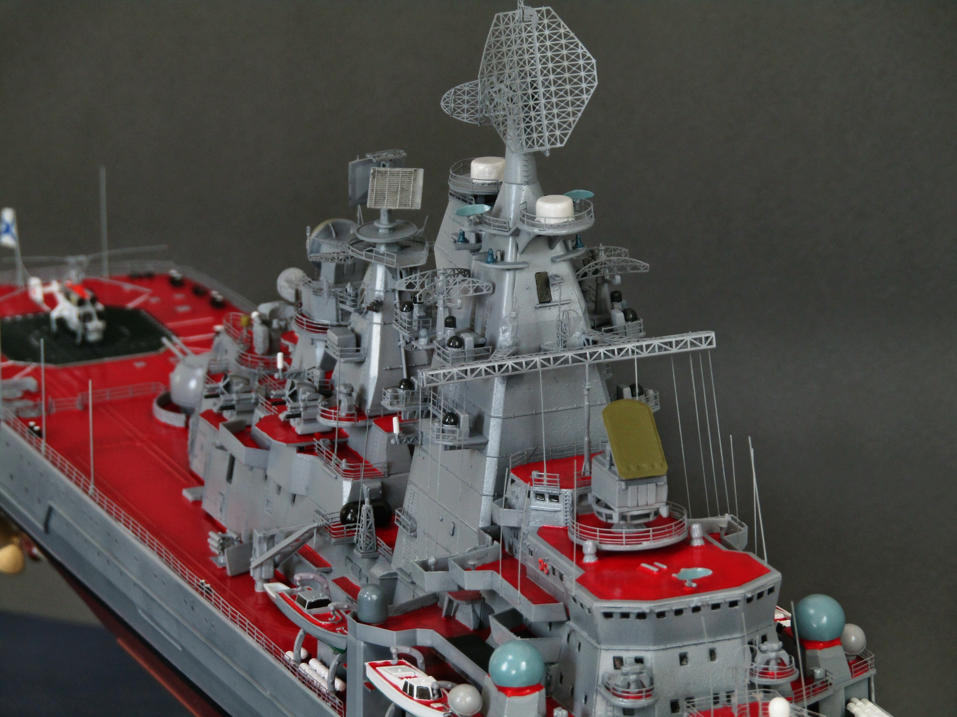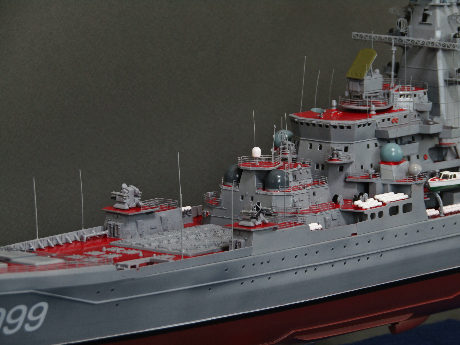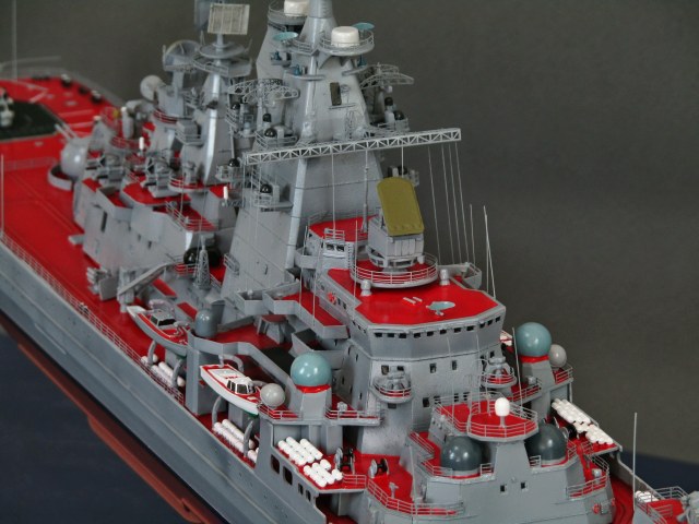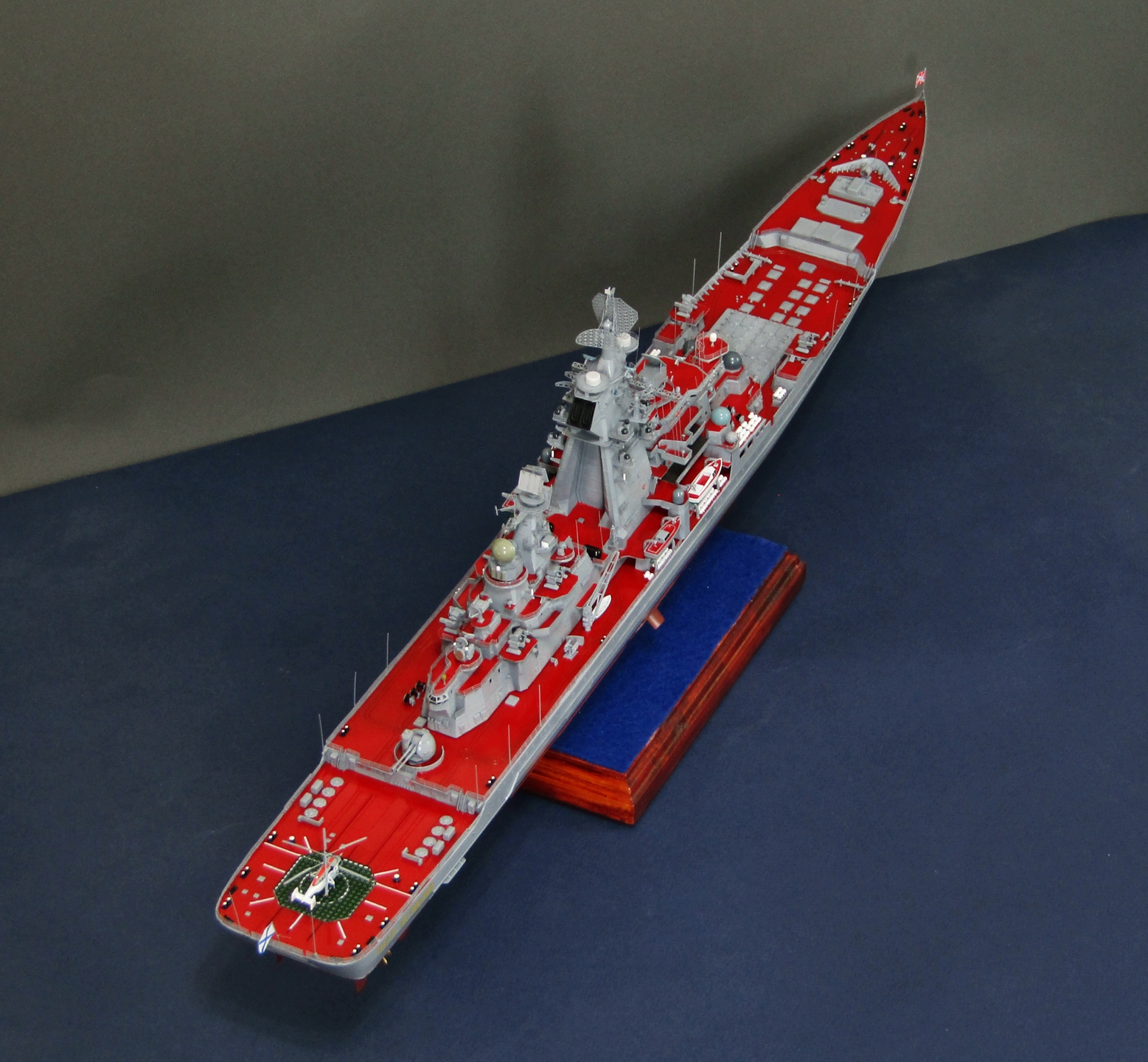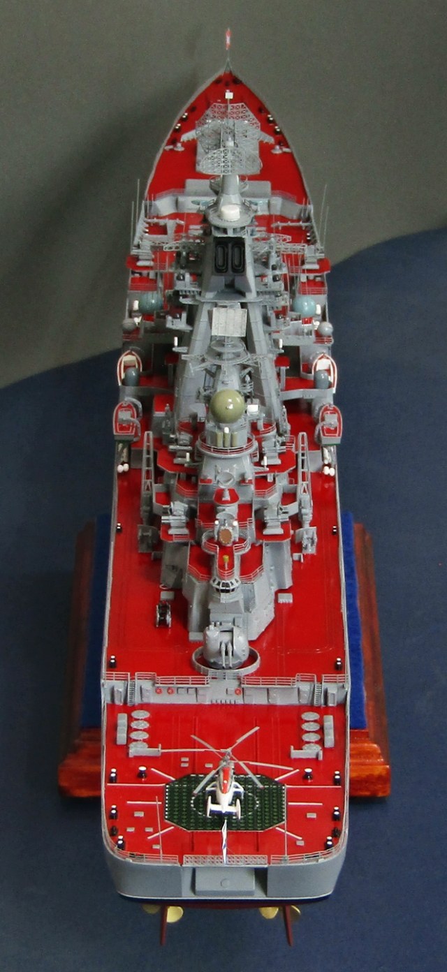 Андрей, палубу спасать надо срочно, а именно фильтром глушить малиновый цвет, борта тоже у же сказано, то что не видно в натуральную величину то видно на модели, кранцы матовый цвет а не глянец должен быть, есть не большая небрежность при сборке, а именно не проклеянные стыки, газоотбойники на РБУ установлены не совсем верно, дальше не буду продолжать, указал на то что на мой взгляд можно исправить, а общее впечатление для первого флотского опыта, модель, довольно таки хорошо выполнена, палуба своей ярко-малиновостью портит все впечатление, мне в общем модель нравится, Андрей желаю в дальнейшем успехов в нашем не легком творчестве и флот не оставляйте, в следуещей модели ждем стройку, которая пойдет всем на пользу, с уважением Павел.