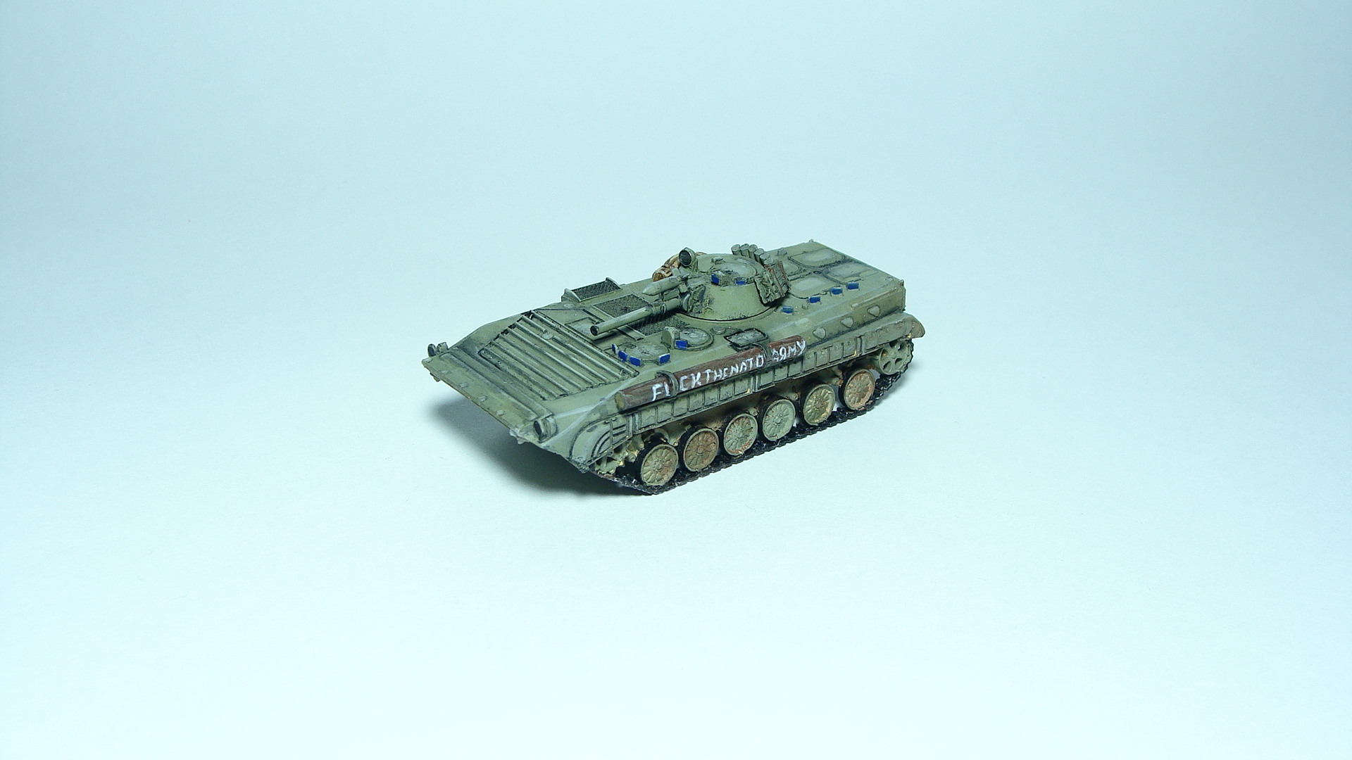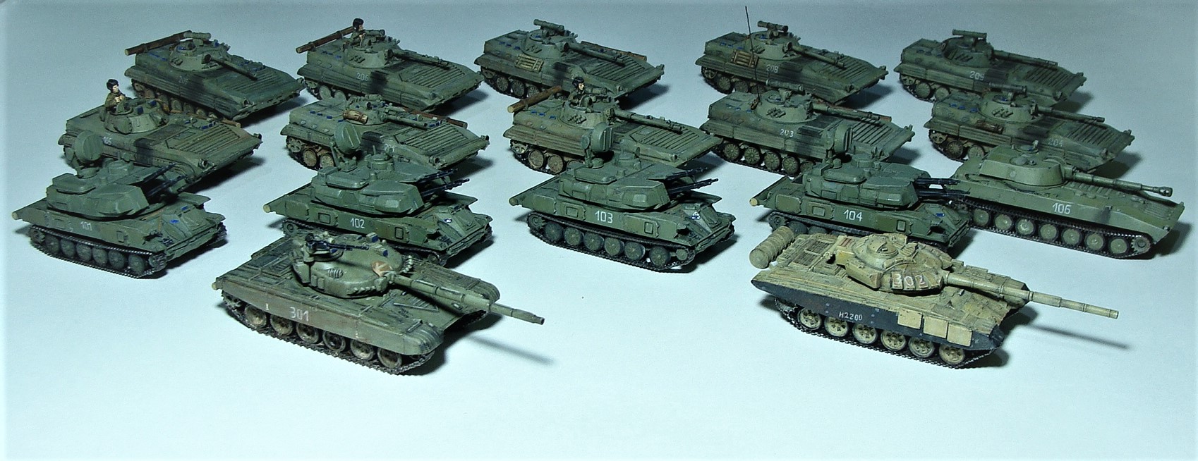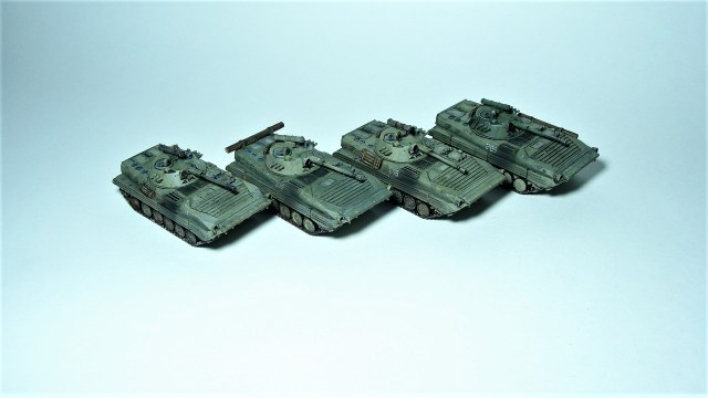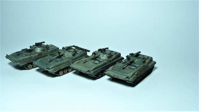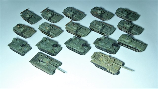 Миниатюры для мотострелкового ростера настольной игры Team Yankee (сейчас оно переименовалось, типа 3 world war, или как-то так), минимальная формация из 2 юнитов по 4 бмп-2 + командирская машина бмп-1 + поддержка юнит пво (4 шилки), артиллерия (гвоздика + наводчик в виде ПРП-3) и танковый юнит из т-72. По идее гвоздик и танков должно быть минимум 3, так что возможно будет позже дополнено новыми фото.