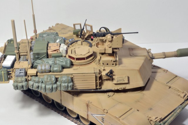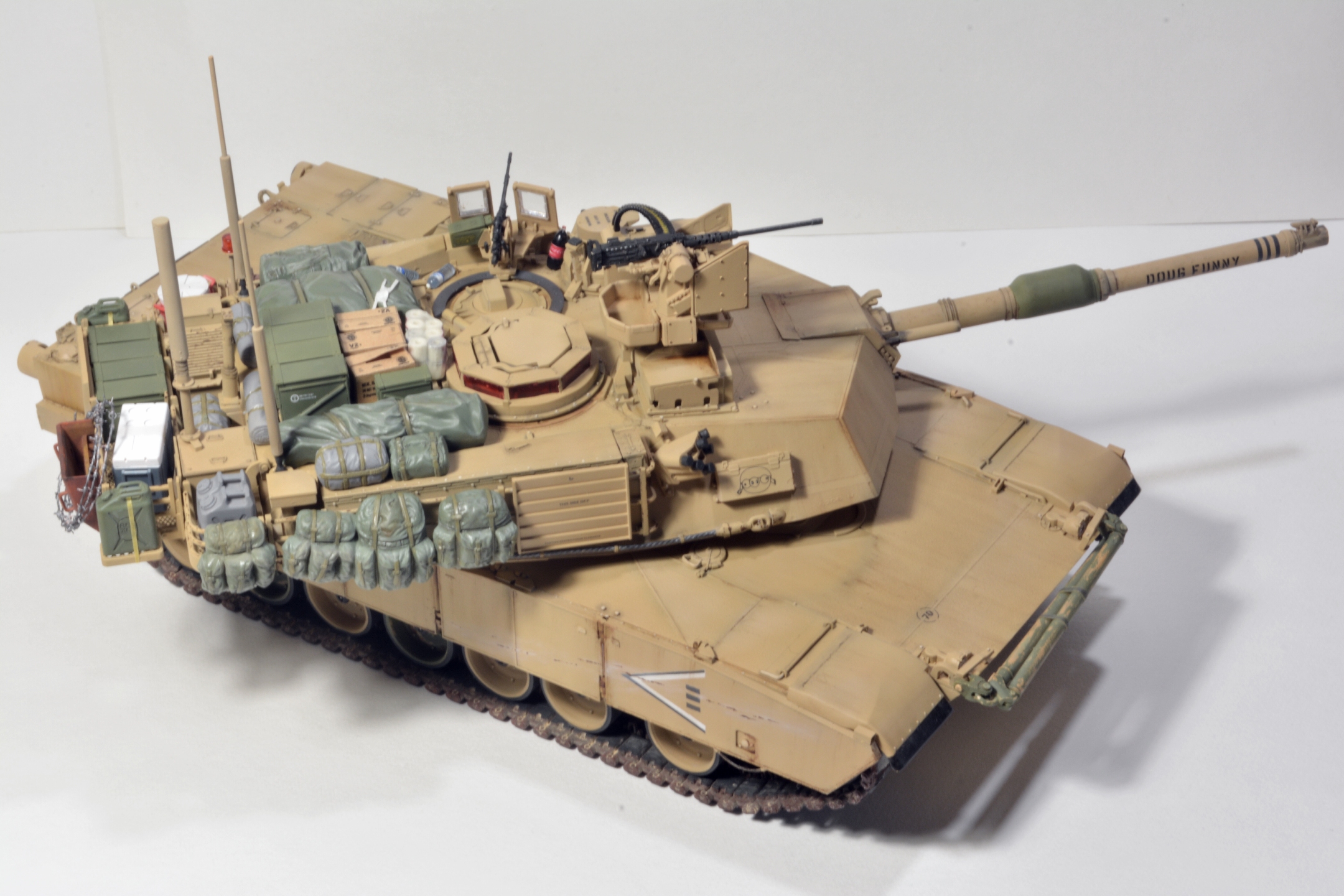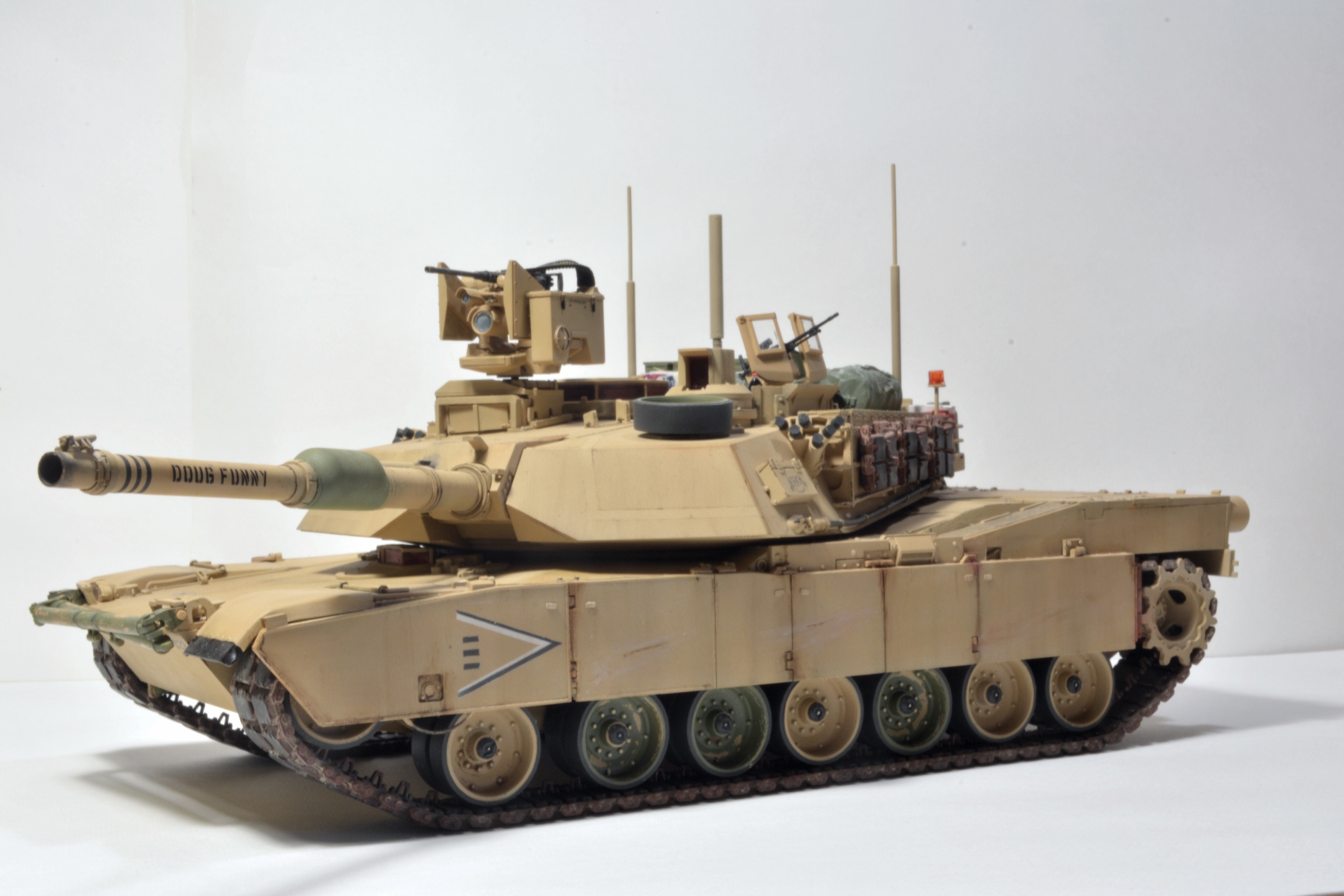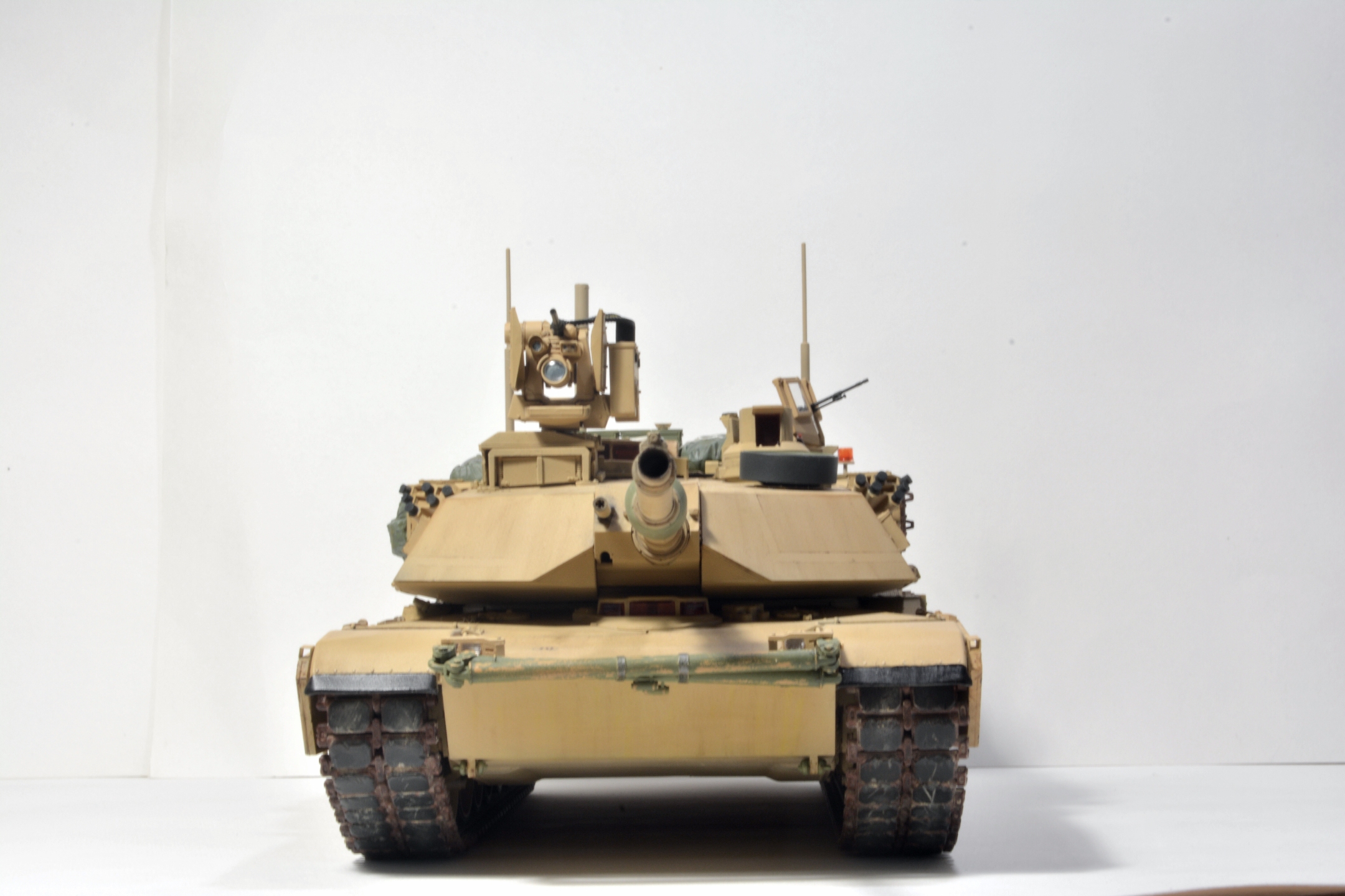 Абрамс хороший получился, но, есть вещи, которые я бы на вашем месте доделал. Первое про смывку - смывка/заливка/проливка, называйте как вам нравится, делается для выделения, да, всех "щелей", потому как это самый базовый способ показать детализацию какого-то узла или деталировки на плоскости. Для меня смывка не элемент эффектов, а элемент покраски (поскольку я делю цикл работ по модели на три модуля - сборка, покраска, эффекты). В реалиях машину могут мыть хоть двести раз на дню, но это не определяющий фактор, у вас модель в масштабе! Подчеркиваю, в масштабе, вам необходимо сделать так,чтобы зритель увидел все эти гаечки, щели и т.д., например, катки в пустынной базе у вас "лысые". Если вы хотите менять акценты, то смывок есть три вида - общая, точечная и мягкая.