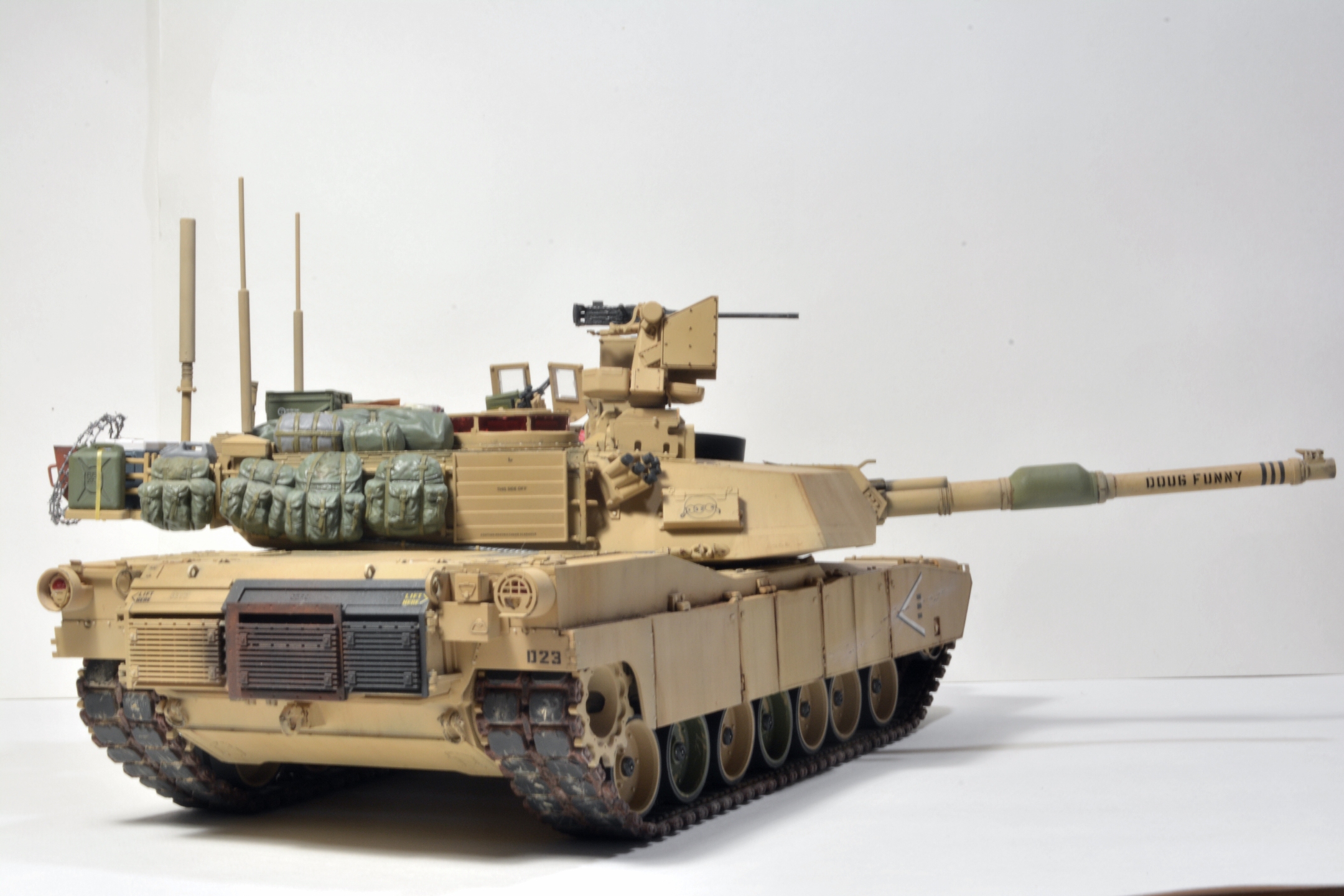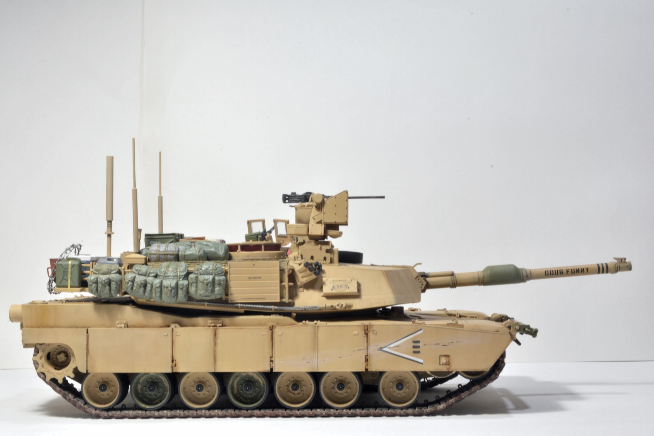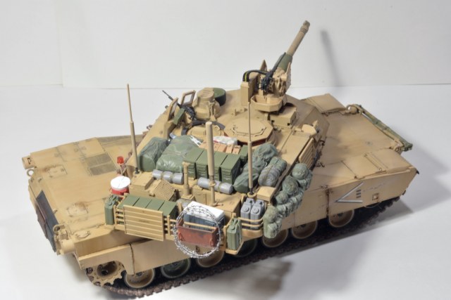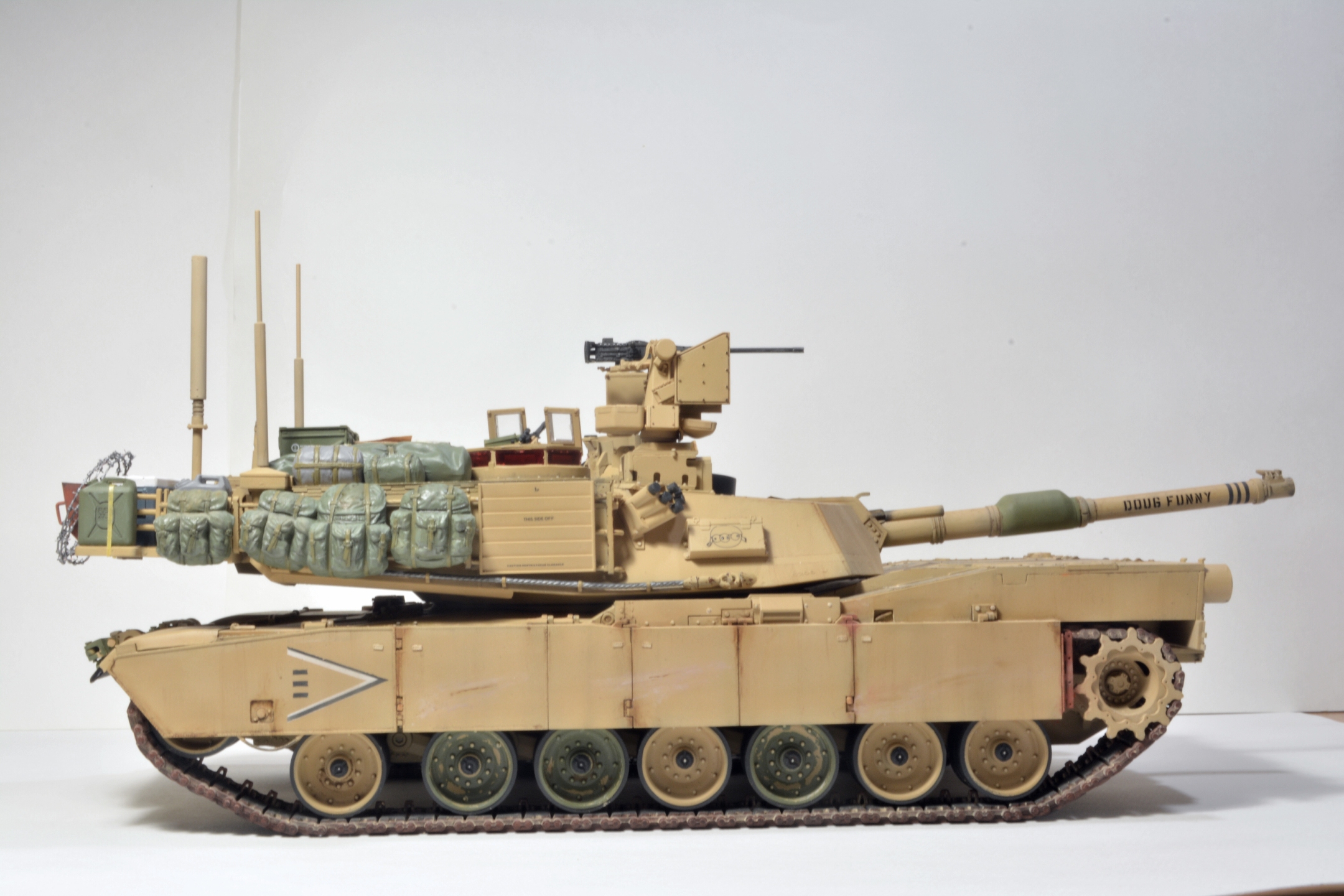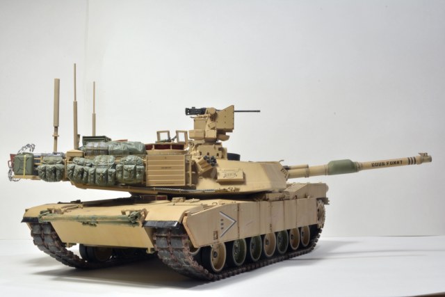 Абрамс хороший получился, но, есть вещи, которые я бы на вашем месте доделал. Первое про смывку - смывка/заливка/проливка, называйте как вам нравится, делается для выделения, да, всех "щелей", потому как это самый базовый способ показать детализацию какого-то узла или деталировки на плоскости. Для меня смывка не элемент эффектов, а элемент покраски (поскольку я делю цикл работ по модели на три модуля - сборка, покраска, эффекты). В реалиях машину могут мыть хоть двести раз на дню, но это не определяющий фактор, у вас модель в масштабе! Подчеркиваю, в масштабе, вам необходимо сделать так,чтобы зритель увидел все эти гаечки, щели и т.д., например, катки в пустынной базе у вас "лысые". Если вы хотите менять акценты, то смывок есть три вида - общая, точечная и мягкая.