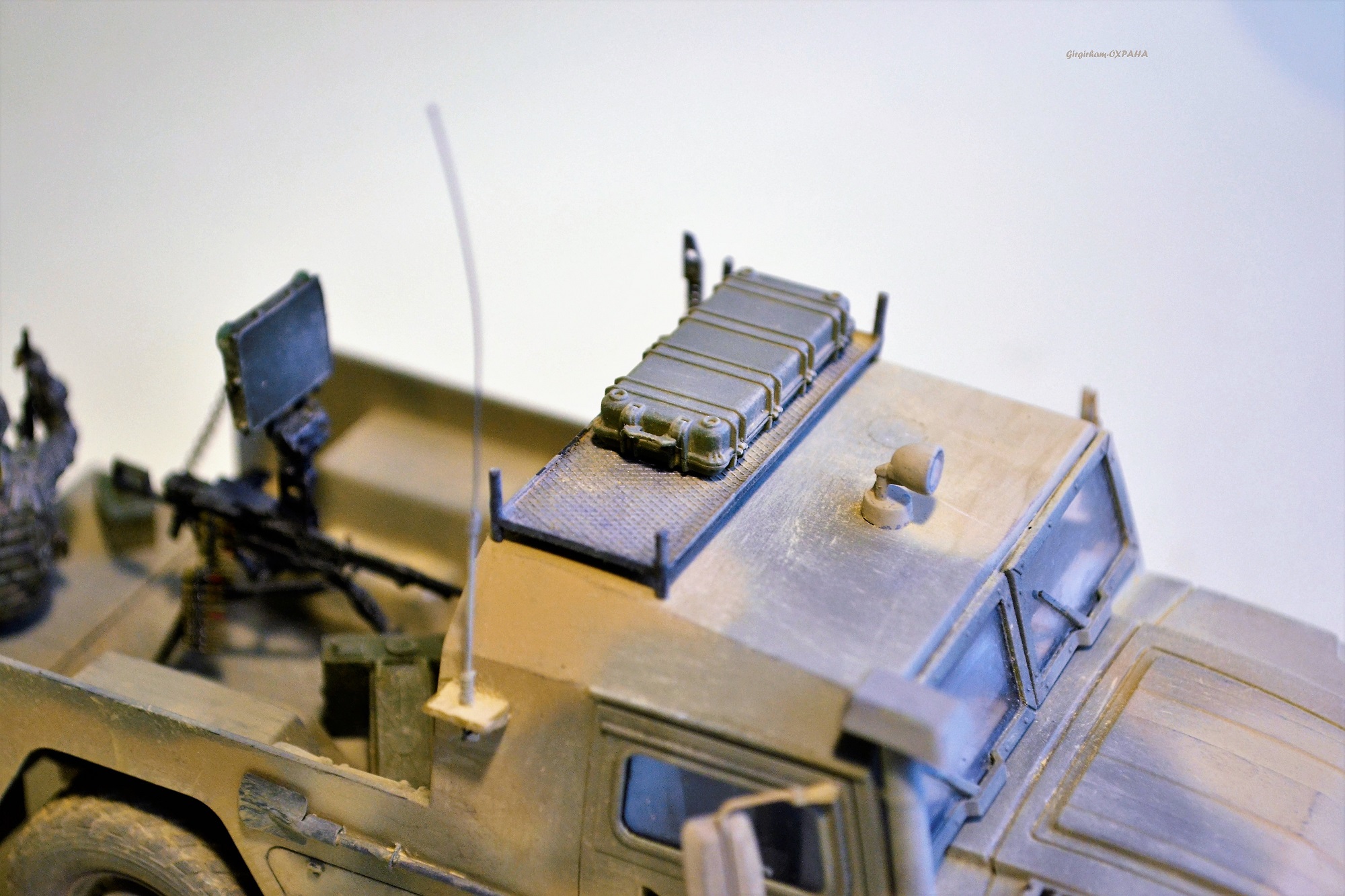 Удалена часть грузового отделения, создана перегородка отделяющая кабину от кузова, настил кузова сделан из имитации профнастила от компании LionRoar, цепочка от какой-то бижутерии, багажник на крыше и ящик в кузове самоделка, антенна самоделка (стальная проволока 0,4мм и 0,2мм).