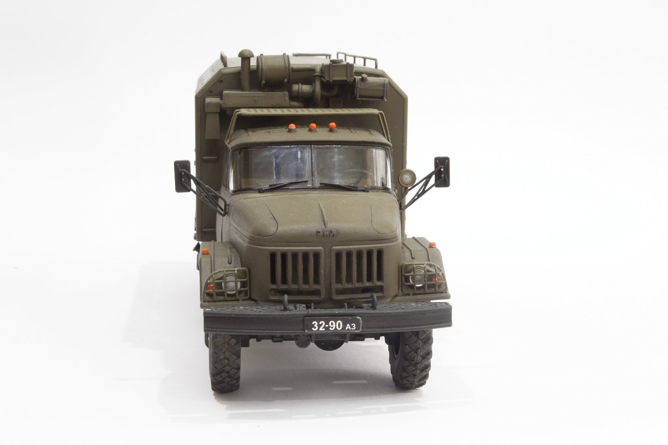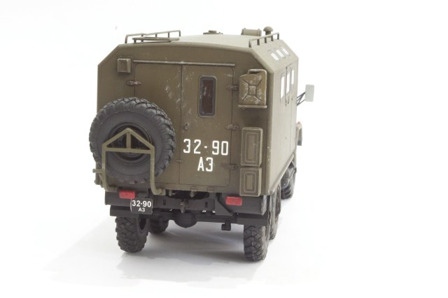 Есть небольшие нюансы которые глаз цепляют; отсутствие верхнего поручня КУНГа, запасное колесо криво закреплено на держателе, корус фары-искателя лучше в черный цвет - навесное оборудование, передние габаритные огни и задние фонари в одном цвете - должны быть двухцветными.