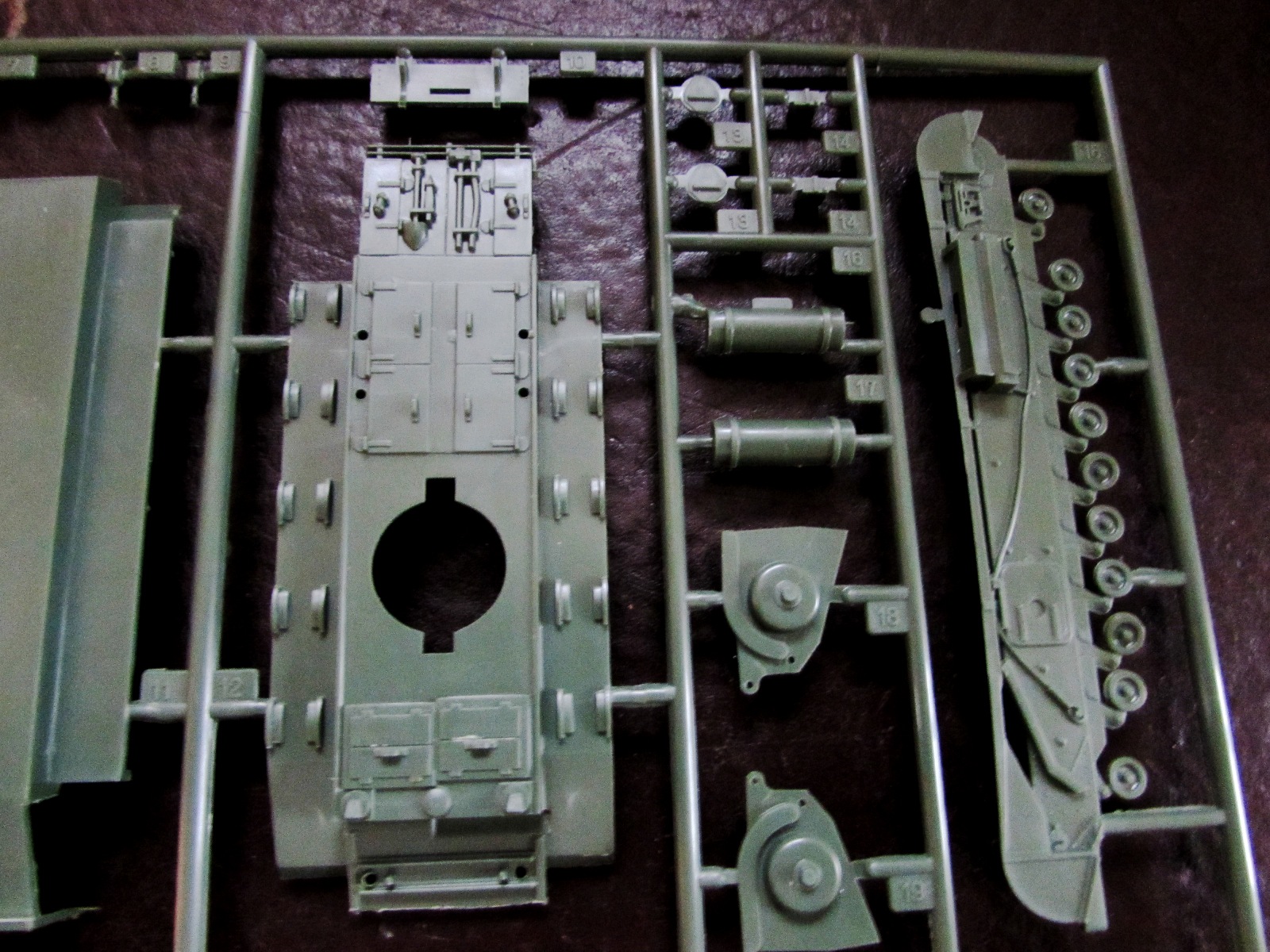 Правда, косяков у данной модели тоже много. Это и абсолютно корявая башня, портящая вид всей собранной модели, и толкатели с наружней стороны деталей (верх корпуса и ВЛД, можете увидеть на фото), и убогие бак и ствол - прилично, в общем. Ну и, конечно, те самые надгусеничные полки - их стыковка просто ужасает. Но при определенном уровне дополнений и шпатлевки данная модель может выглядеть достойно даже для нашего избалованного времени.