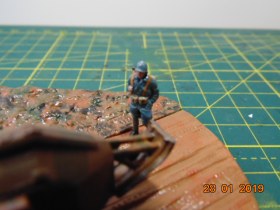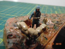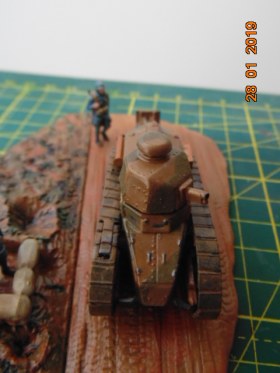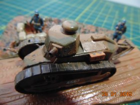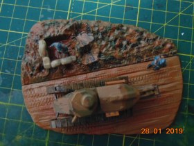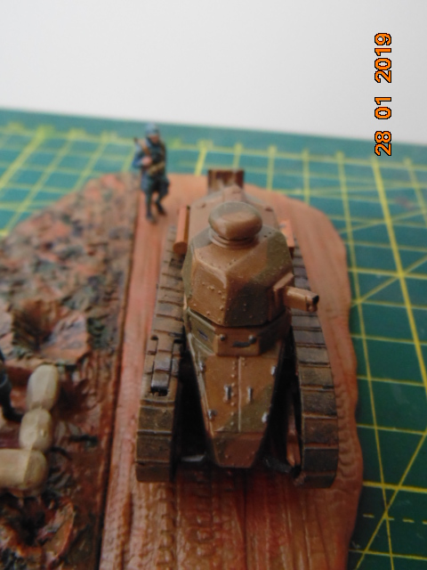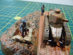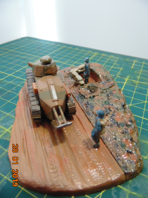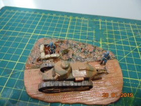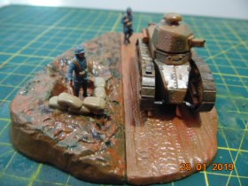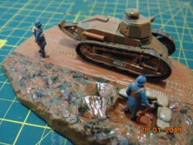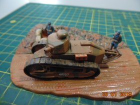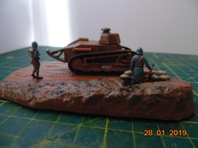 История такова: от одного знакомого мне досталась груда бесформенного пластика в коробке, когда стал разбираться, понял что из этого можно восстановить Рено FT 17, также есть подставка и фигурки - вот и сделал такую виньетку.