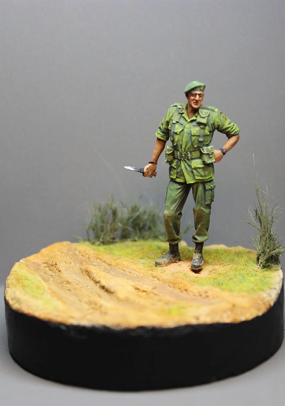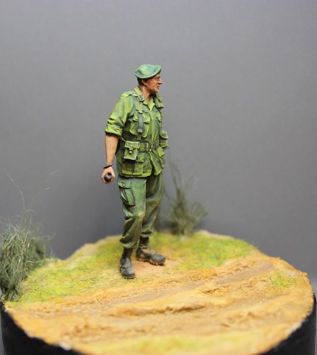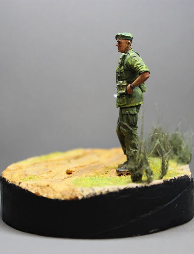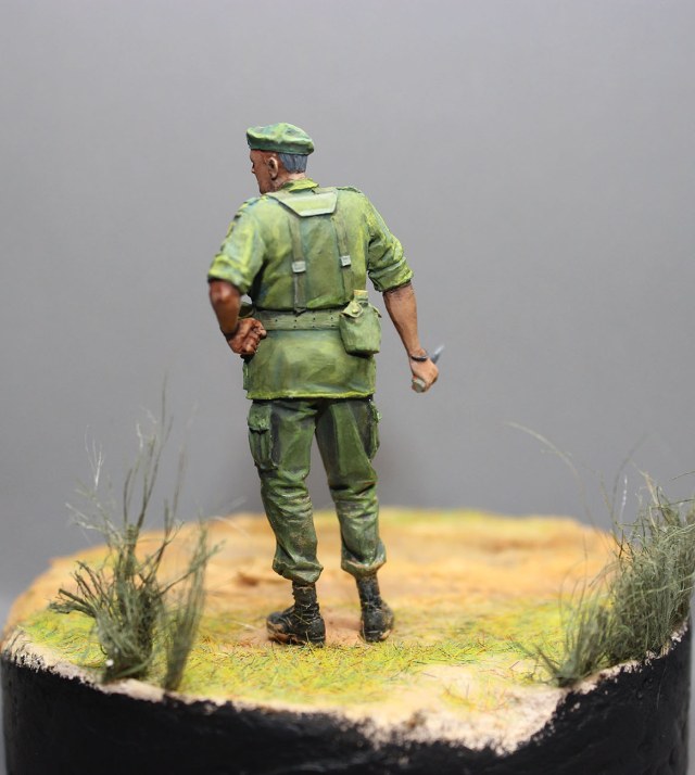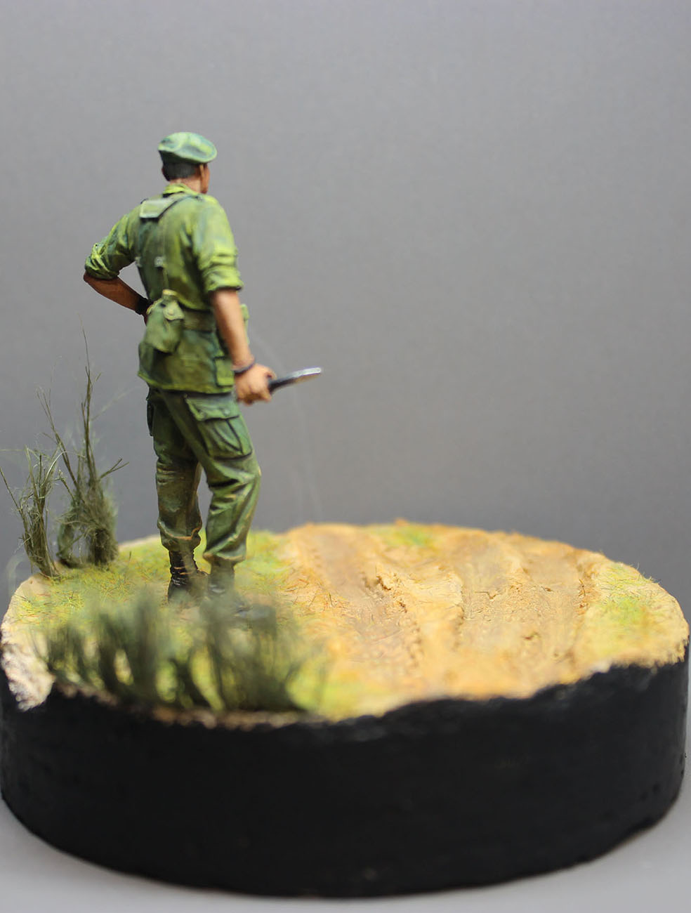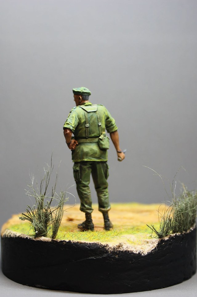 По модели: литье миниатюры мне понравилось. Оно выполнено из смолы с хорошей детализацией человеческого тела, физиономии, амуниции. Из замечаний хотелось бы отметить проблемы с карабином М16 "вьетнамского периода", который по задумке автора должен был находиться в правой руке миниатюры. При отделении карабина от литников, он раскрошился на множество частей. По этому, я решил, вставить в руку офицеру штык-нож М9.