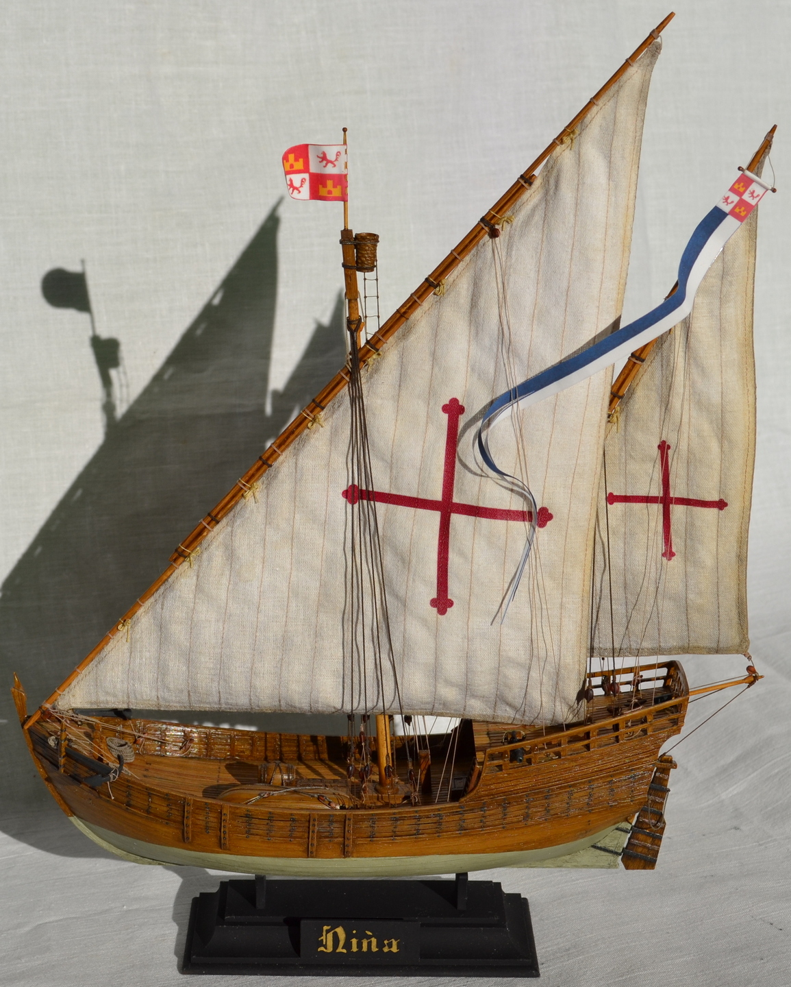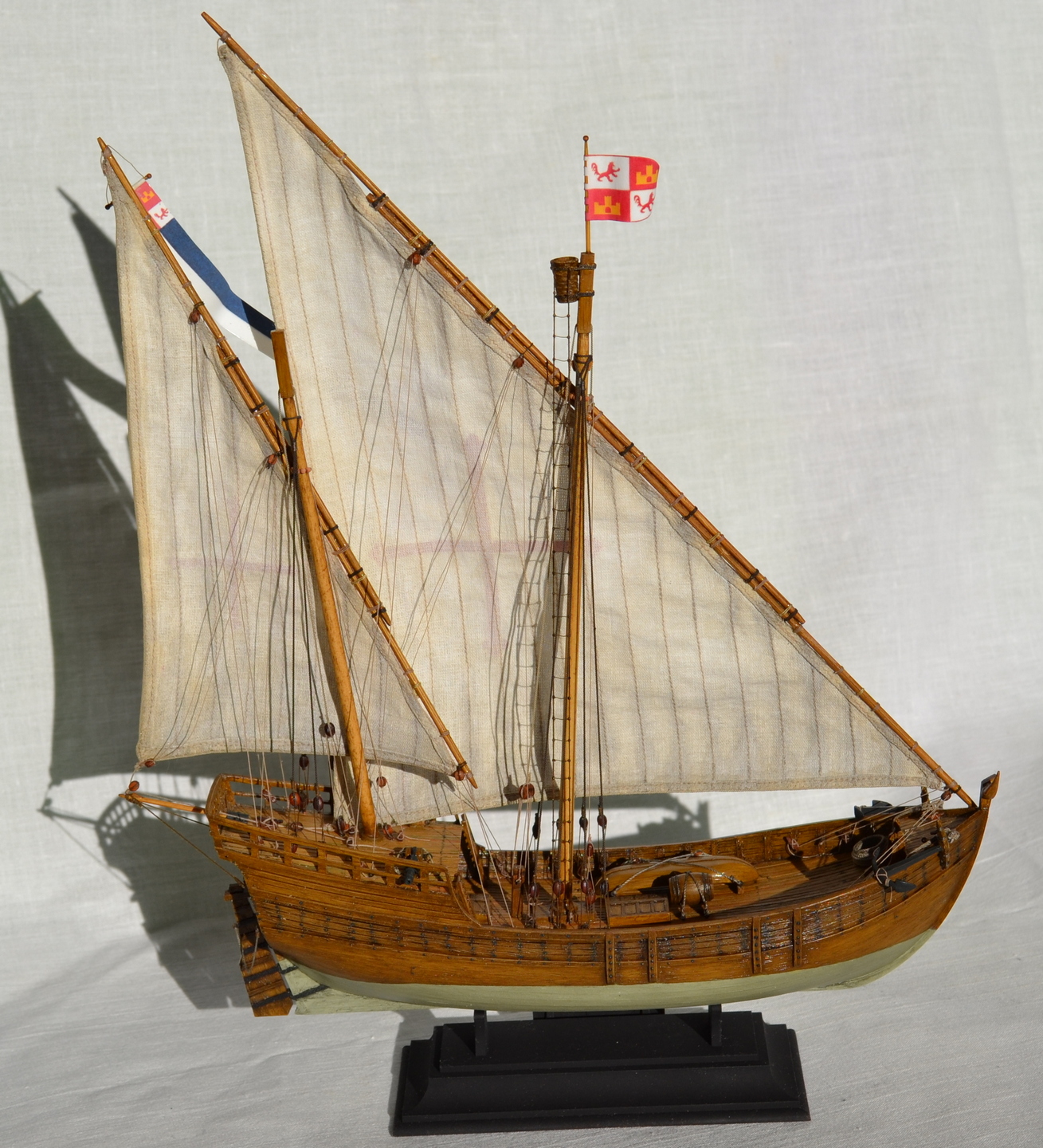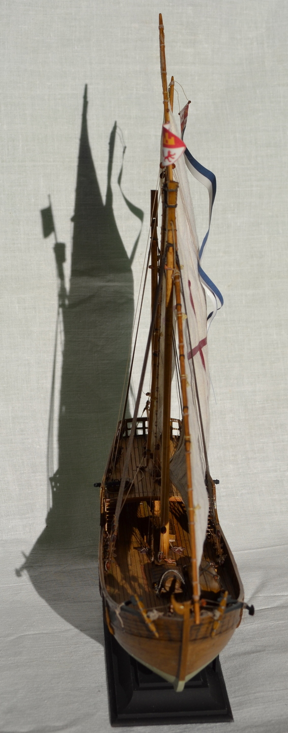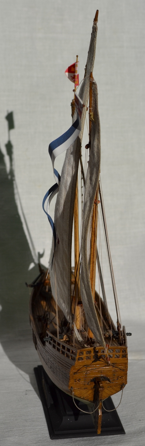 В работе использовал X. Pastor "Ships of Cristopher Columbus" серии "Анатомия кораблей" - сделаны деревянные мачты, размеры блоков и такелаж посчитаны при помощи таблиц в "Моделях исторических кораблей" В. Монфельда, корпус покрашен масляными красками с применением фильтров и смывки, паруса - ткань, тонированная по методу В. Ждана, кресты на парусах - нанесены при помощи термобумаги и утюга.