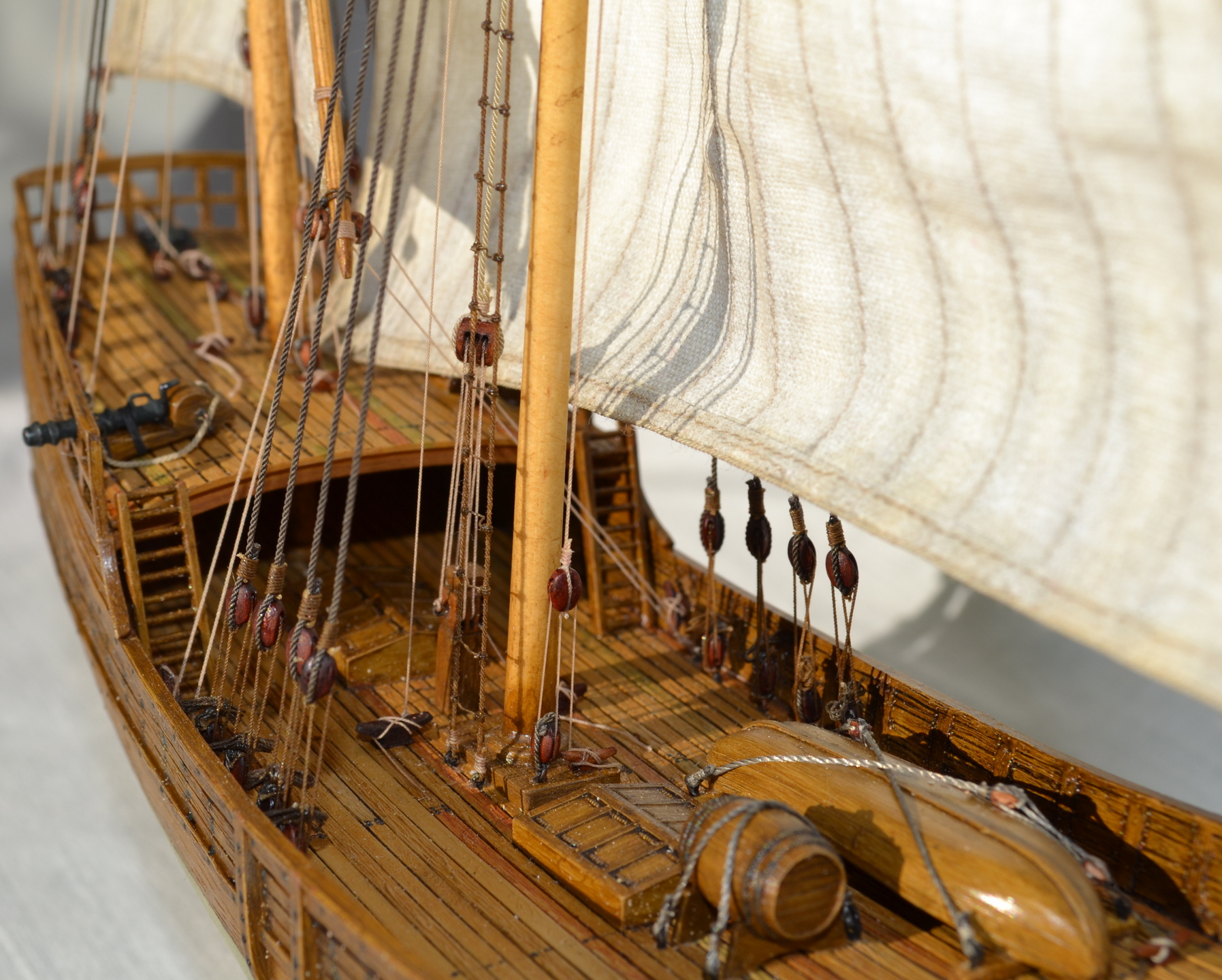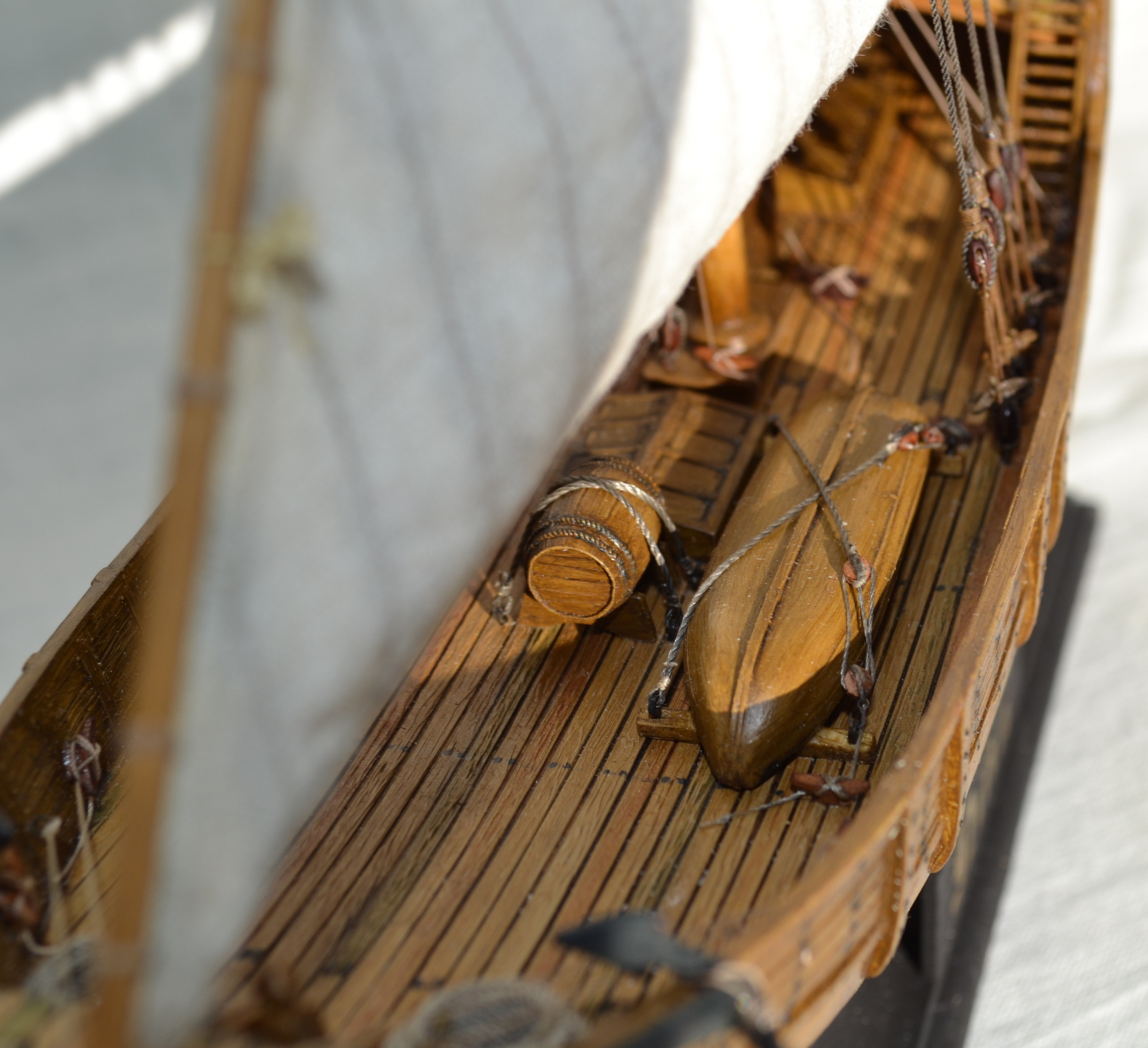 Покрашен корабль хорошо, паруса зачётные такелаж внушает. Наполнение палубы, бочка (Уррр-а я всегда топлю за бочки)