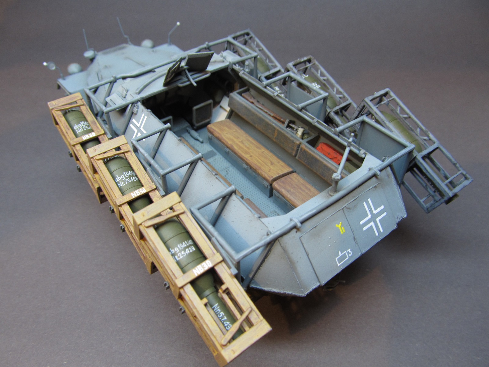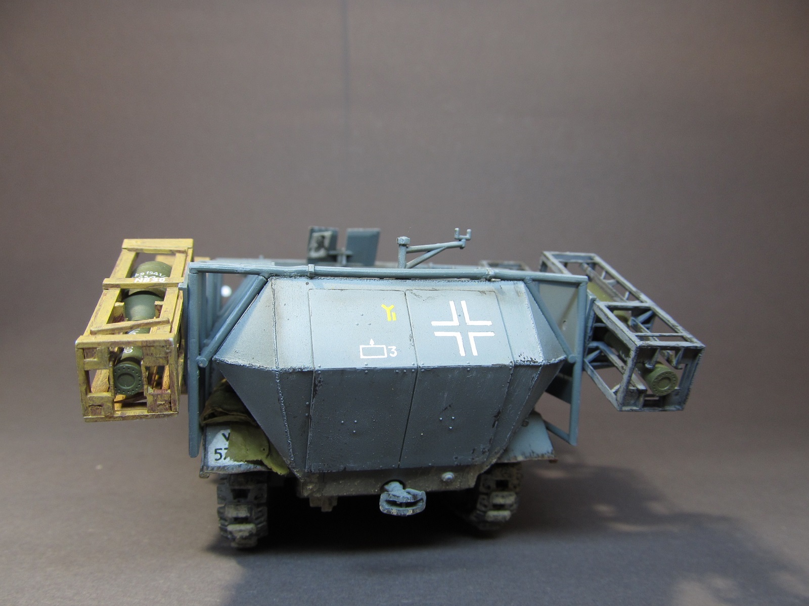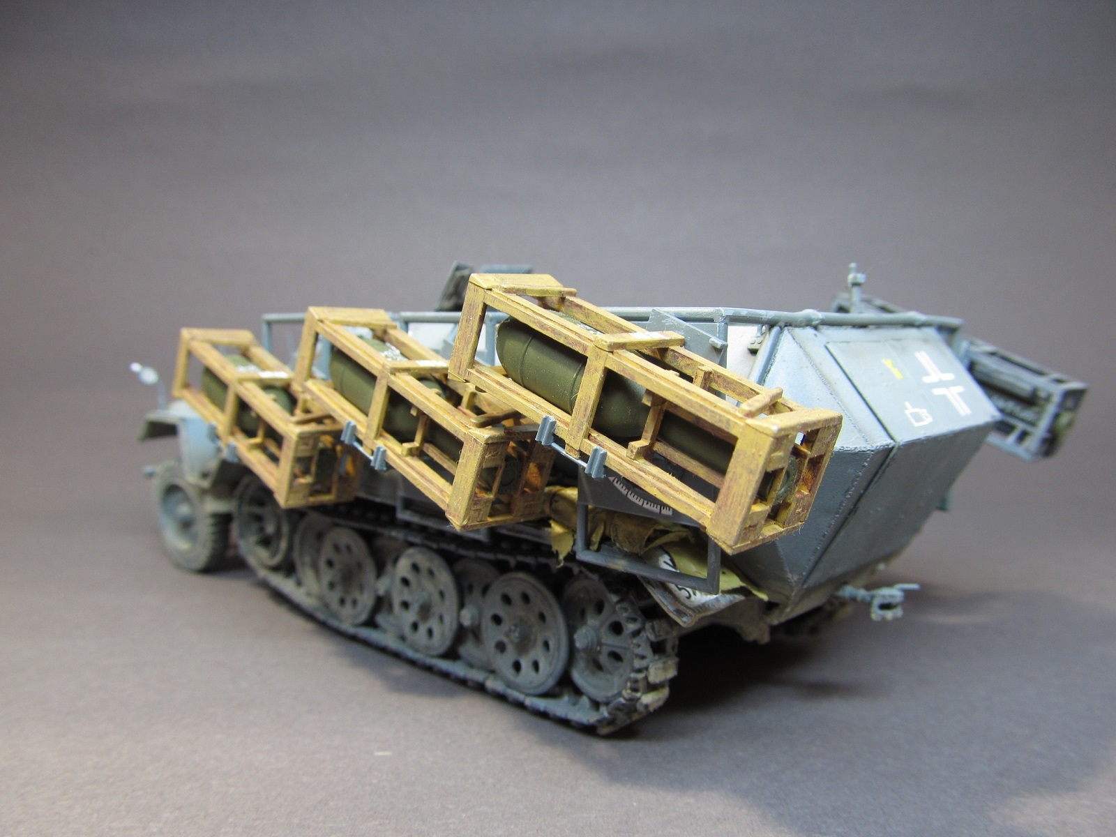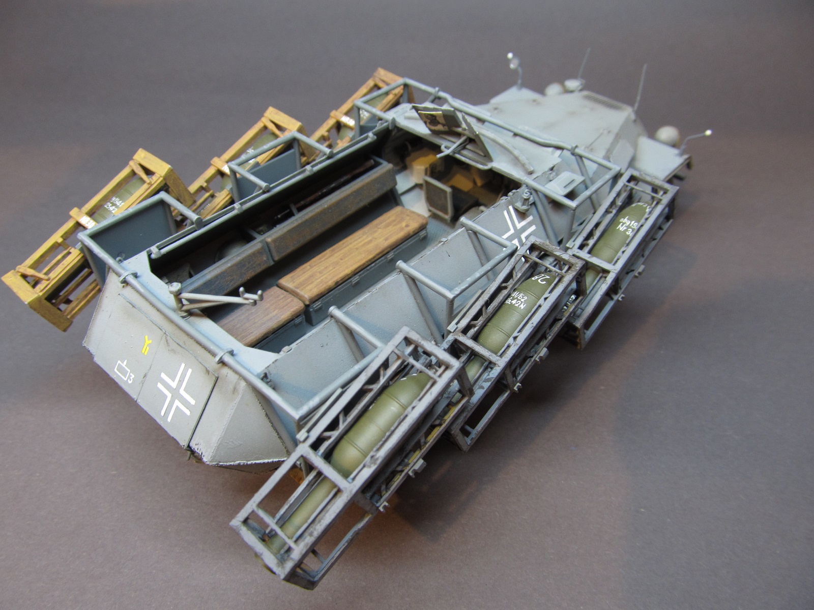 Машина в таком снаряжении-смотрится так как она и должна по-идее выглядеть.Единственное:-деревянные пусковые короба-смотрятся бледно.