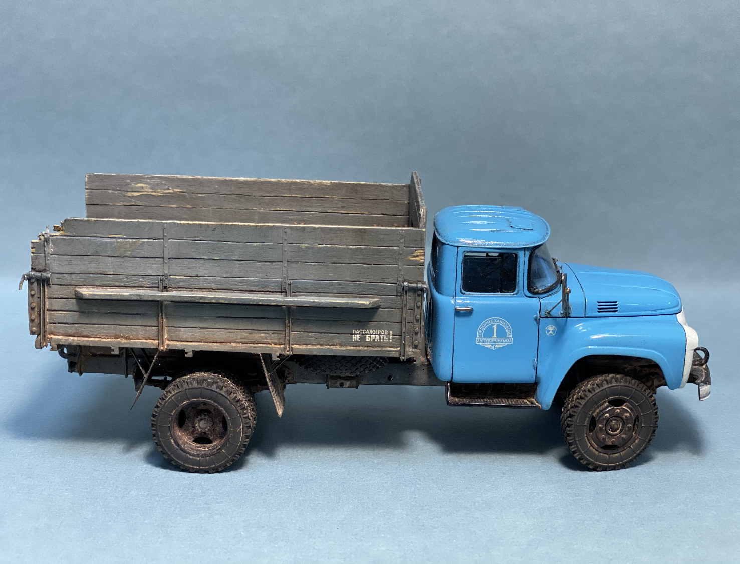 Есть мелкие неточности по матчасти, возможно, заинтересуют Вас?! У Вас ЗиЛ периода 1971-1973г выпуска (знак качества - с июня 1971г, отсутствие повторителей указателей поворота на крыльях - до января 1974г.) Вы установили зеркала увеличенного размера (150мм*300мм), такие зеркала стали устанавливать только с апреля 1974г, в таком случае должны быть поворотники на крыльях! До апреля 1974г на все модификации ЗиЛ-130 ставились маленькие зеркала (100мм*200мм), кроме модификации седельного тягача ЗиЛ-130В1, на нем большие зеркала ставились с самого начала их производства. Это было важной отличительной особенностью ЗиЛ-130В1! Вам желательно бы поменять местами зеркала на этих моделях.