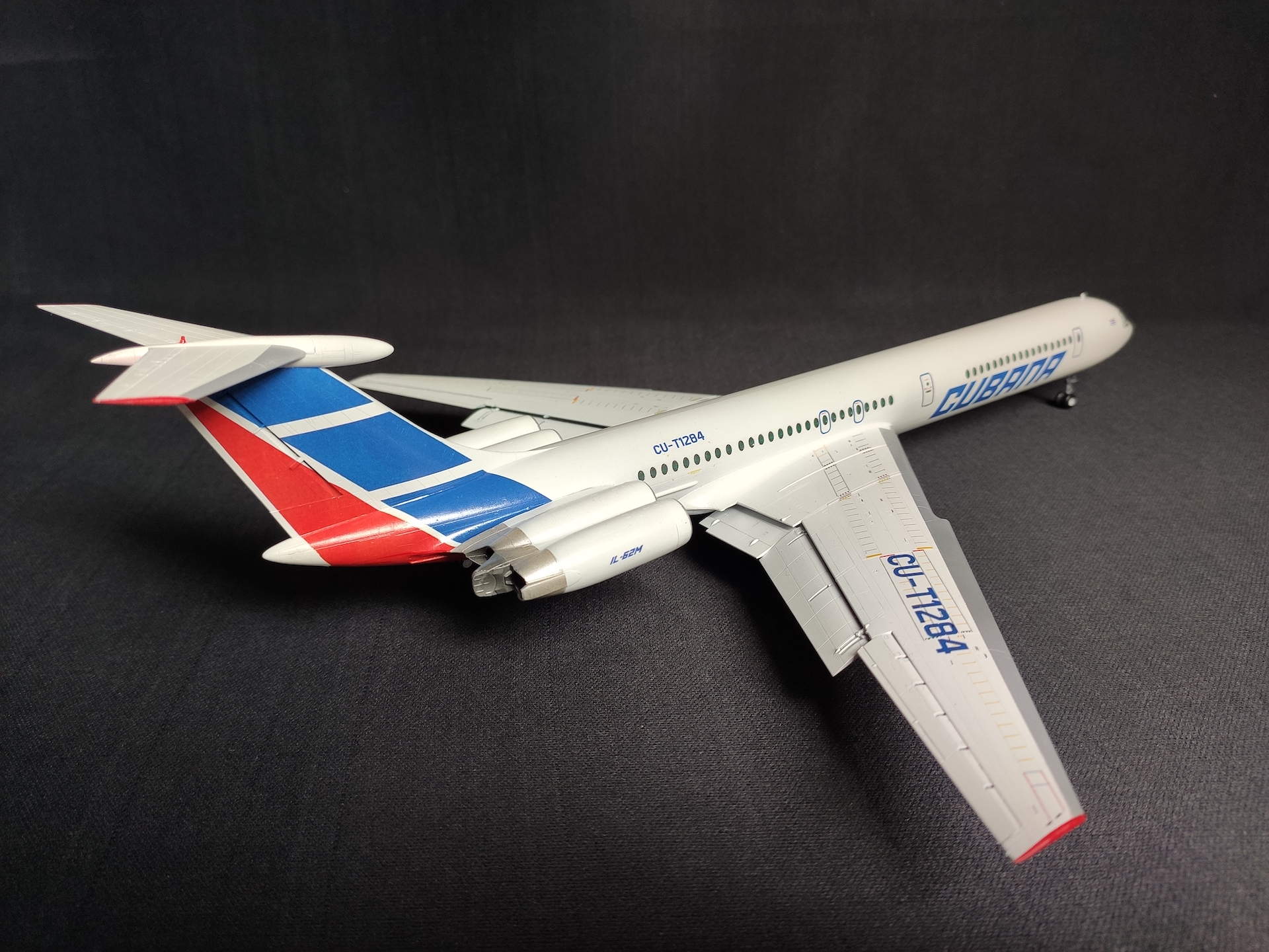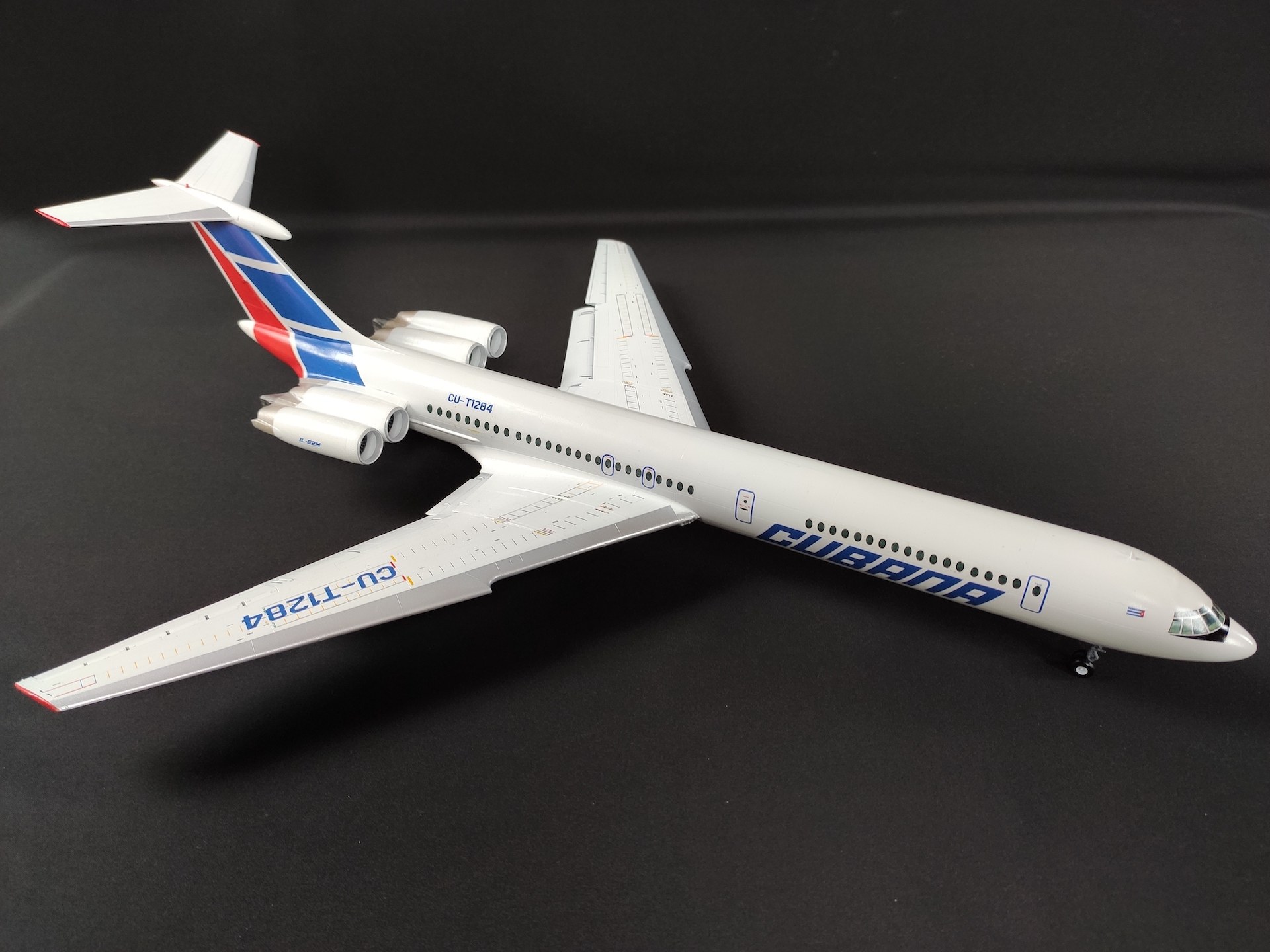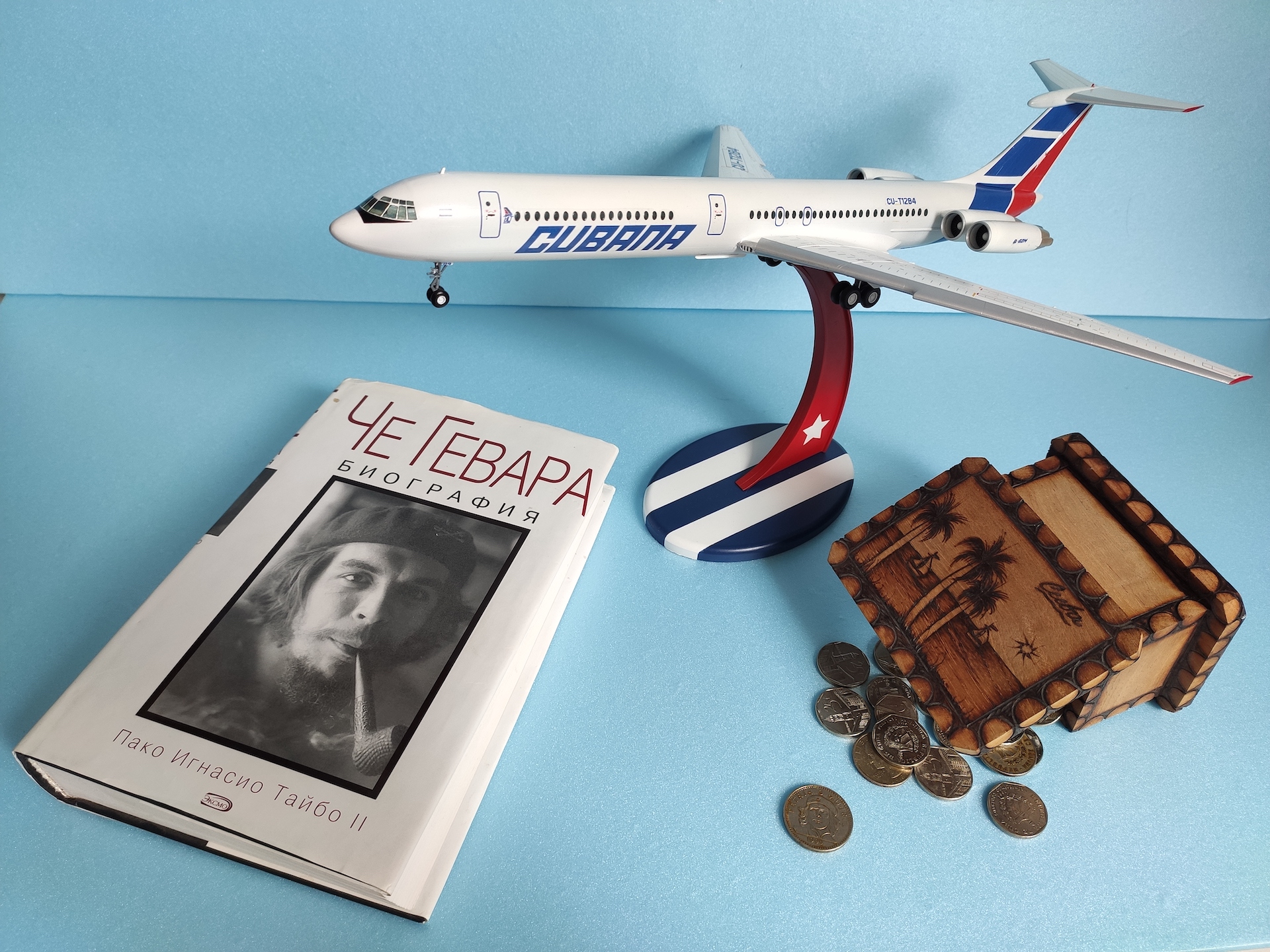 На КАРОПКЕ я зависаю уже много лет, но вот решил что пора и мне немного поделиться своими моделями. Начну с гражданского борта ИЛ-62М, который совсем недавно закончил. Каропка от Звезды, но решил что ливрея должна быть оригинальной. Выбор пал на борт CU-T1284 авиакомпании CUBANA. В свое время СССР поставил на Кубу порядка 10 бортов ИЛ-62. Побывав на Кубе 16 лет назад, один из этих бортов я сам видел в аэропорту Гаваны. Уже тогда этот красавец Советской инженерной мысли в красивой ливрее запал мне в душу. Делал его с удовольствием. Кто был на Кубе меня поймет - это любовь на всю жизнь! Помимо самой модели в голову пришла идея сделать оригинальную окраску подставки - в виде кубинского флага.