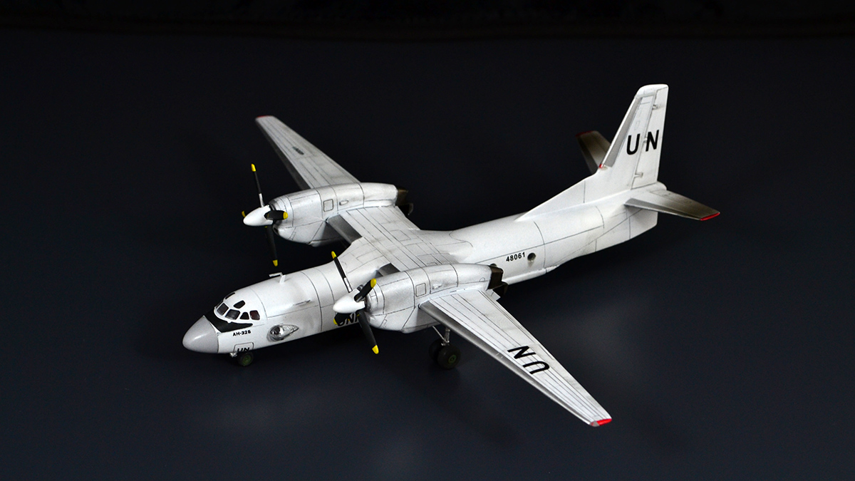 Маркировка конечно у этого борта не вся, но это на совести производителя. А вот стабилизаторы у Ан-32 черные,- даже у ООНовского. Ну и носовой обтекатель, цвет другой.