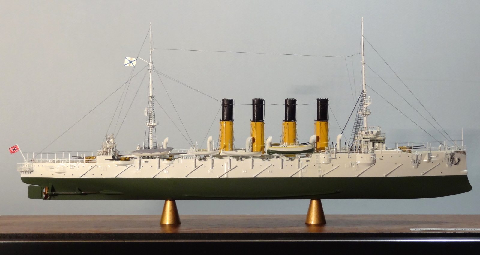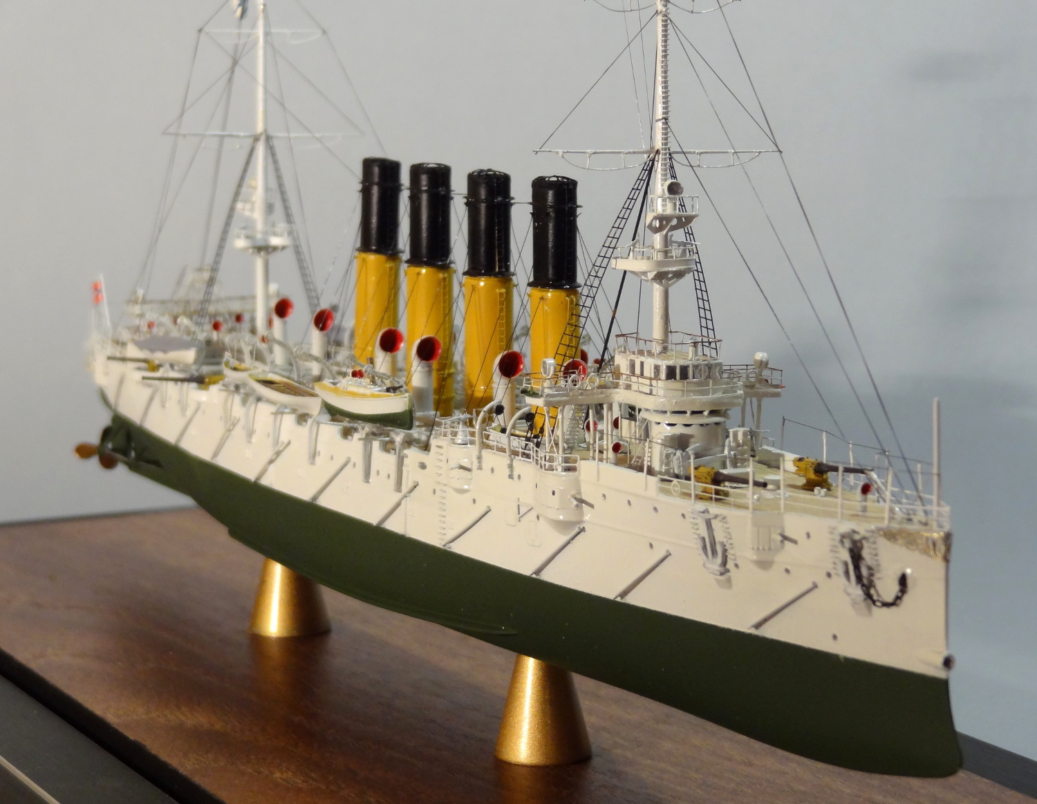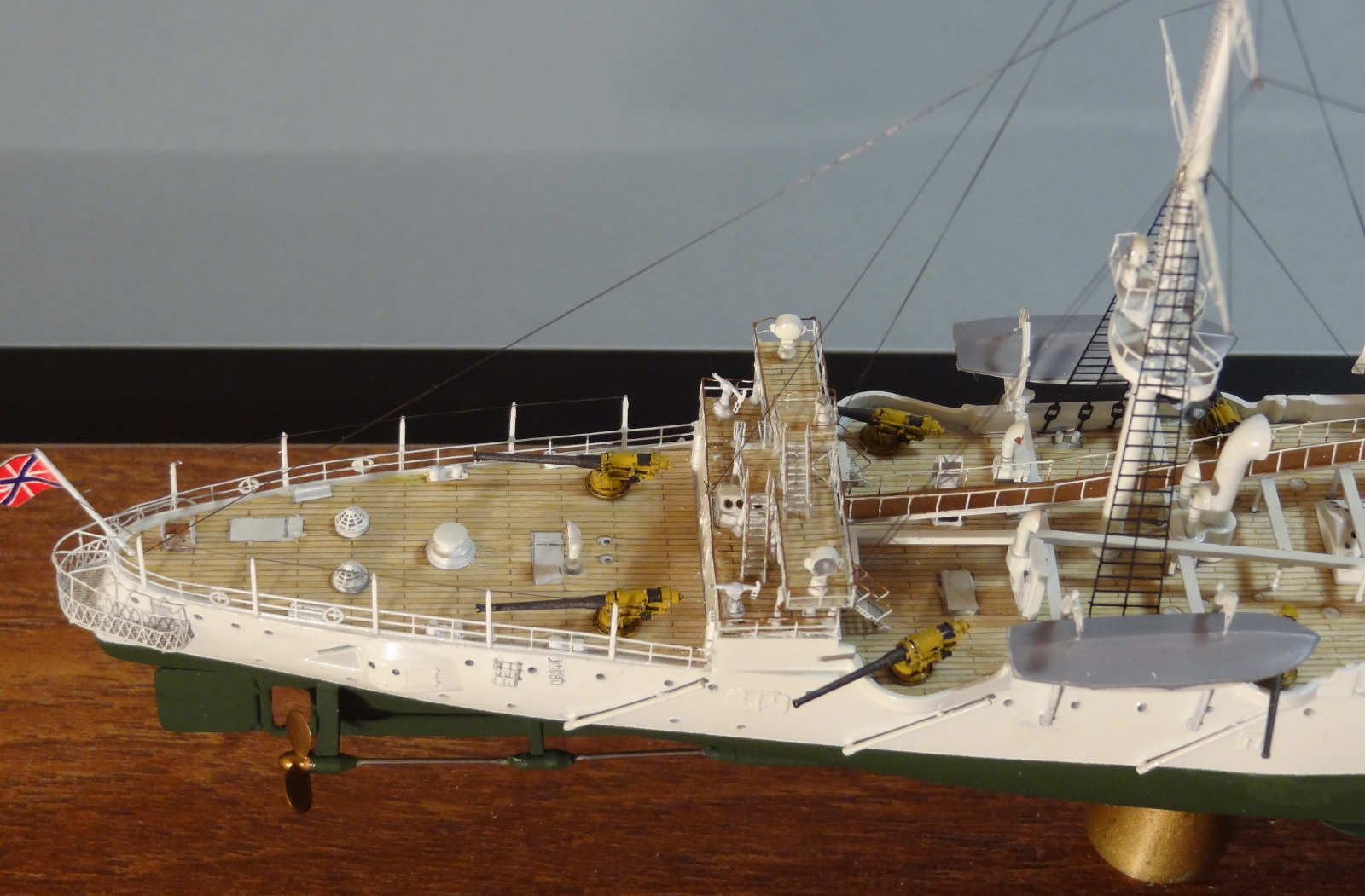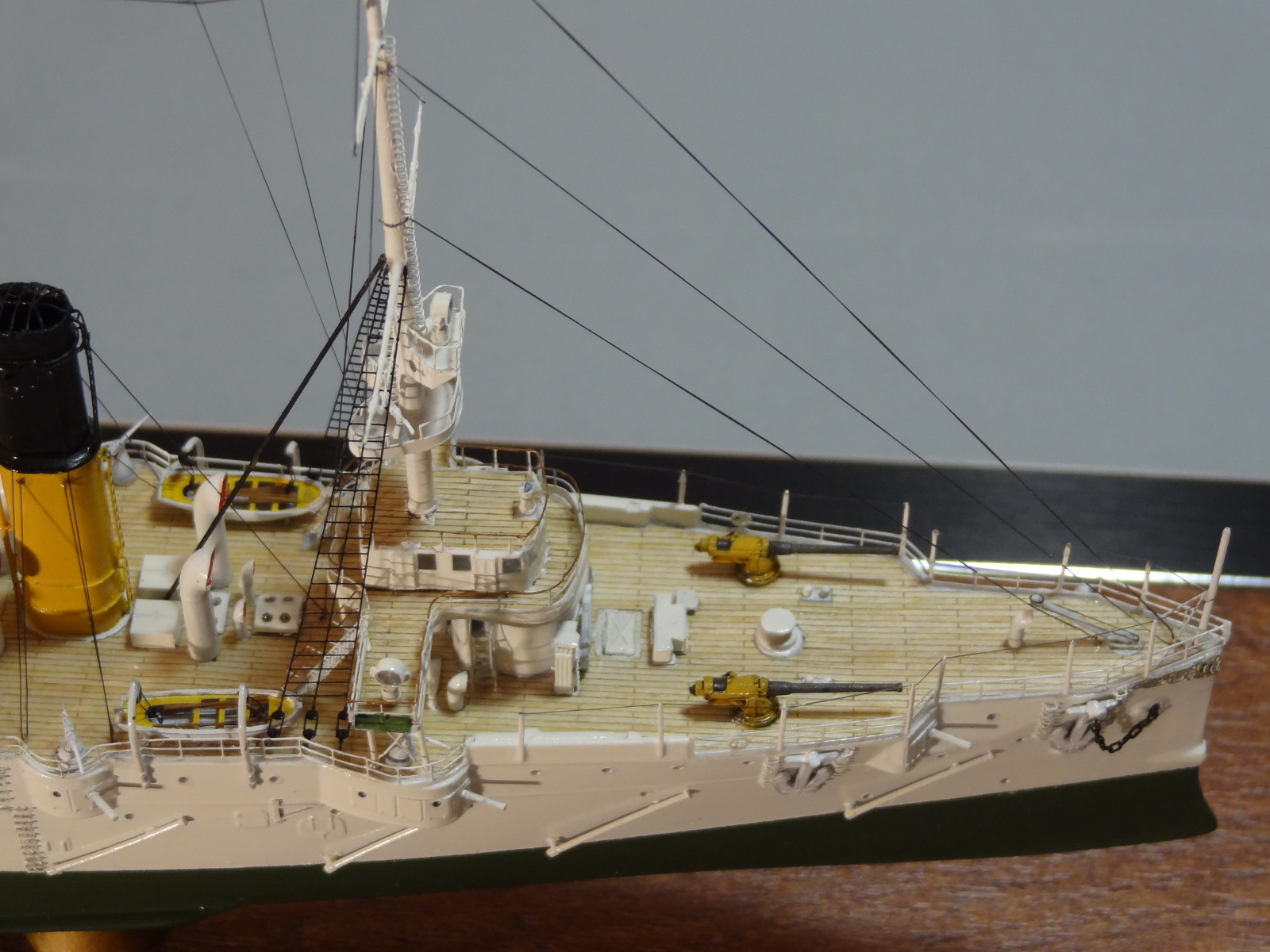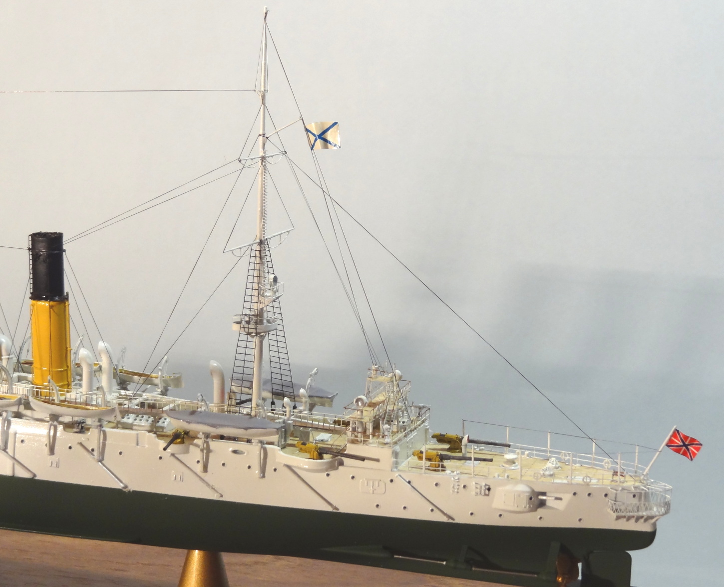 По матчасти есть пара вопросов, типа цвета казематных орудий, дефлекторов и внутренности лодок. Дефлекторы на всех фото прототипа четко в цвет нижней половины труб. Гюйс перевесить бы на положенное место. Футропы покрасить в цвет остального такелажа. Но качества исполнения это нисколько не отменяет.